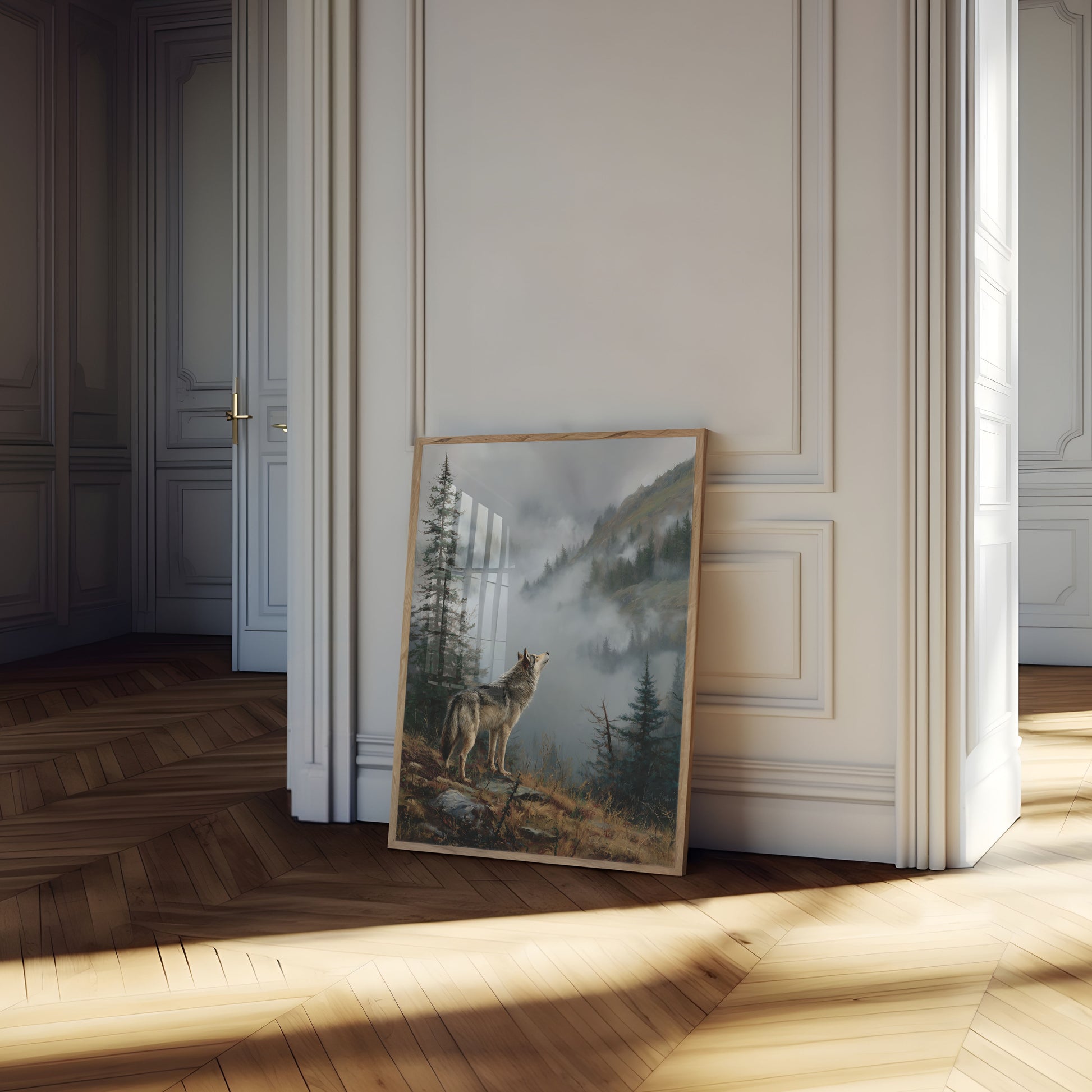 A lone wolf stands majestically on a rocky outcrop, gazing into the ethereal mists of a dense forest landscape. Soft gray tones and swirling fog envelop towering evergreen trees and rugged mountain slopes, creating a hauntingly beautiful scene of wilderness and solitude. The wolf's silhouette captures the wild spirit of nature, embodying strength, mystery, and untamed freedom.