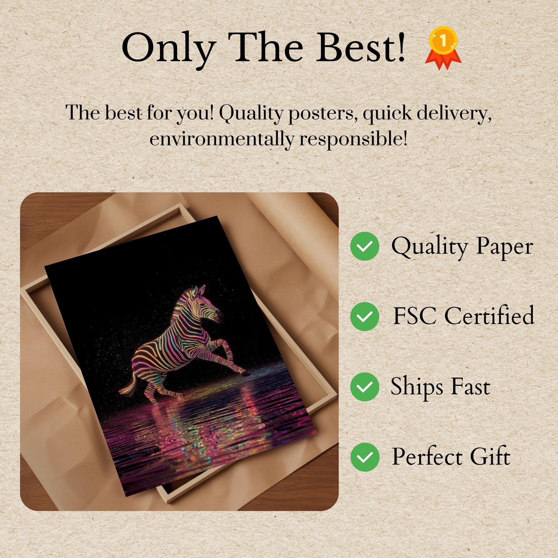 Step into a mesmerizing world where a radiant zebra leaps through a starlit realm, its stripes transformed into vibrant streams of electric color. Each luminous line pulses with energy, creating a dynamic symphony of pink, yellow, teal, and purple against a deep midnight background. The zebra's reflection dances on a shimmering water surface, blending reality with an ethereal digital dreamscape.
