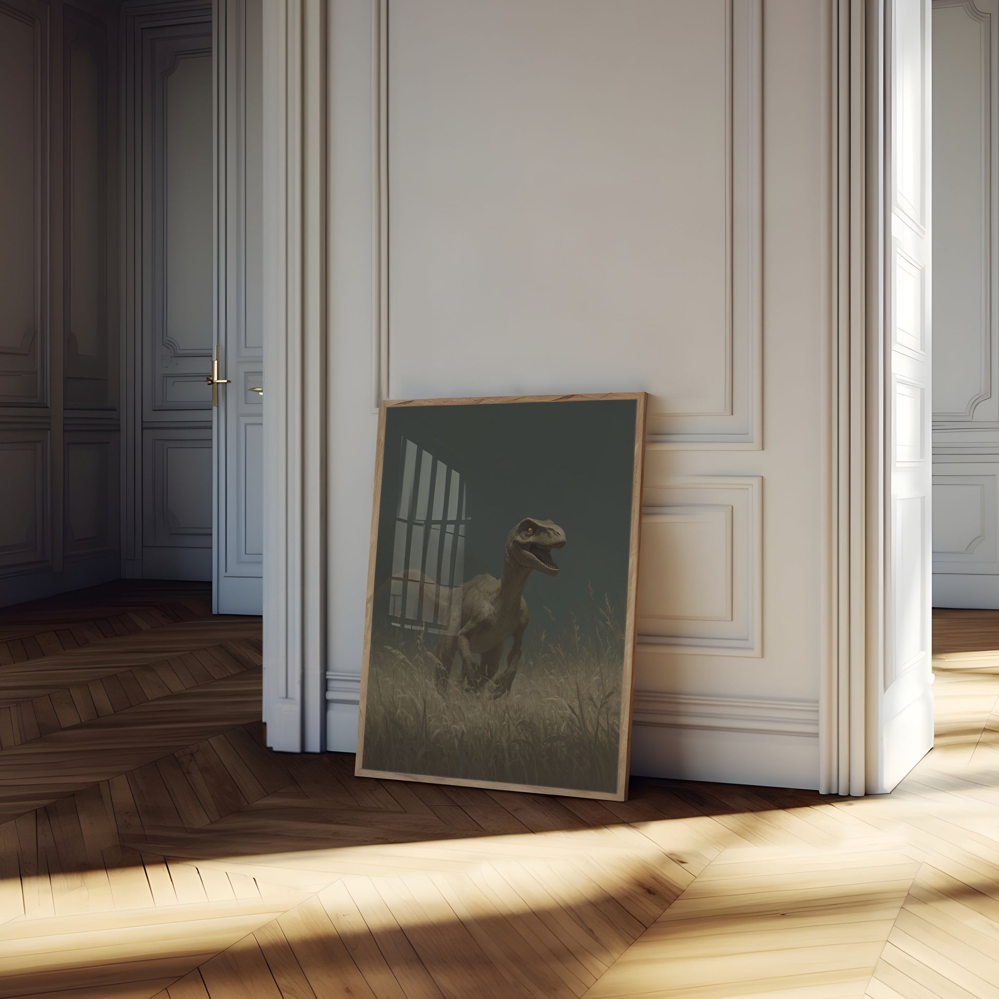 Immerse yourself in the intense world of a hunting velociraptor, poised dramatically amidst tall golden grasses under a dark, moody sky. This hauntingly realistic dinosaur artwork captures the raw predatory essence of one of nature's most fascinating prehistoric hunters, with its muscular form and piercing gaze creating a sense of imminent movement and primal energy. The muted earth tones and atmospheric backdrop bring this ancient creature to life with stunning, lifelike detail.