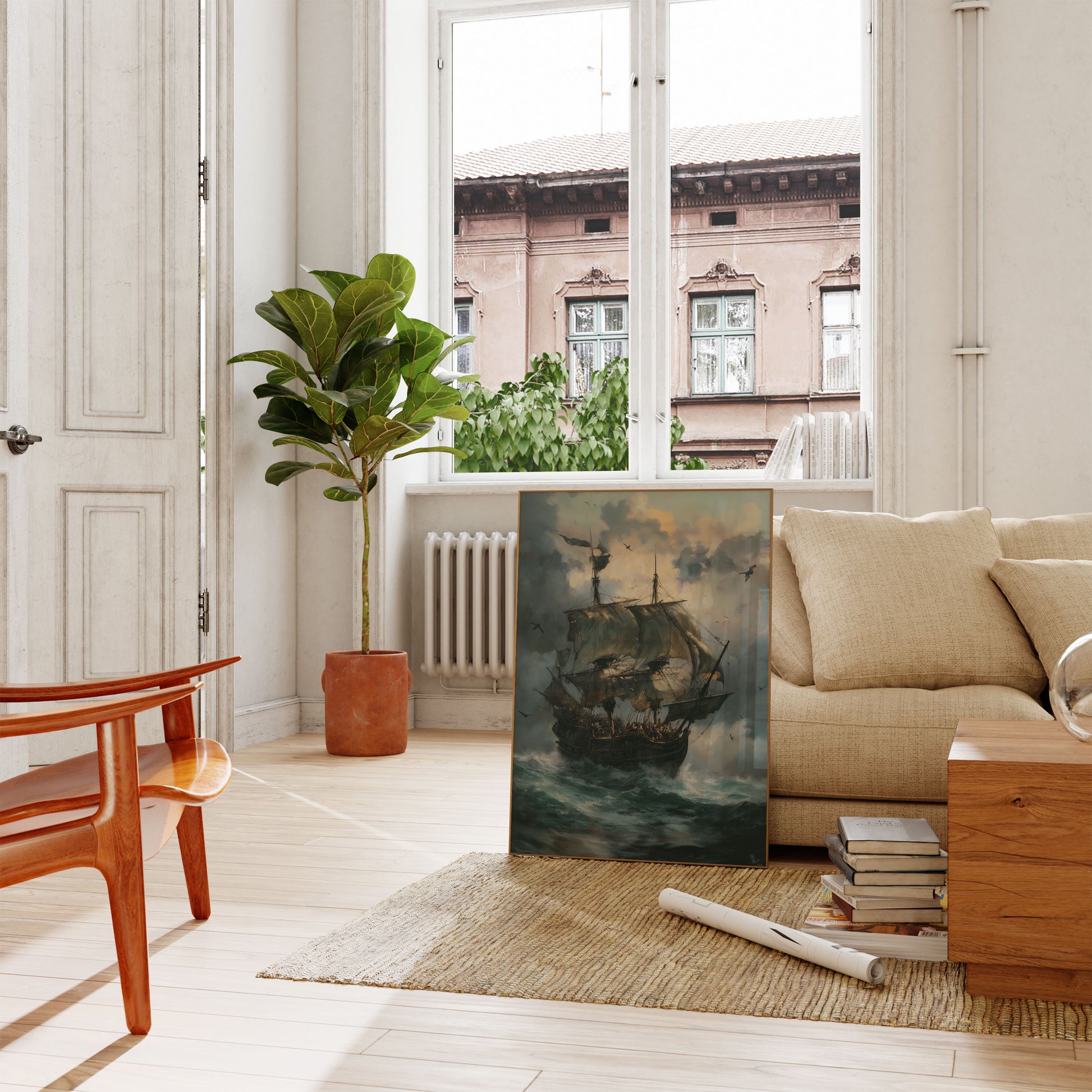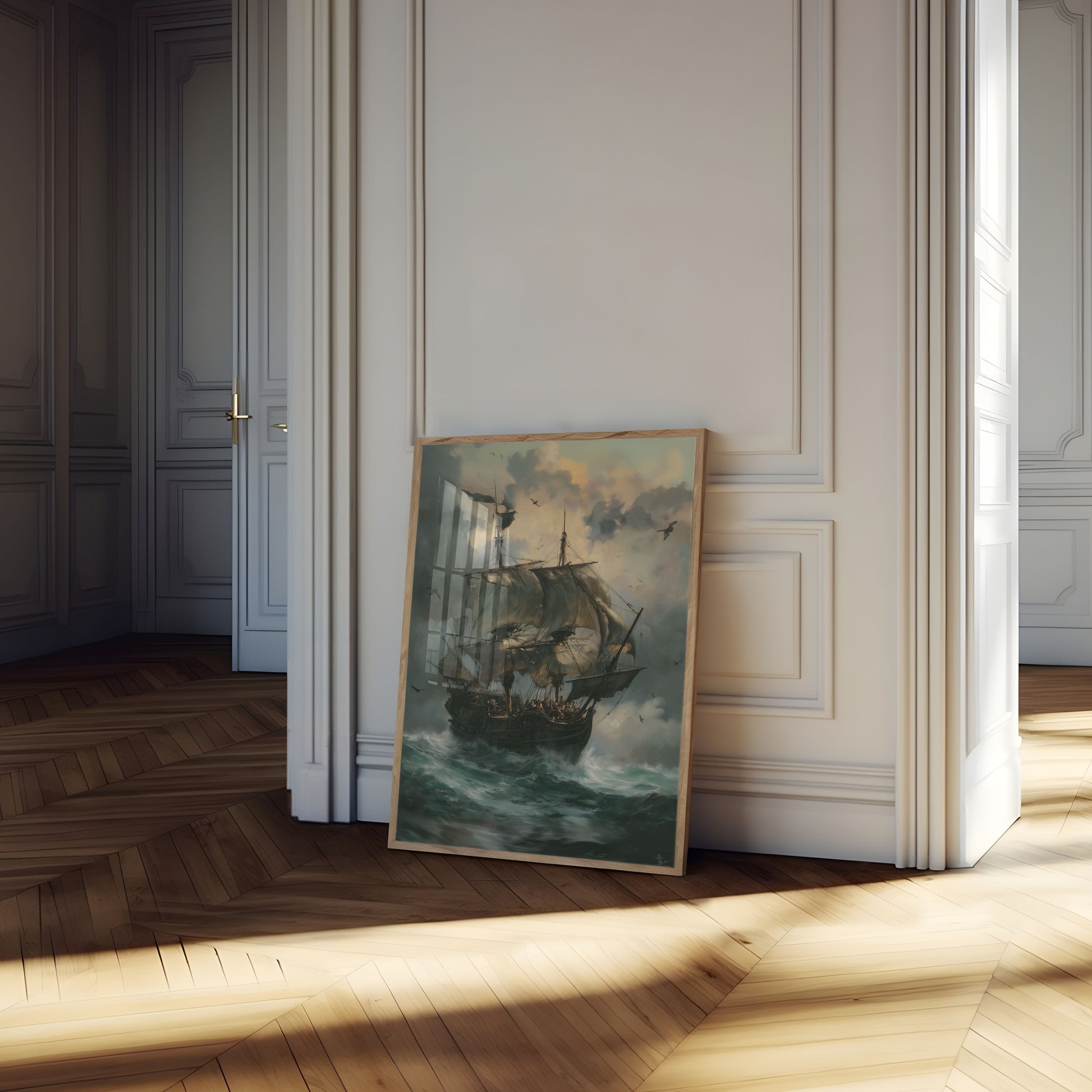 Immerse yourself in the raw power of the high seas with this breathtaking maritime artwork. A majestic sailing vessel battles turbulent waves and dramatic cloudy skies, its tattered sails billowing against the moody, tempestuous background. The intricate details of the ship and the dynamic seascape capture the wild spirit of maritime adventure, inviting viewers to feel the ocean's untamed energy.