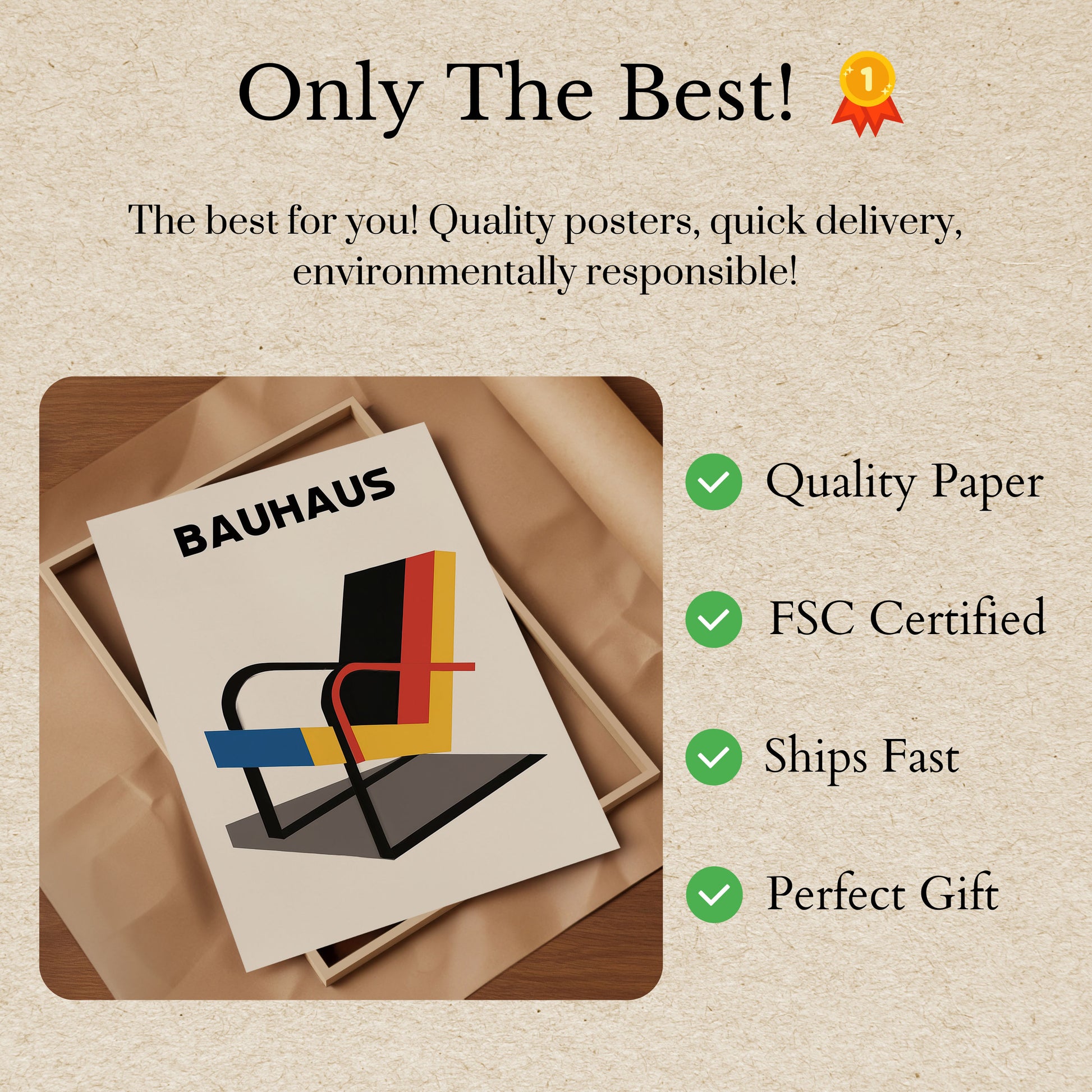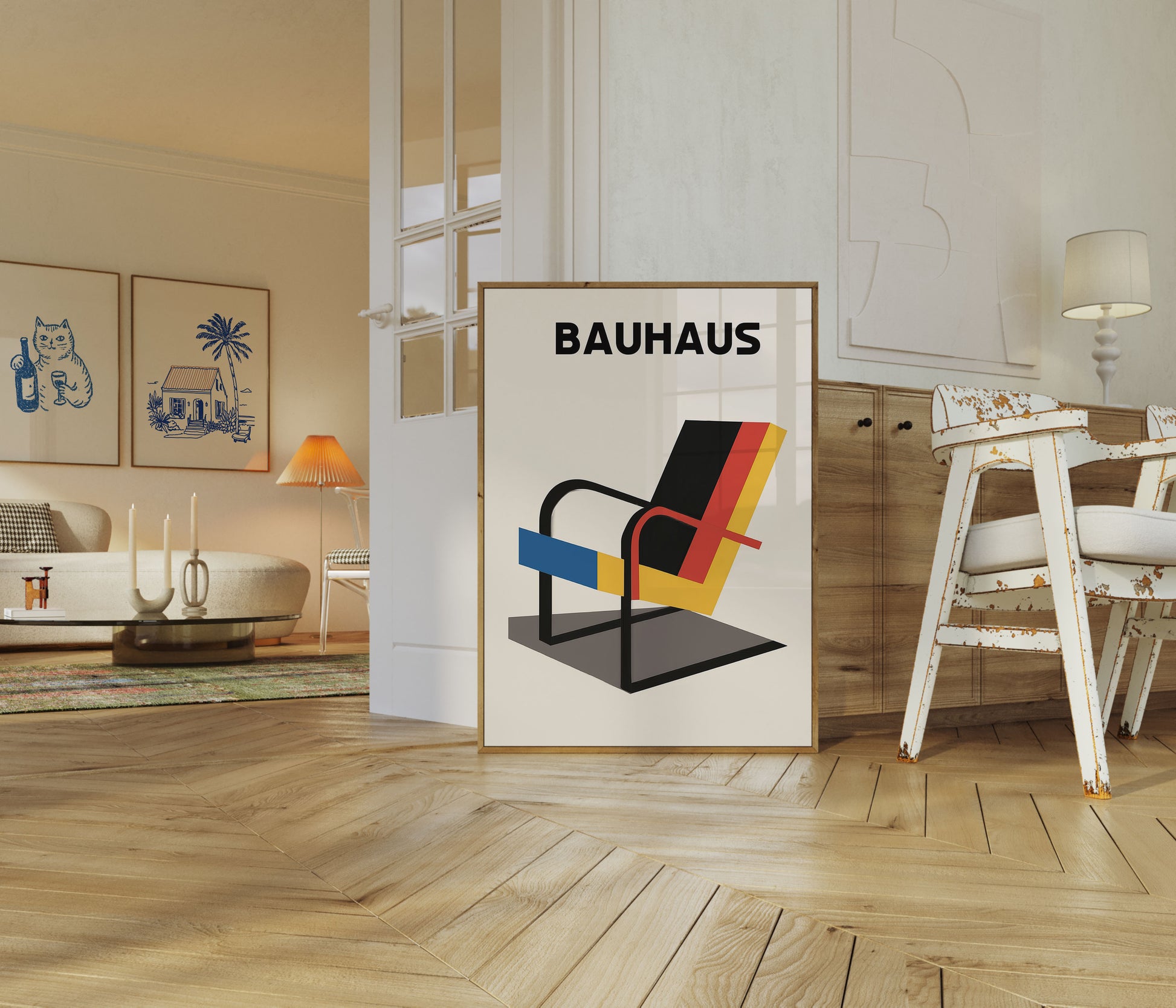 Dive into the iconic world of Bauhaus design with this striking minimalist chair poster. Bold primary colors of blue, red, and yellow intersect with sleek black lines, creating a dynamic geometric composition that captures the revolutionary spirit of the Bauhaus movement. This poster celebrates the marriage of form and function, bringing a piece of modernist design history to your space.