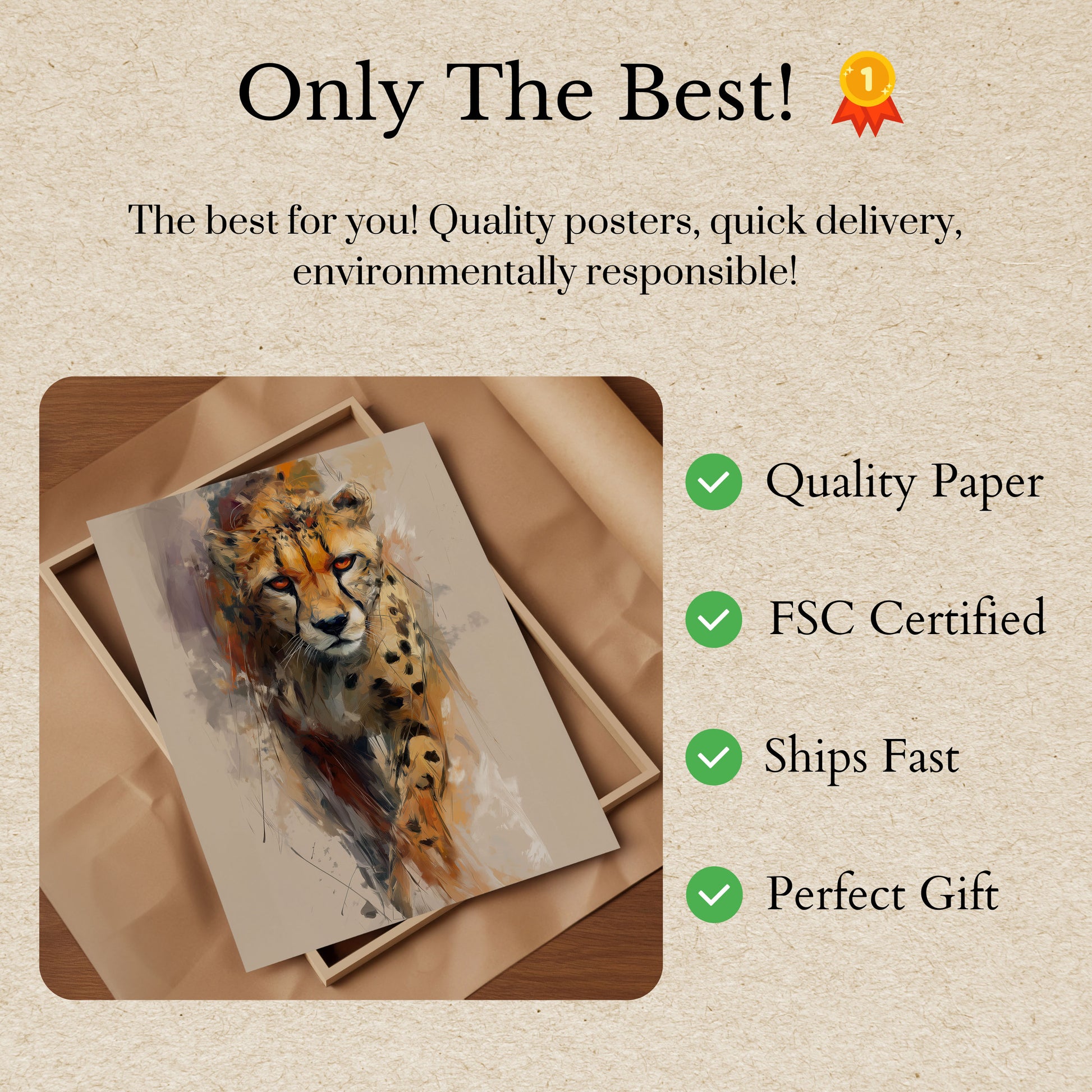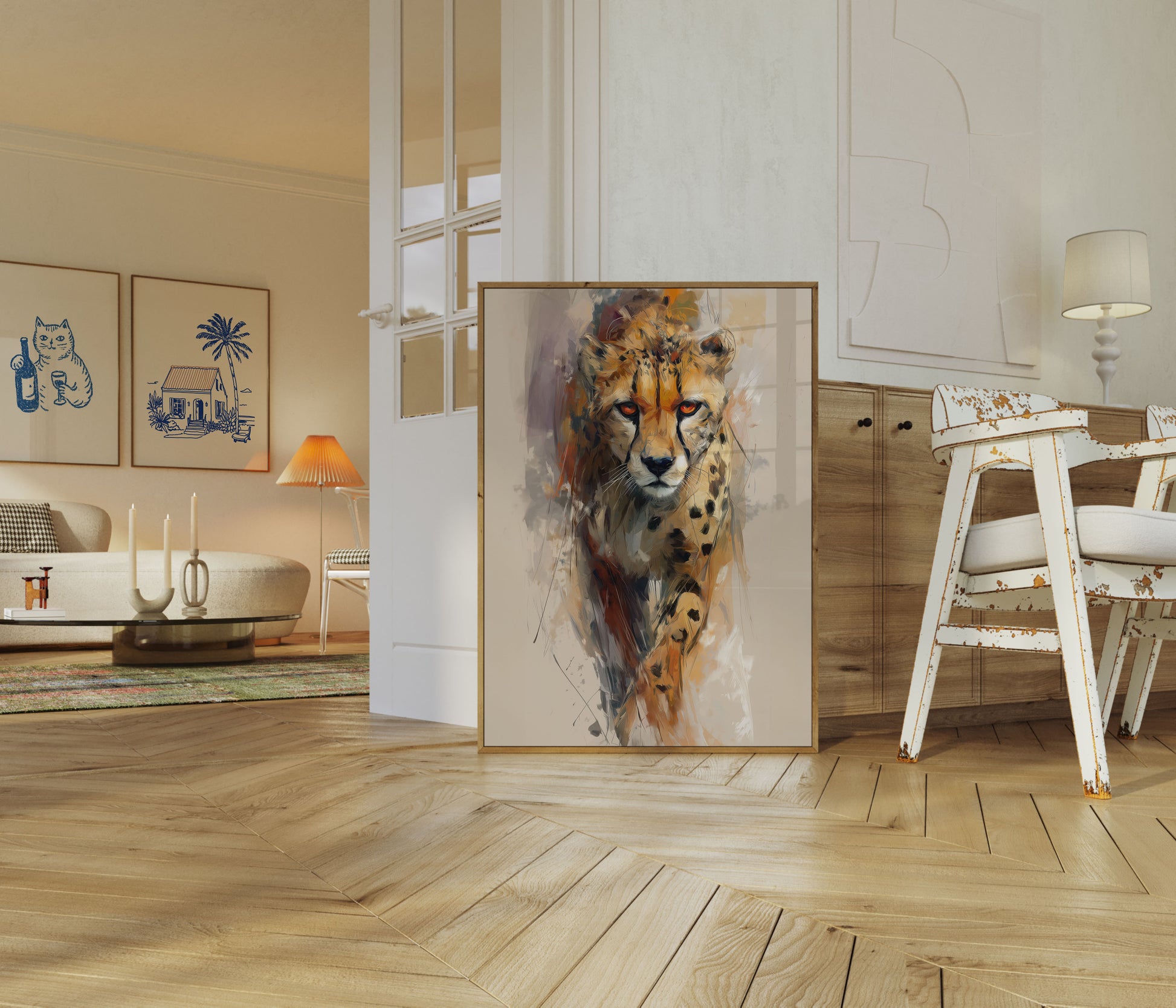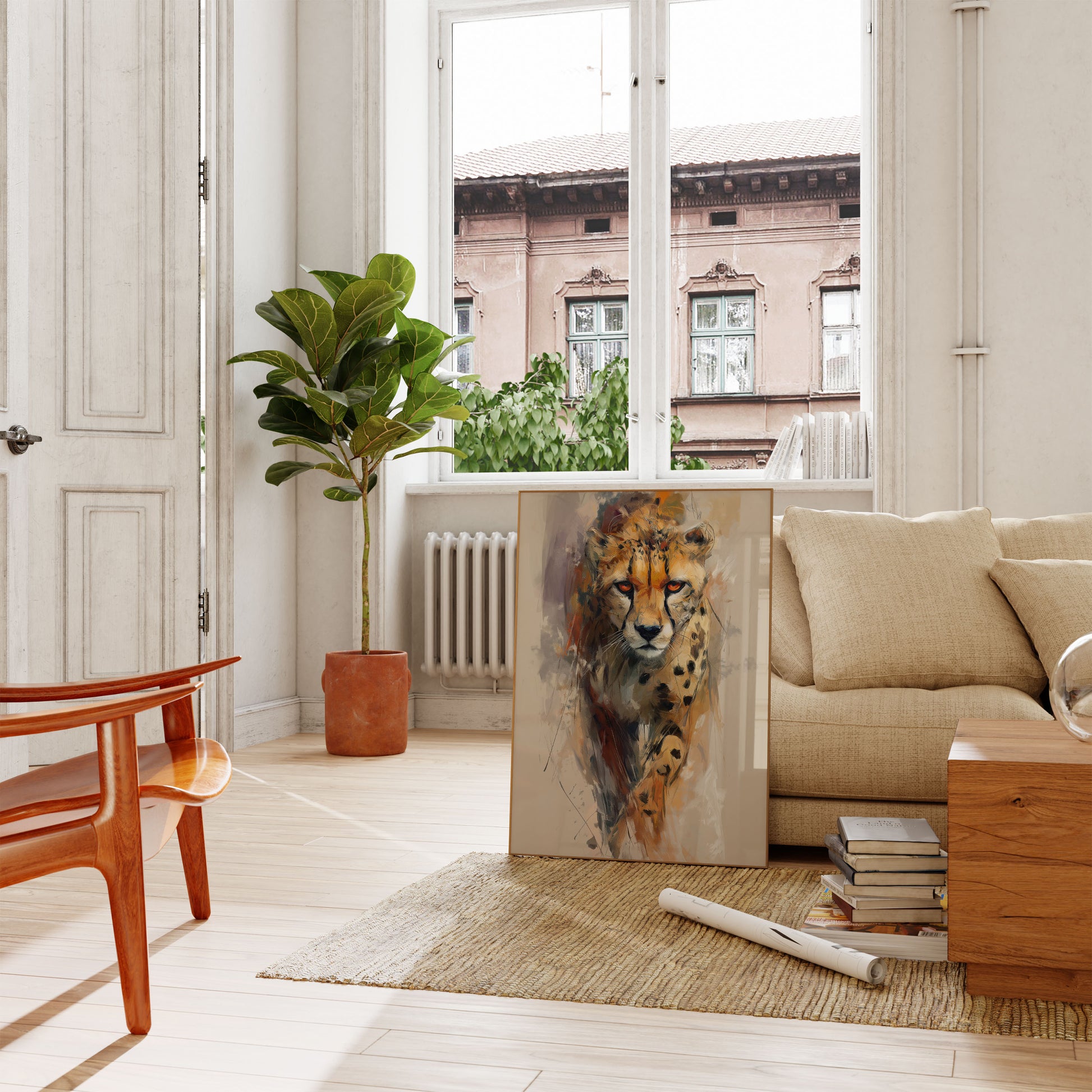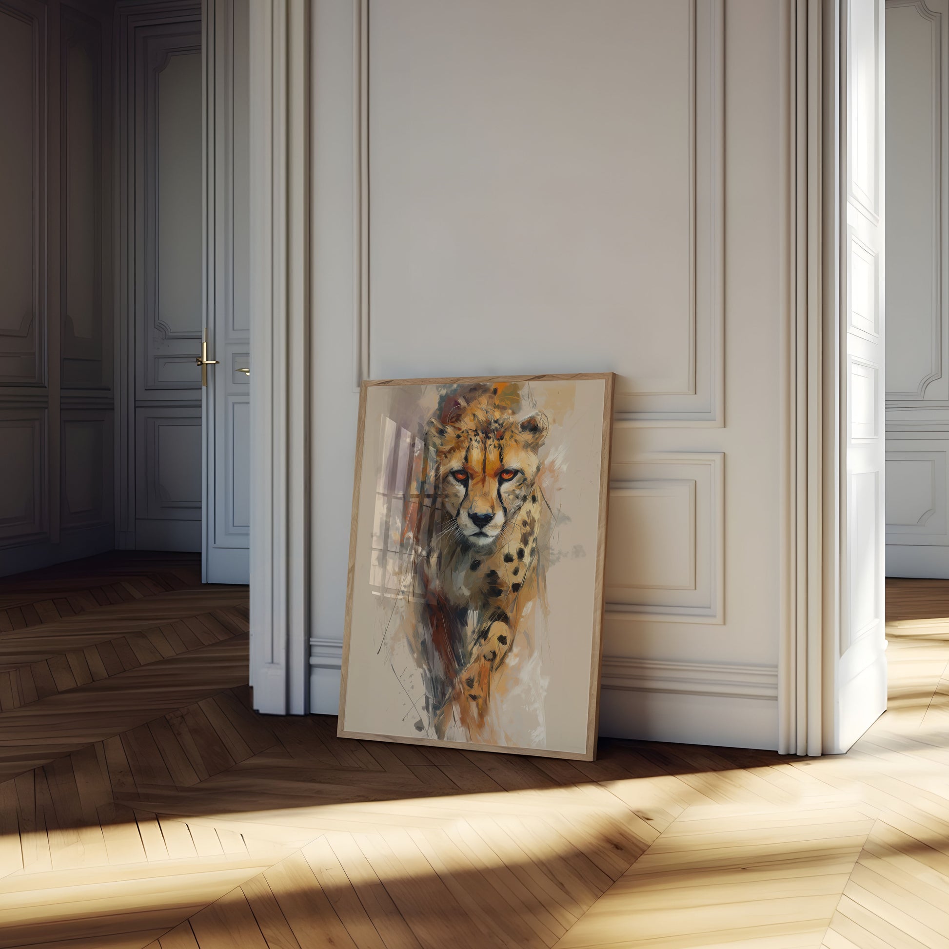 Experience the raw intensity of this stunning cheetah art, where vibrant orange and amber tones blend seamlessly with abstract brushstrokes. The piercing gaze captures the spirit of the wild, with each stroke revealing the power and grace of this magnificent creature. This artistic rendering transforms the cheetah into a dynamic, almost ethereal masterpiece that commands attention and sparks imagination.