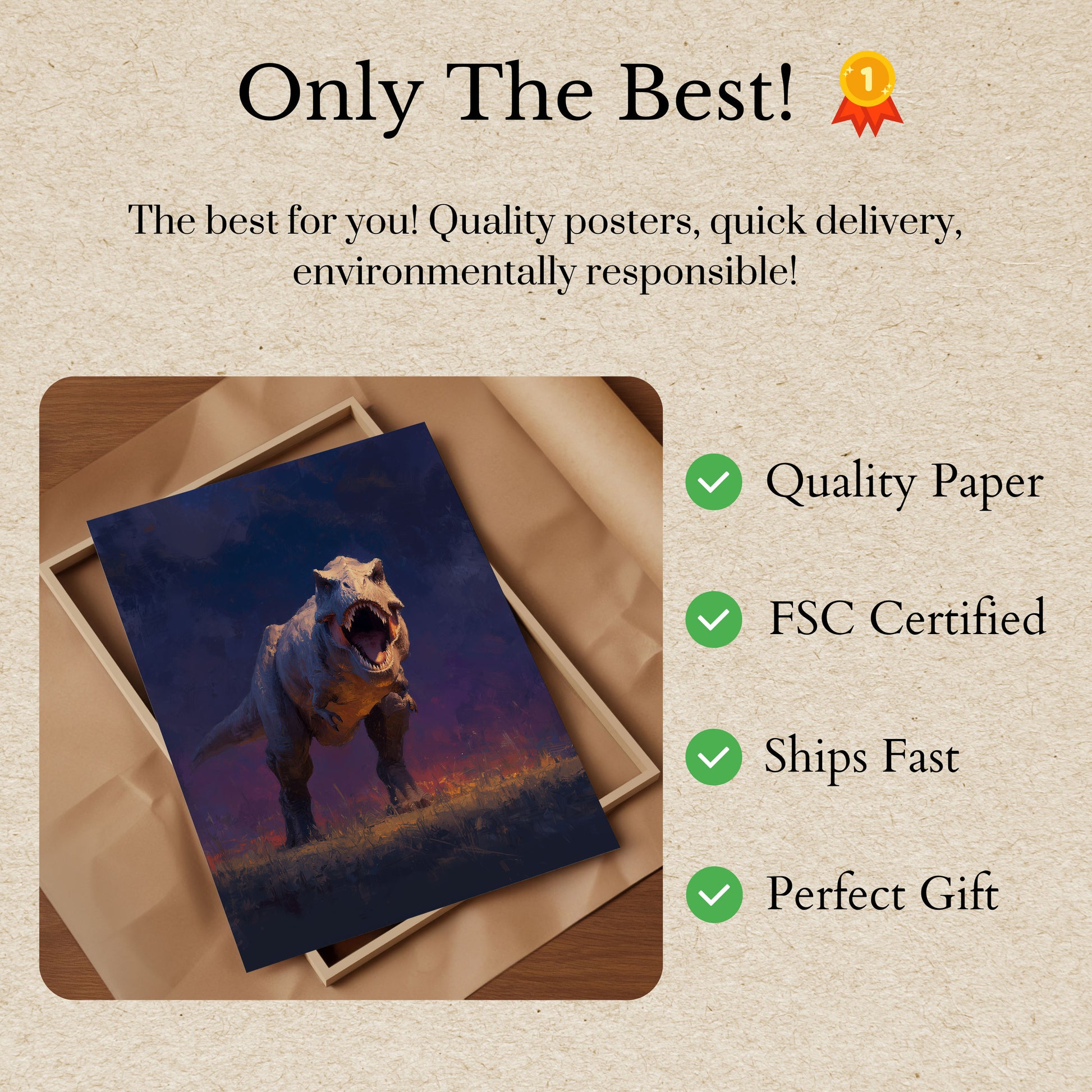 Immerse yourself in the raw power and primal intensity of this stunning T-Rex artwork. Set against a dramatic dark blue and purple twilight backdrop, the massive dinosaur stands illuminated with golden highlights, its massive jaws open in a thunderous roar. The image captures the prehistoric predator's fierce energy, with fiery orange grass at its feet and a moody, atmospheric background that brings this ancient creature to dramatic life.