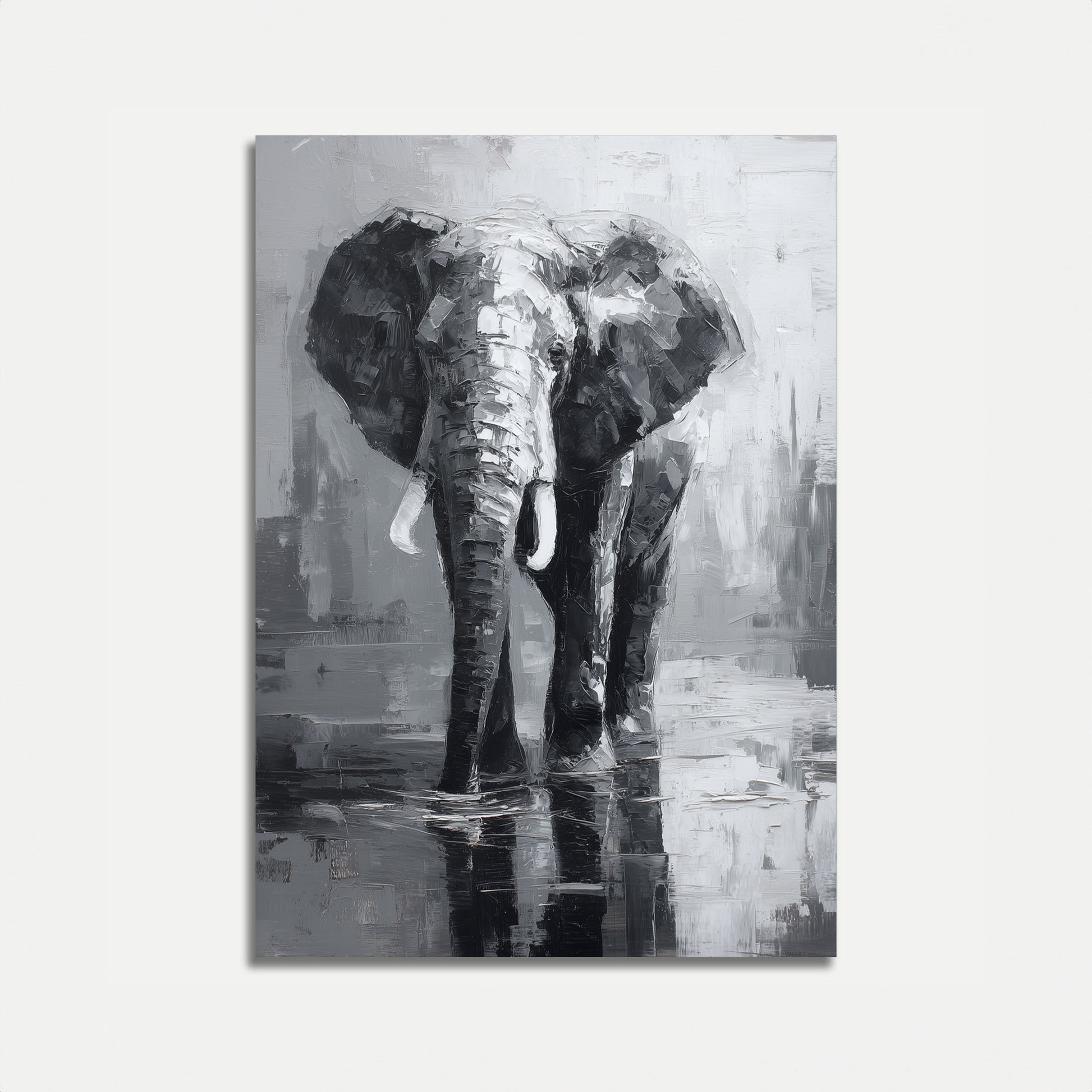 A stunning black and white artistic rendering of an elephant, captured in a mesmerizing palette of grays and whites. The textured oil painting technique brings incredible depth and emotion to this powerful creature, standing in reflective waters with remarkable detail and raw intensity. Each brushstroke reveals the elephant's strength and vulnerability in this captivating monochromatic masterpiece.