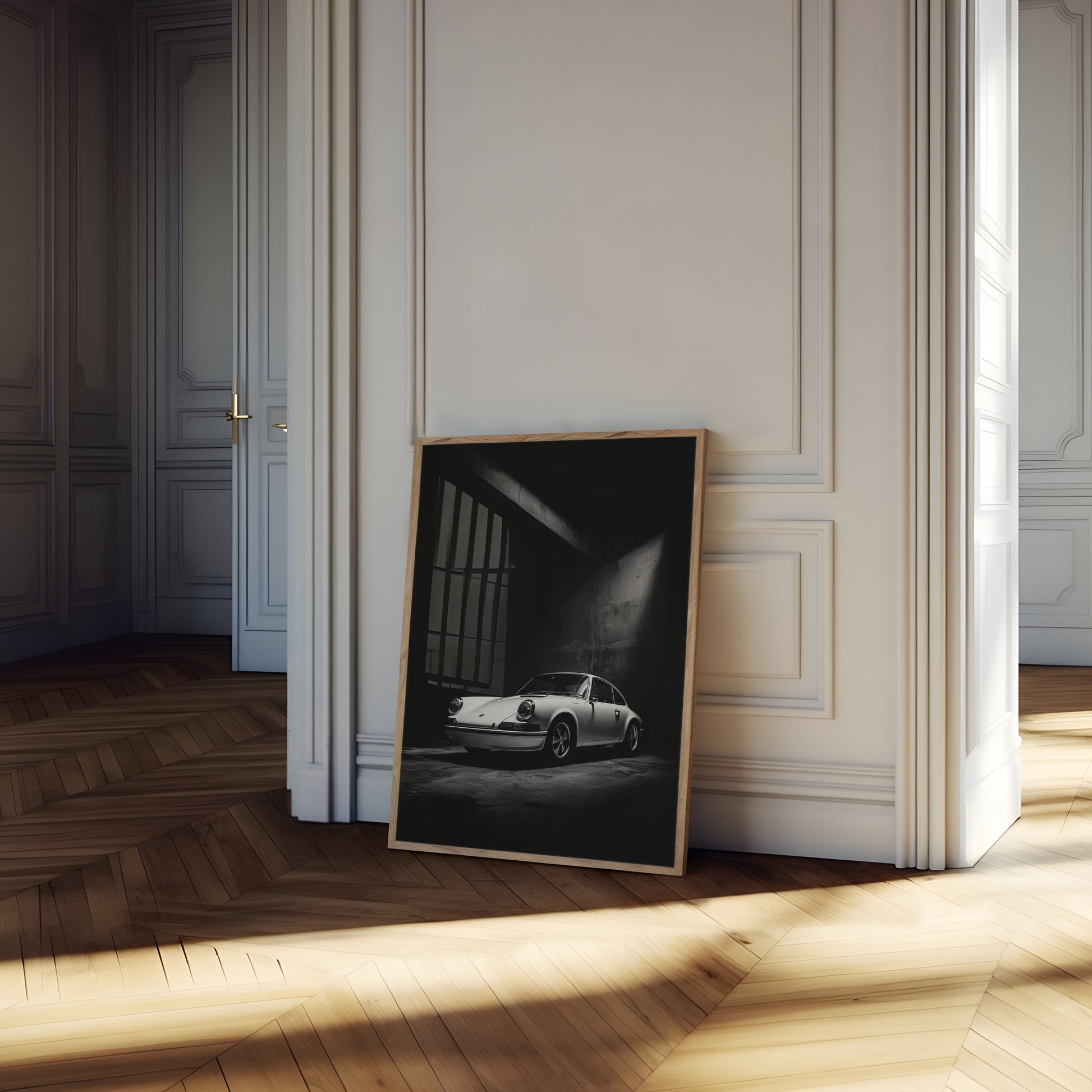 Immerse yourself in the dramatic world of automotive elegance with this stunning black and white Porsche portrait. Captured in a moody concrete setting, the iconic sports car emerges from darkness, illuminated by a single shaft of light that dramatically highlights its legendary curves and timeless design. This poster transforms a classic vehicle into a breathtaking work of art that will elevate any space with its noir-inspired aesthetic.