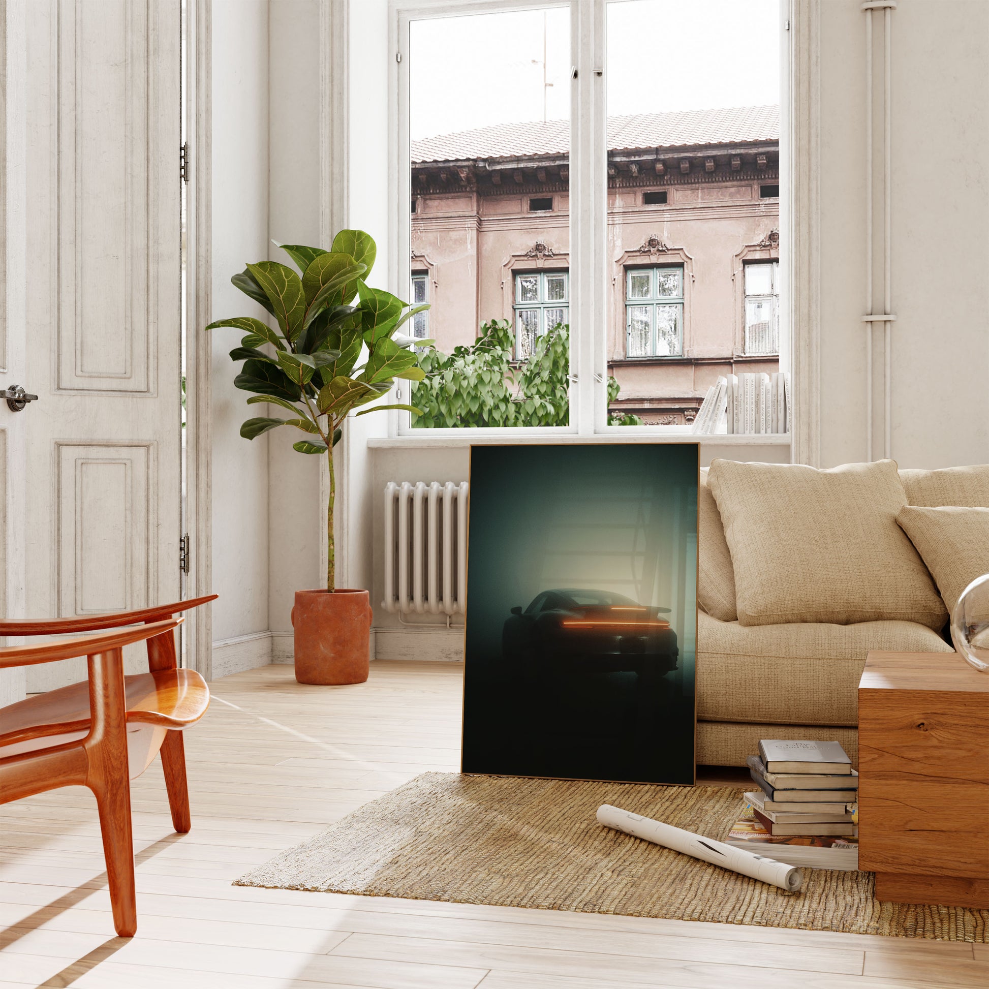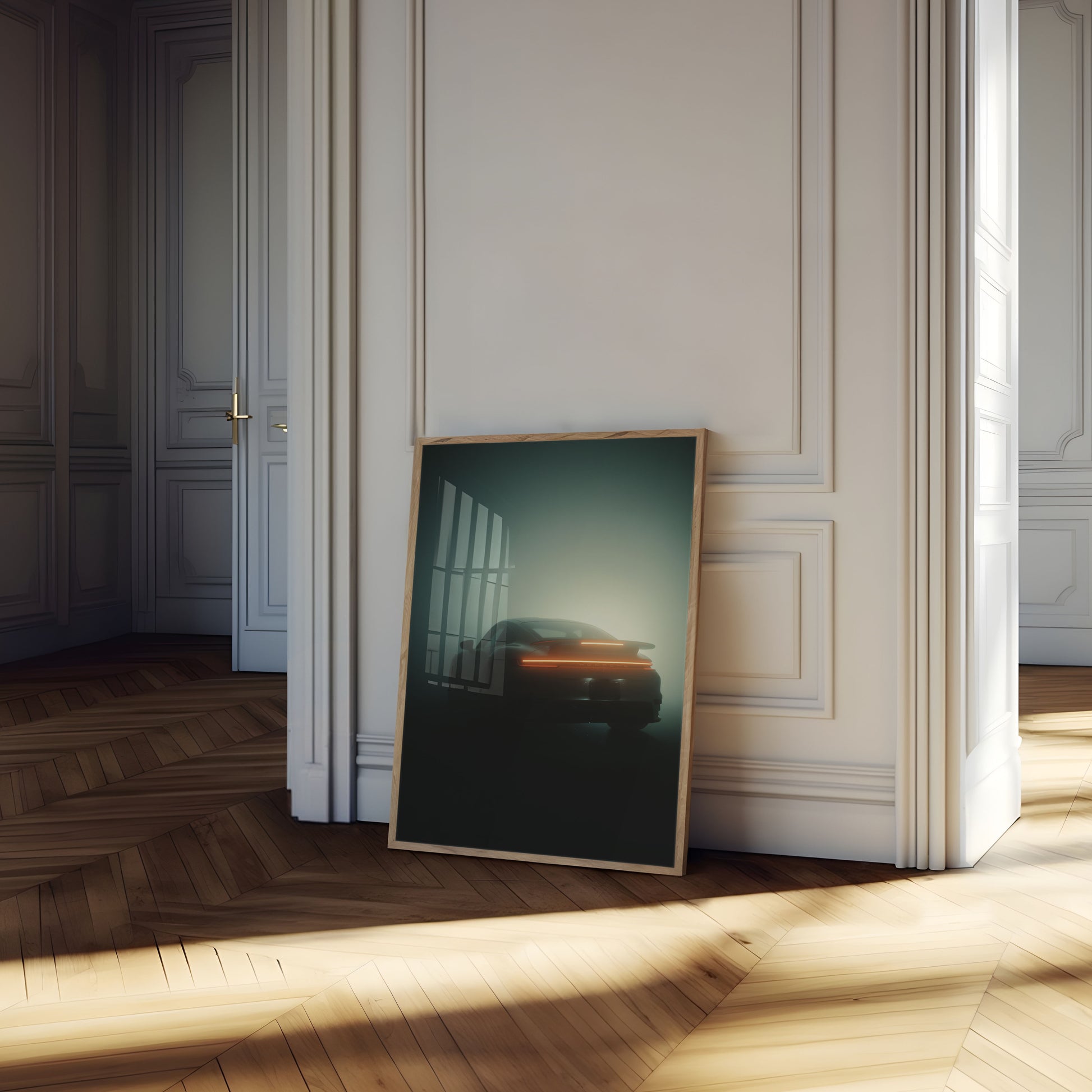 Emerging from the ethereal fog, this Porsche sports car captivates with its sleek silhouette and dramatic lighting. Glowing orange lines slice through the muted teal background, creating a mysterious and powerful automotive portrait that hints at speed, innovation, and refined engineering. The moody atmospheric effect transforms this vehicle into an almost mythical machine, suspended between shadow and light.