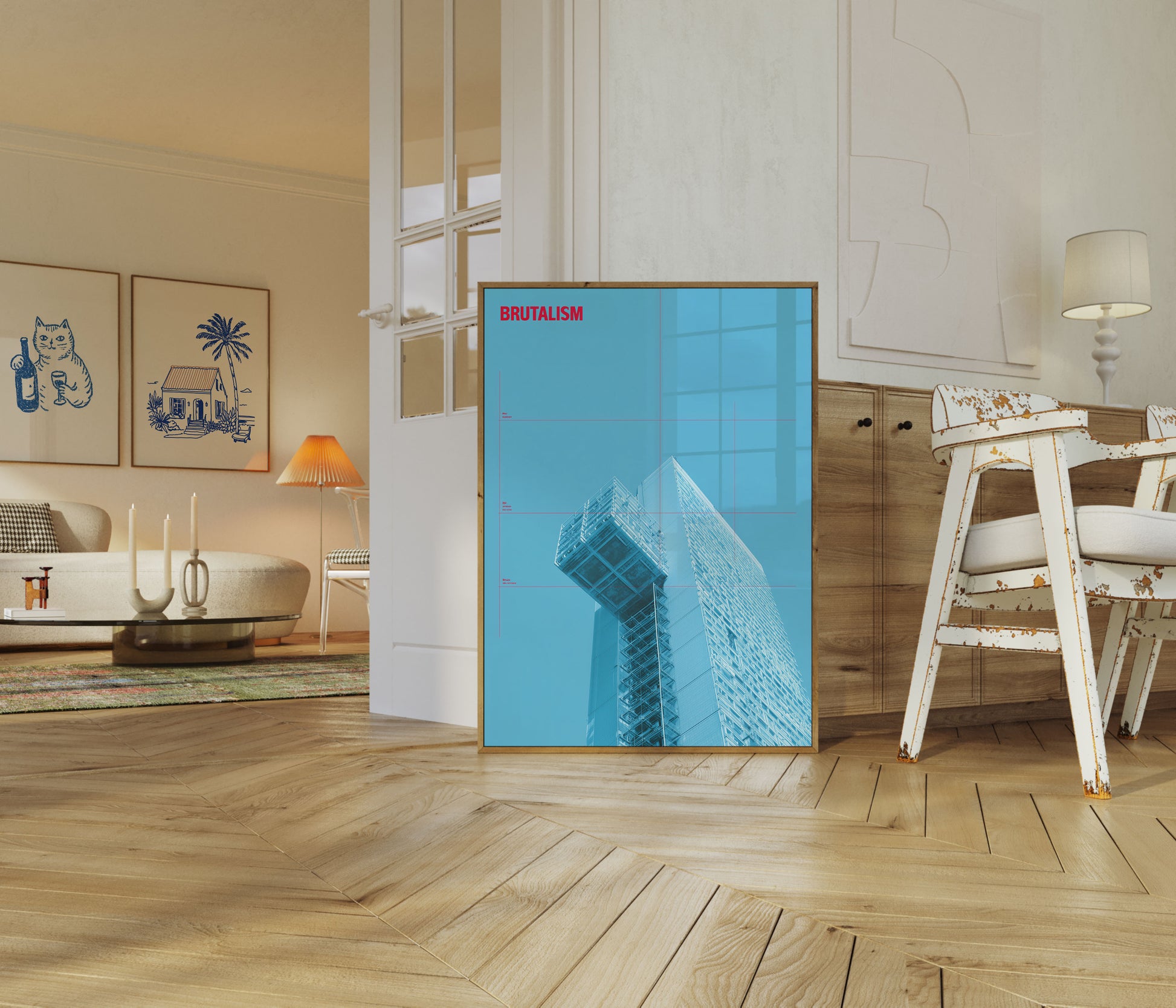 Dive into the raw, geometric beauty of architectural brutalism with this stunning blue-tinted poster. Featuring a striking glass and concrete structure that seems to defy gravity, the image captures the bold, structural essence of brutalist design. The angular, transparent volumes create a mesmerizing interplay of light, form, and perspective against a serene turquoise background.