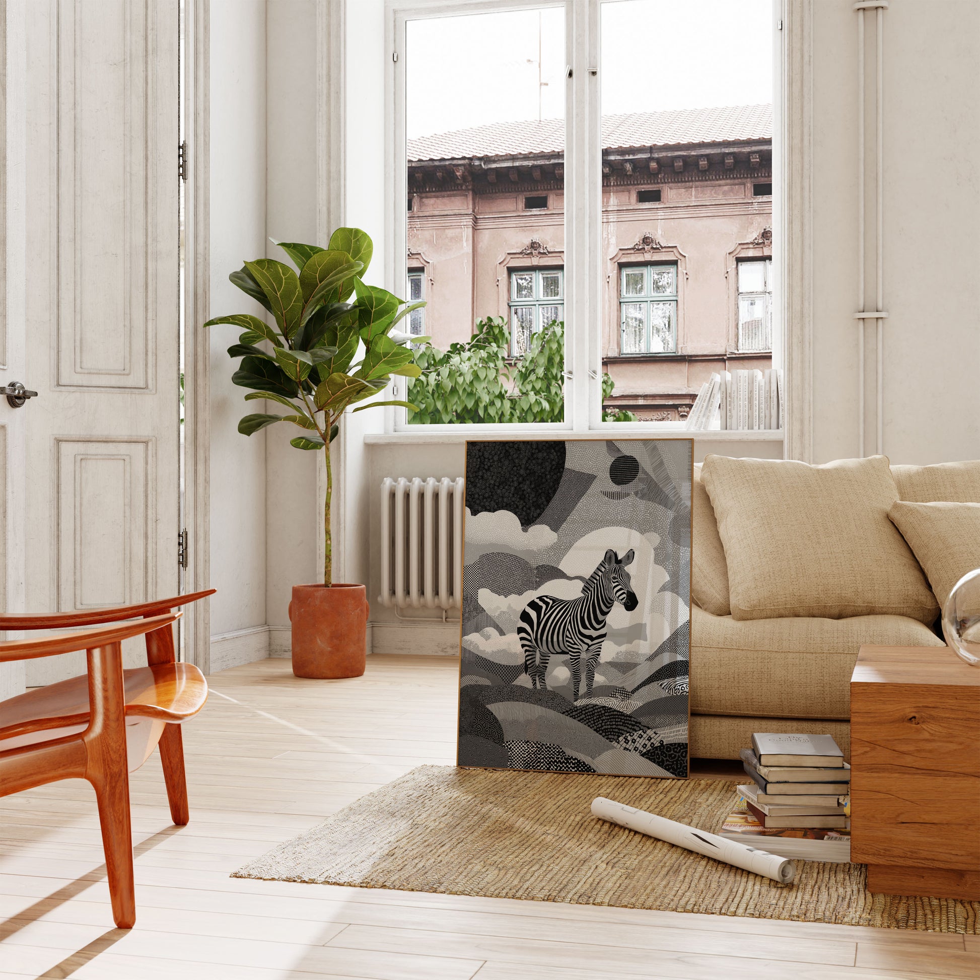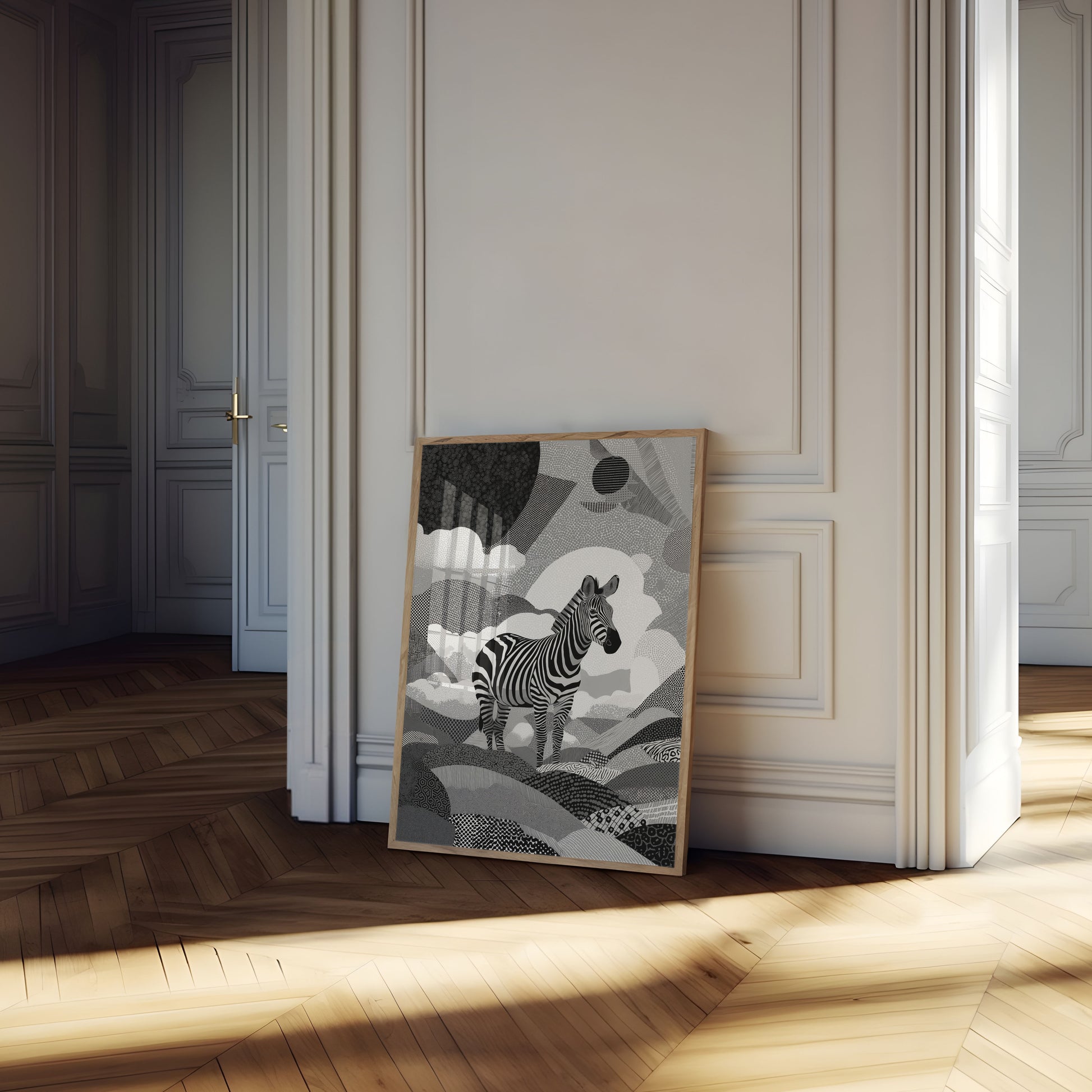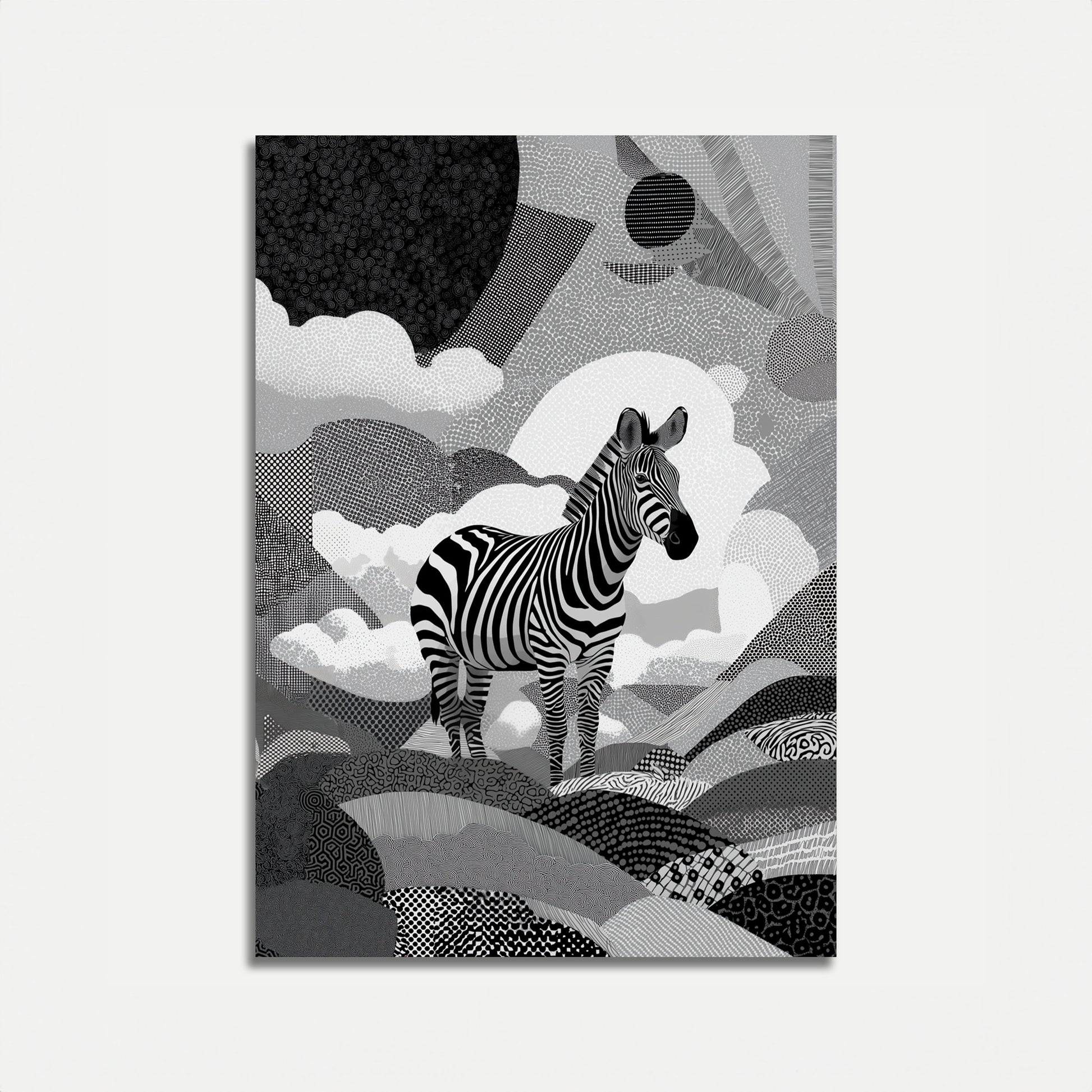 Step into a mesmerizing world of black and white patterns where a solitary zebra stands against a surreal landscape of intricate textures and geometric shapes. This stunning abstract artwork transforms the classic zebra silhouette into a complex visual journey, blending halftone dots, lines, and organic patterns that create depth and movement. The monochromatic design invites viewers to explore every nuanced detail of this extraordinary graphic composition.