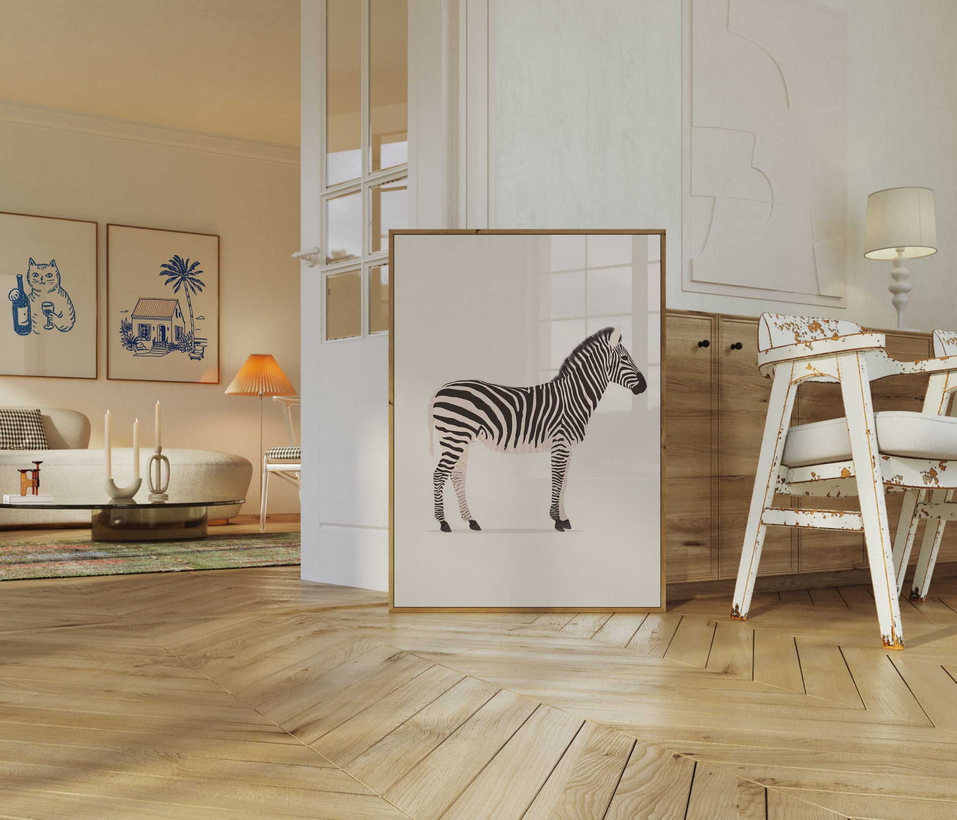 Capture the elegant simplicity of a zebra in this stunning minimalist art print. The stark black and white stripes create a mesmerizing visual rhythm against a soft, neutral background, showcasing the animal's iconic pattern with clean, graphic precision. This sophisticated poster transforms the zebra into a timeless piece of modern art that will elevate any space.