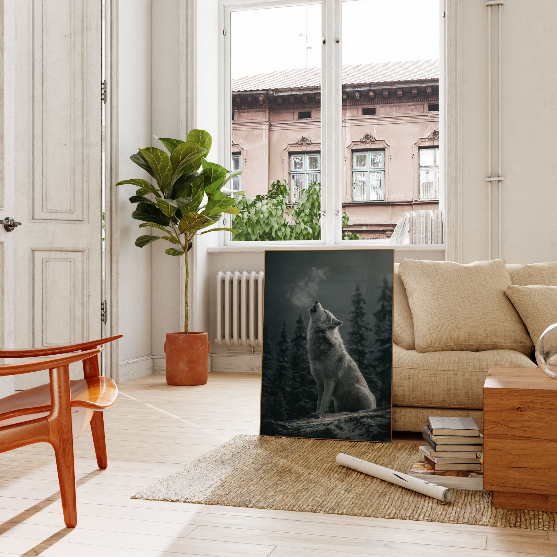 A magnificent wolf sits silhouetted against a misty, dark forest backdrop, its head tilted back in a haunting howl. The monochromatic image captures the raw essence of wilderness, with delicate snowflakes and shadowy pine trees creating a mesmerizing atmosphere of solitude and primal beauty. This striking wolf portrait embodies the untamed spirit of the wild, inviting viewers into a moment of profound natural mystery.