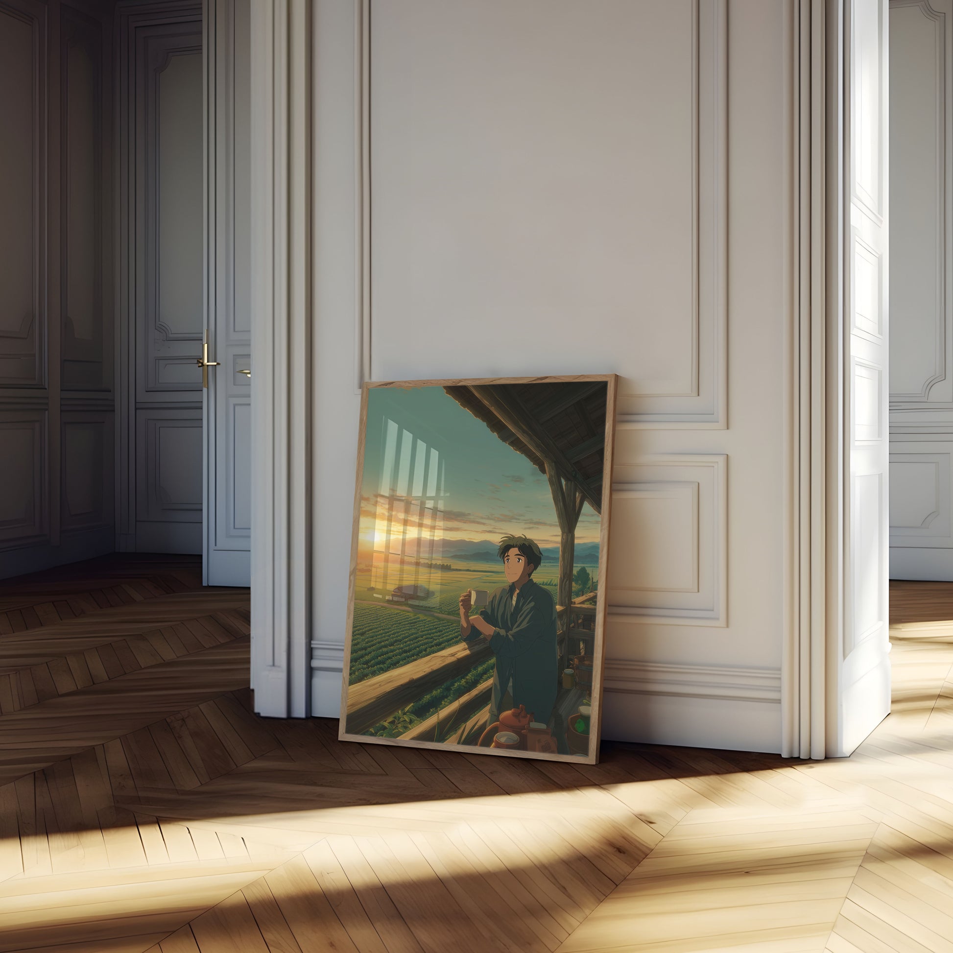 Immerse yourself in the serene beauty of rural morning light with this stunning coffee farm landscape illustration. A lone figure stands on a rustic wooden balcony, holding a warm cup while overlooking lush green agricultural fields and distant misty mountains bathed in golden sunrise colors. The artwork captures a moment of peaceful reflection and connection with the natural world.