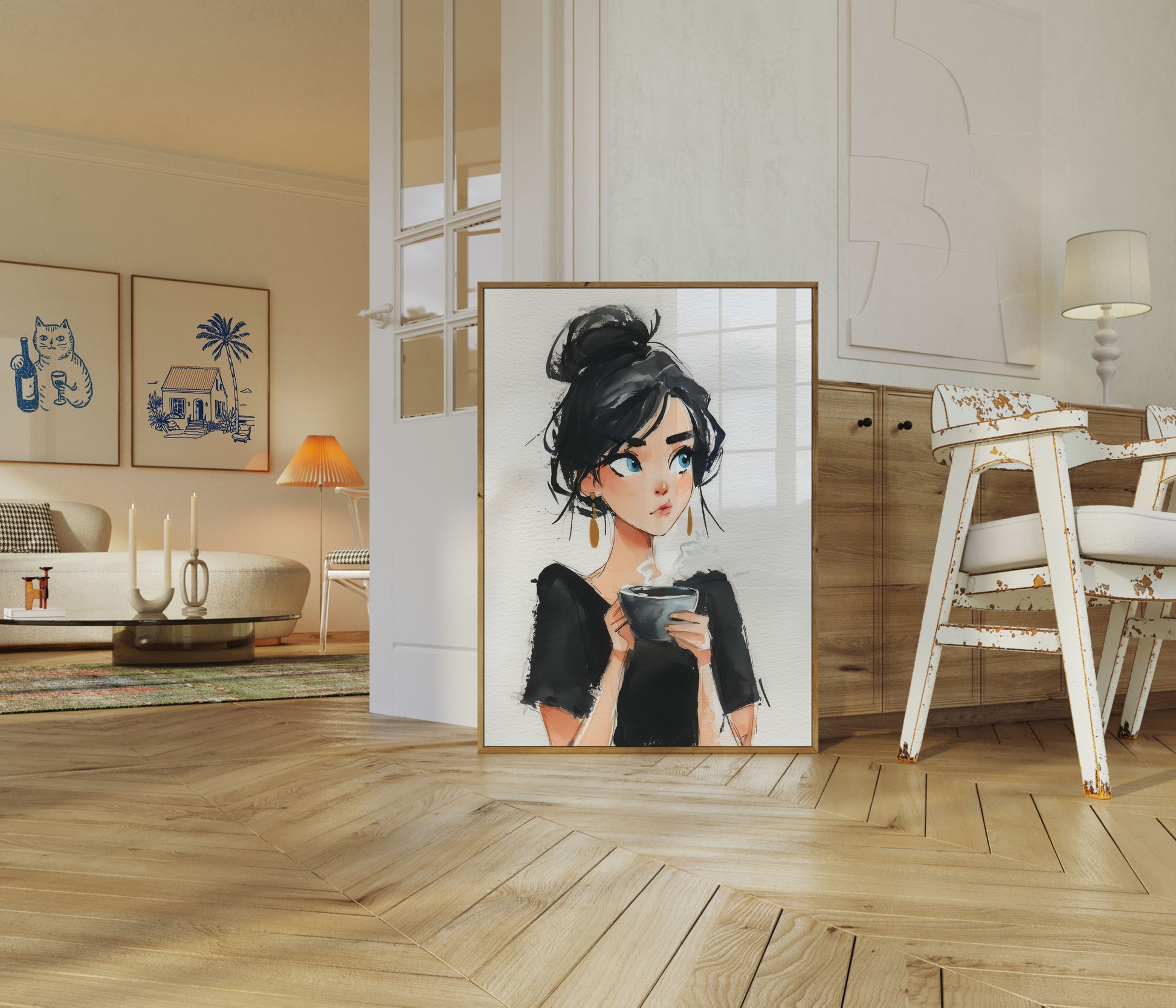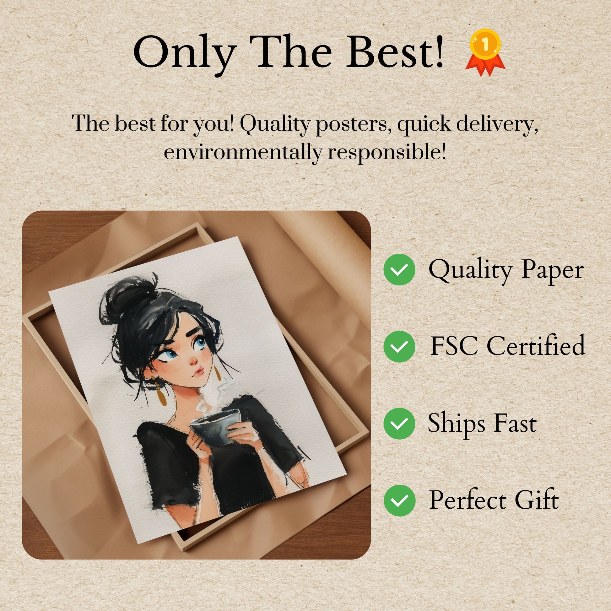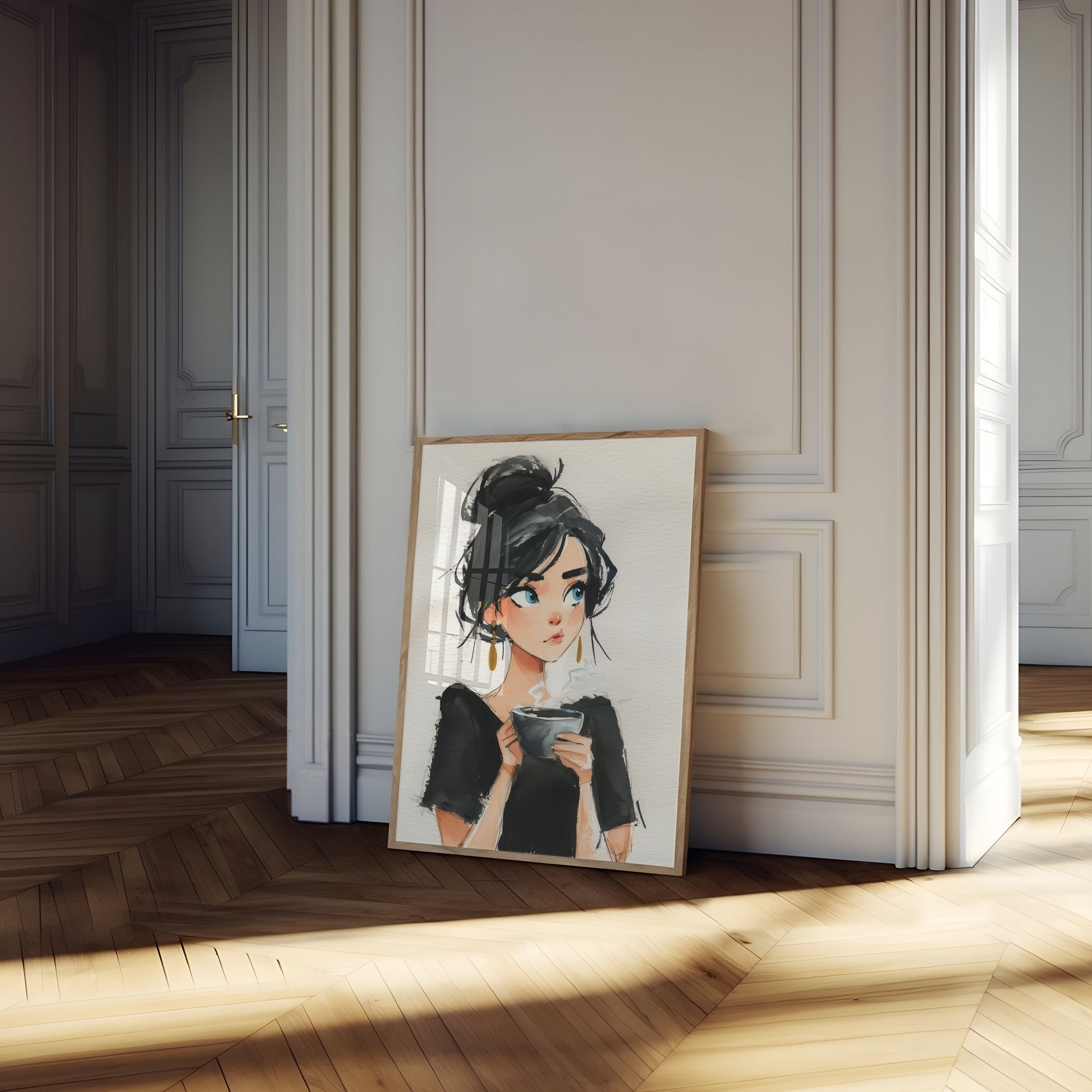 Capture the serene essence of a quiet morning with this stunning coffee art illustration. Featuring a stylish figure with mesmerizing blue eyes and a perfectly messy top knot, the poster radiates urban sophistication and calm. Dressed in sleek black and holding a steaming cup, this artwork embodies the peaceful ritual of morning coffee.