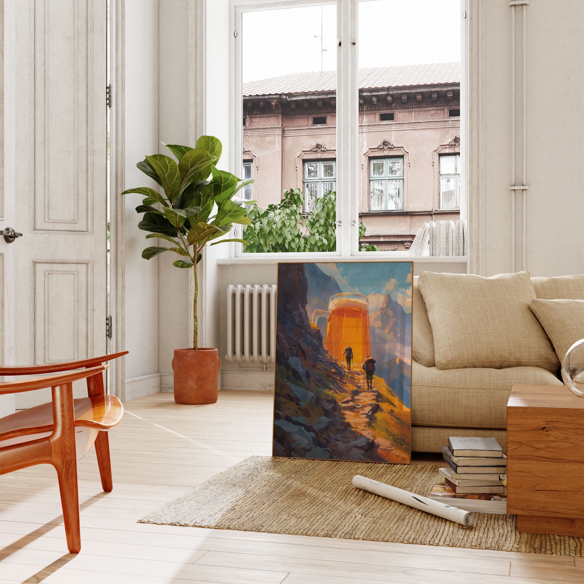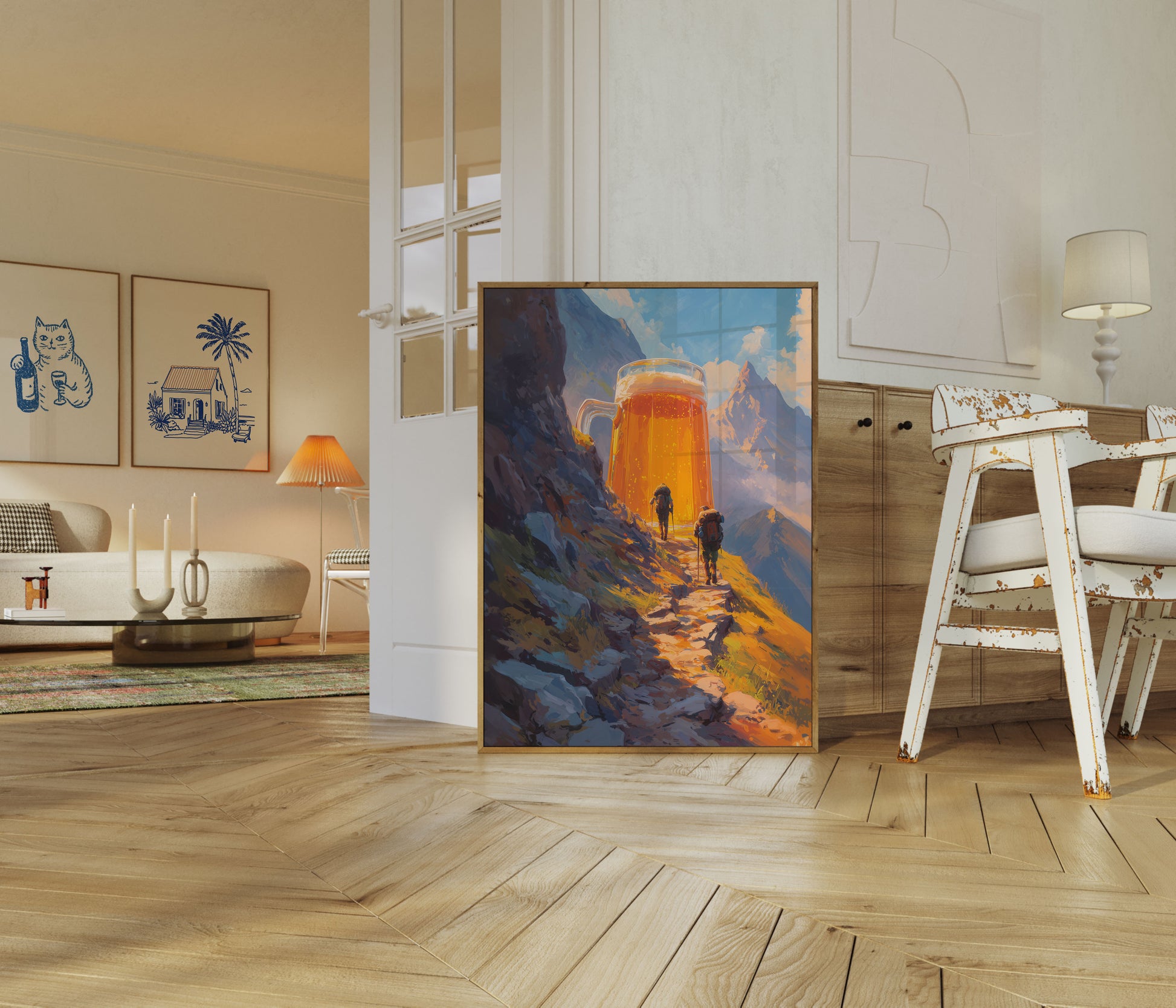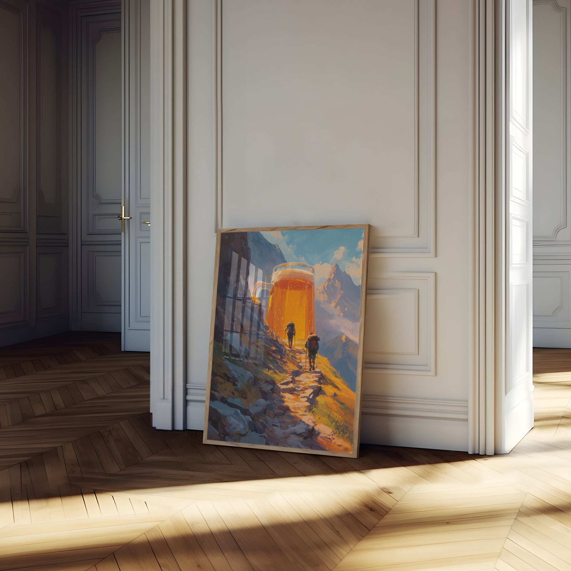 Embark on an epic journey where mountaineering meets liquid refreshment in this stunning artistic rendering. Two hikers trudge along a rocky mountain path towards an impossibly giant, golden beer mug that gleams in the sunlight, symbolizing the ultimate reward after a challenging trek. The vibrant orange and blue color palette captures the warmth of adventure and the cool promise of a well-deserved brew against a dramatic mountain landscape.