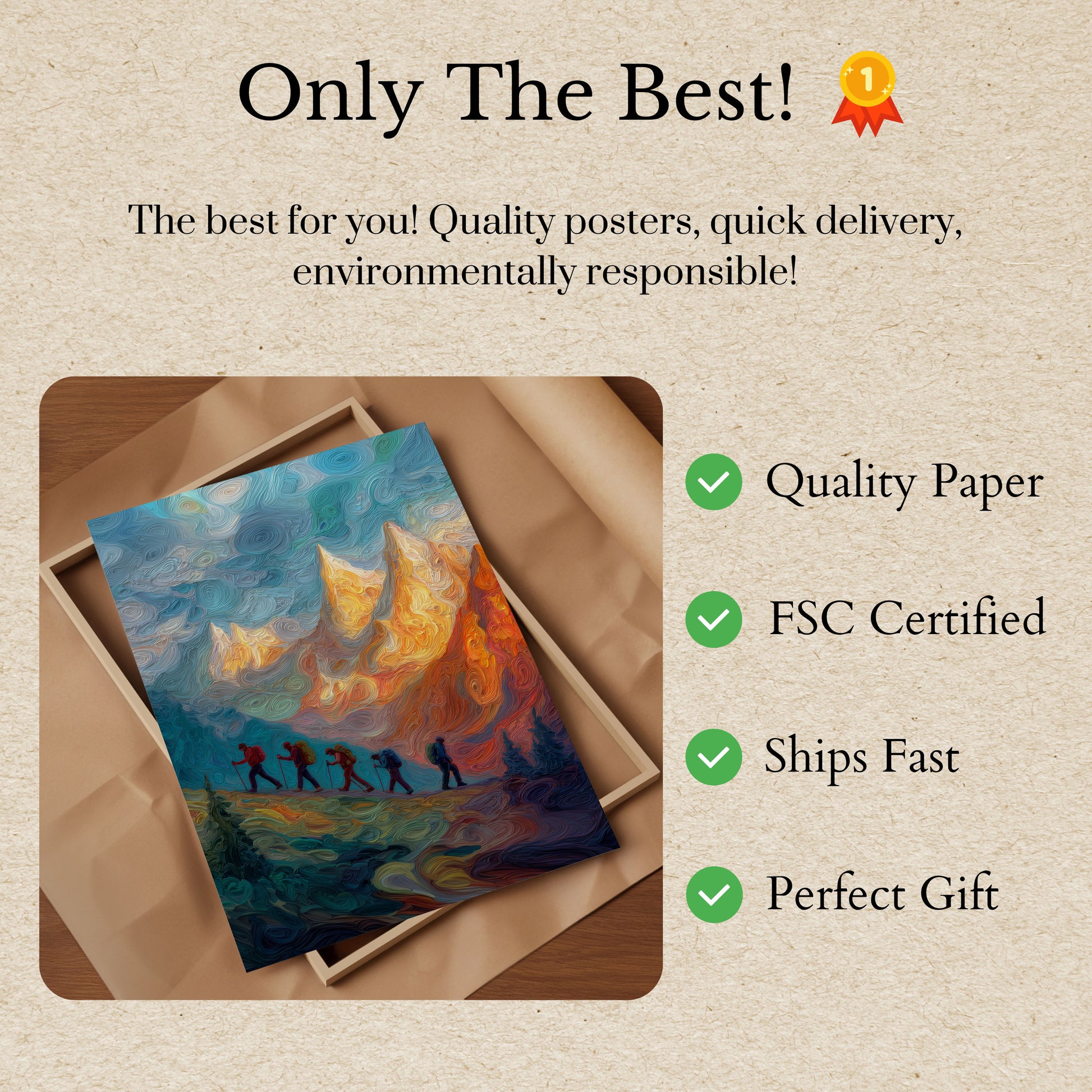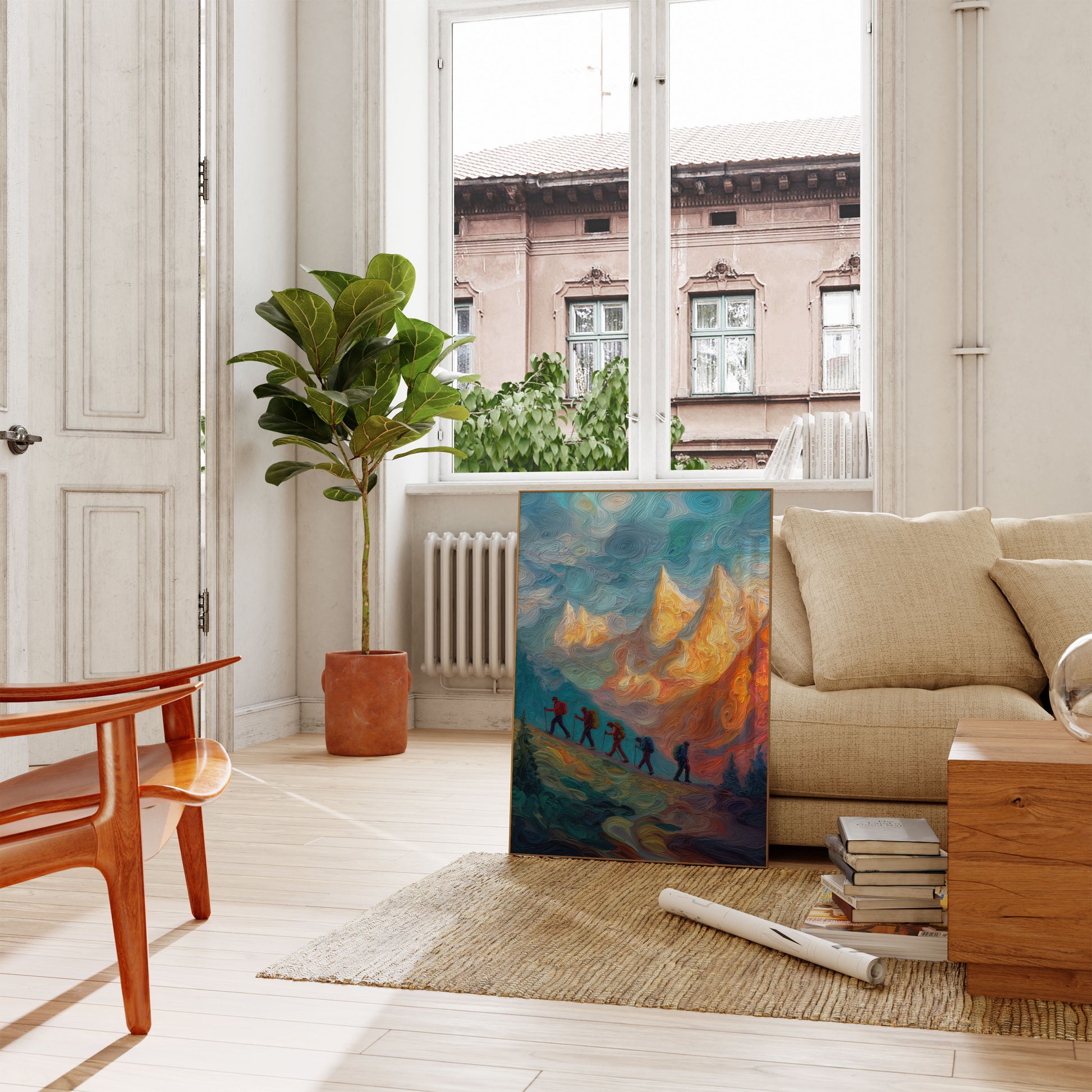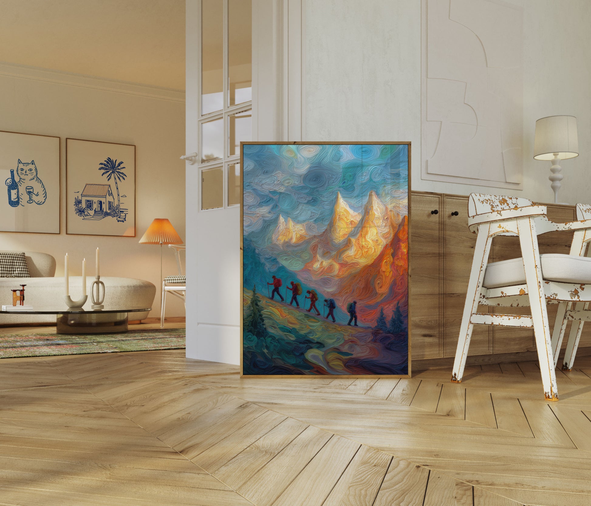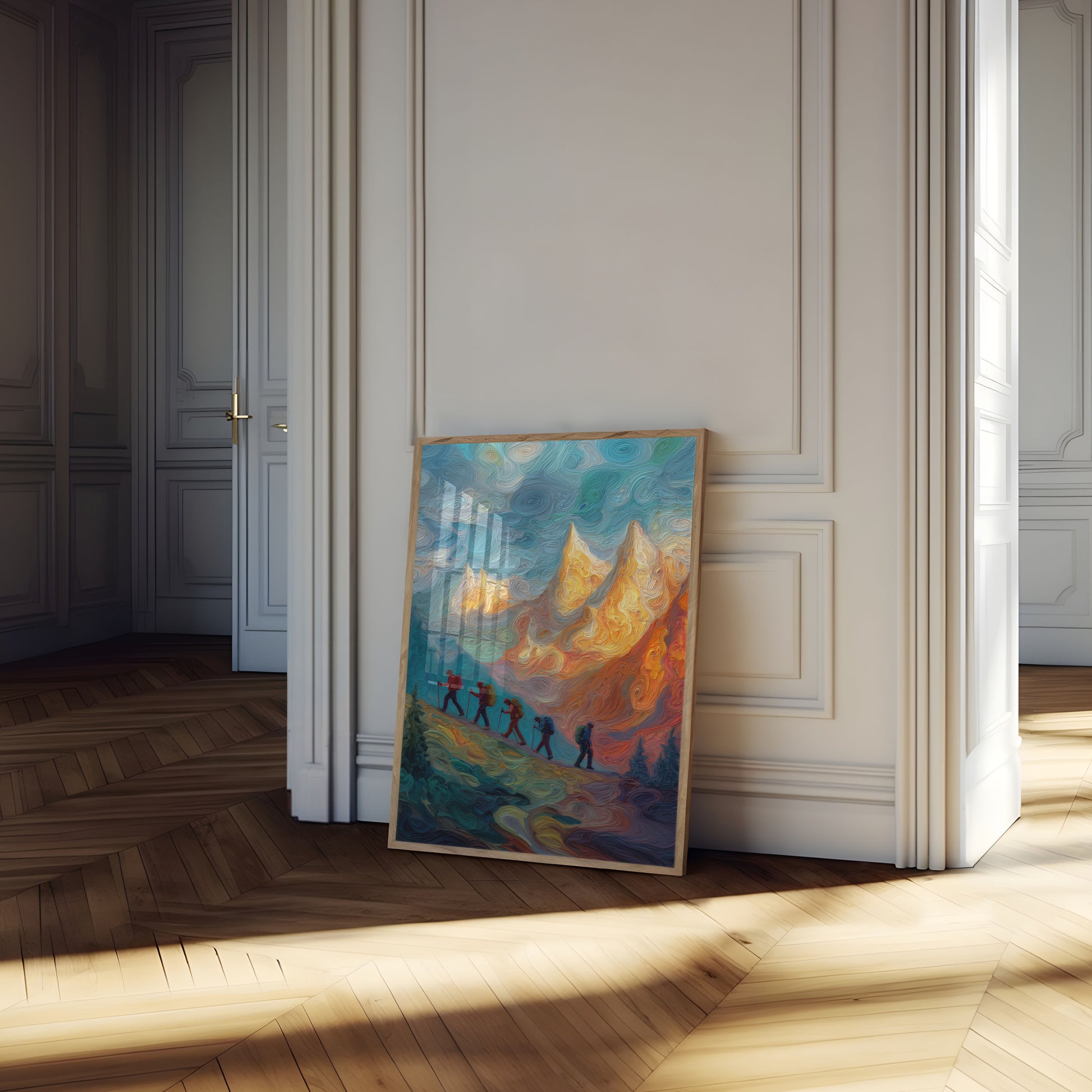 Immerse yourself in the breathtaking beauty of this stunning mountain hiking landscape, where swirling colors dance between fiery orange peaks and serene blue skies. The painting captures a group of hikers traversing a vibrant mountainside, their silhouettes small against the magnificent, undulating natural scenery that seems to pulse with living energy. Inspired by Van Gogh's famous style, this artwork transforms a simple hiking scene into an emotional journey of color, movement, and wilderness exploration.
