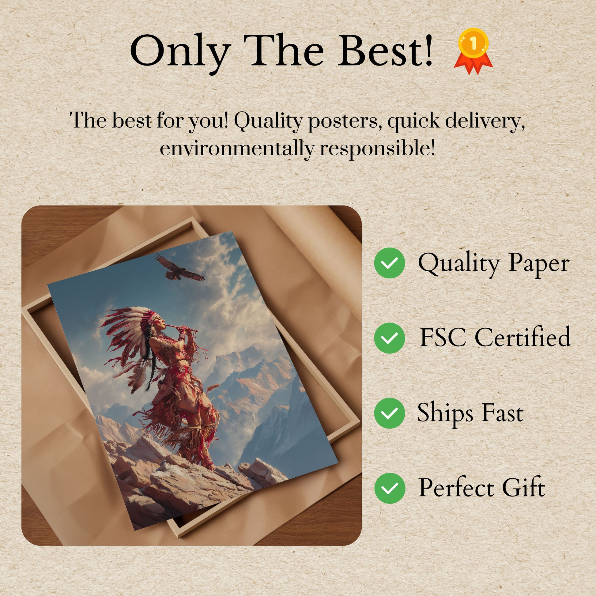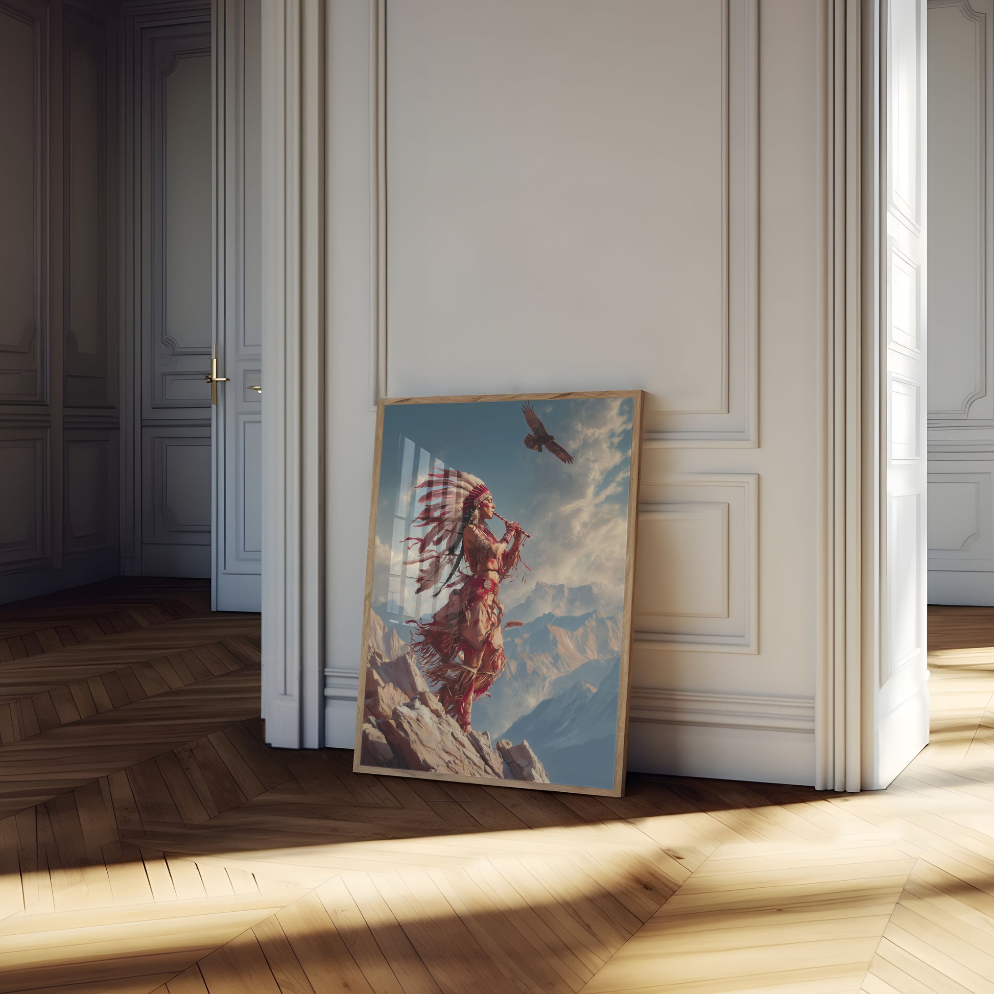 Immerse yourself in the breathtaking power of this Native American-inspired art piece, where tradition meets dramatic landscape. A figure adorned in a magnificent red feathered headdress stands boldly on a rocky mountain peak, playing a traditional flute while an eagle soars majestically against a soft, clouded sky. The vibrant reds and earthy tones blend seamlessly with the rugged mountain backdrop, creating a powerful visual narrative of spiritual connection and natural beauty.