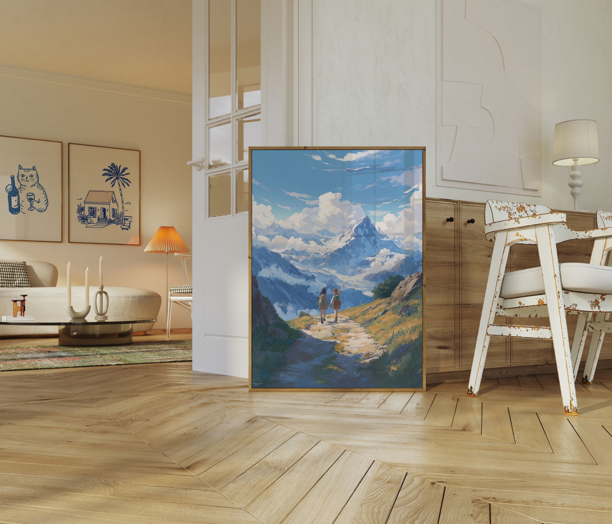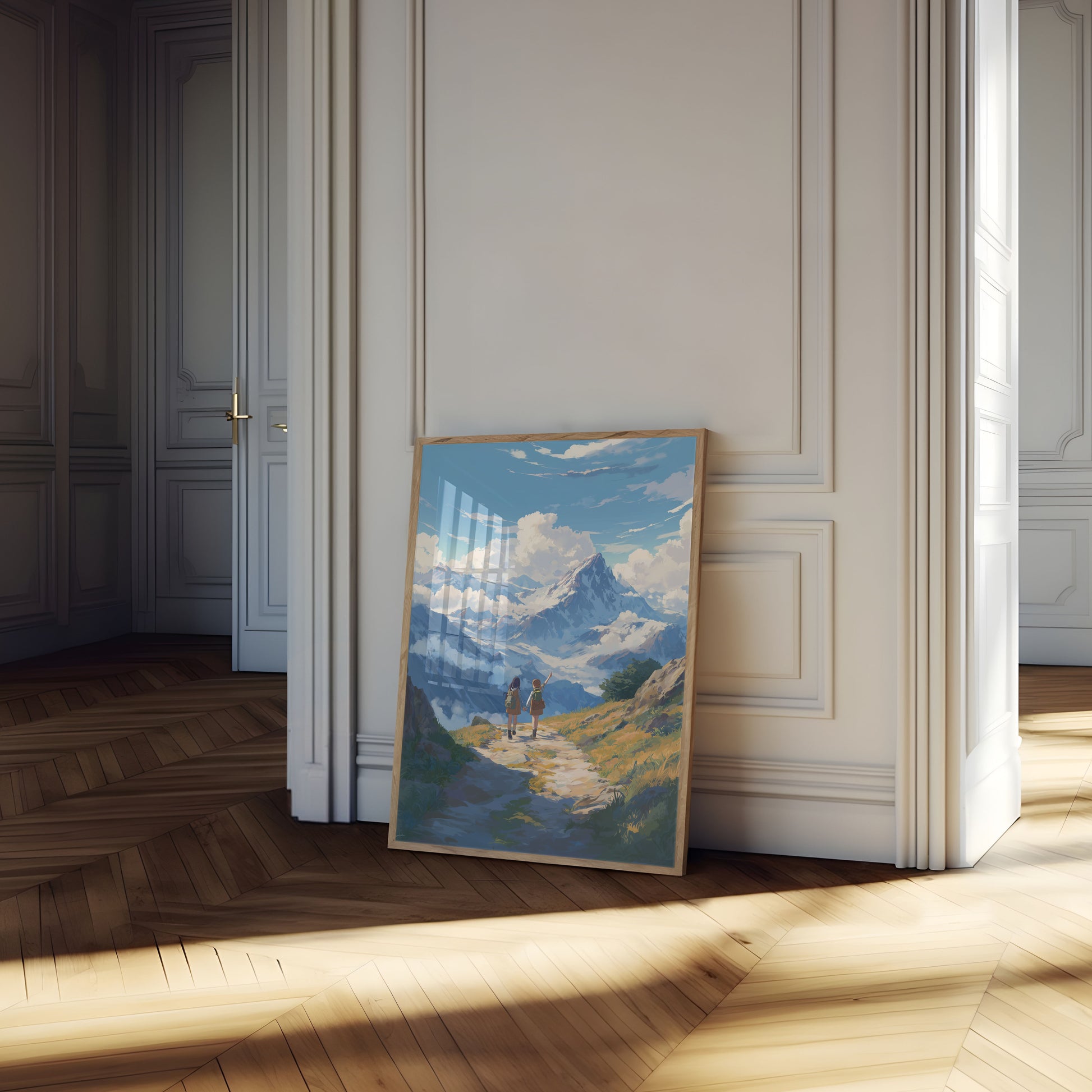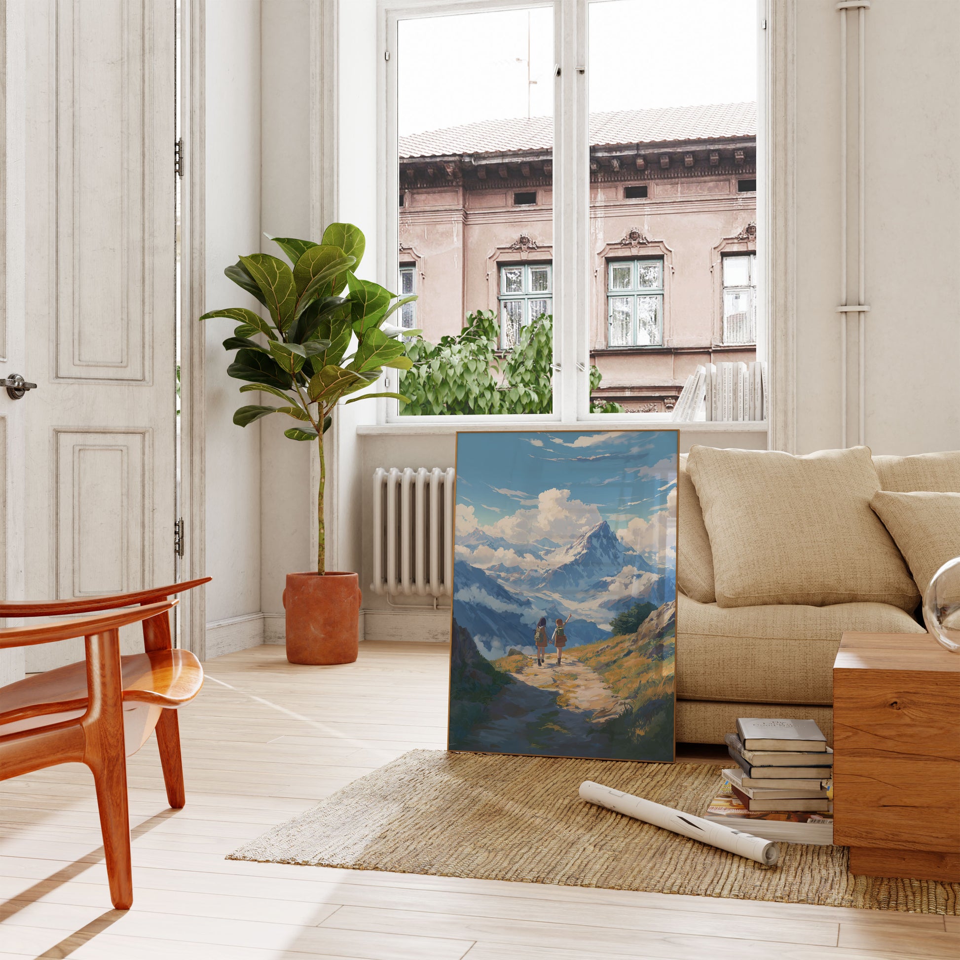 Embark on a breathtaking journey through alpine landscapes with this stunning mountain hiking poster. Two hikers walk a golden path, dwarfed by majestic snow-capped peaks and billowing clouds that paint a scene of epic exploration and wonder. The artwork captures the spirit of adventure, with vibrant blues, greens, and warm earth tones creating a mesmerizing landscape that invites viewers to dream of mountain escapades.
