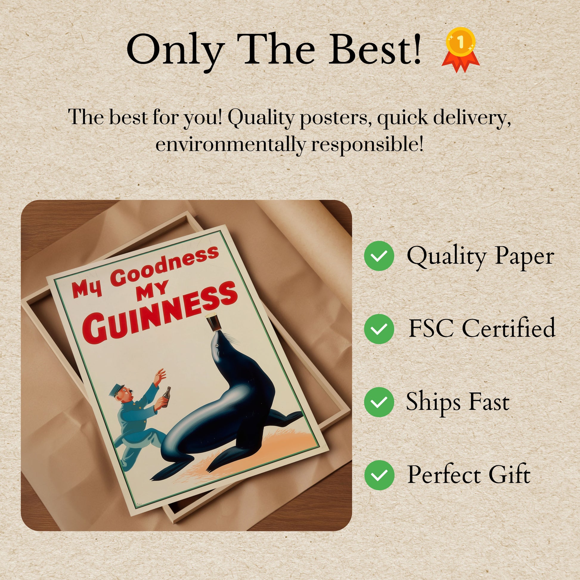 Step into the playful world of classic beer advertising with this delightful vintage Guinness poster featuring a charming seal balancing a pint of the iconic Irish stout. The whimsical illustration captures a blue-uniformed attendant chasing the mischievous seal, who has cleverly claimed the Guinness as its own, creating a humorous and memorable visual narrative. Rich blue tones and bold red typography bring this nostalgic marketing artwork to vibrant life.