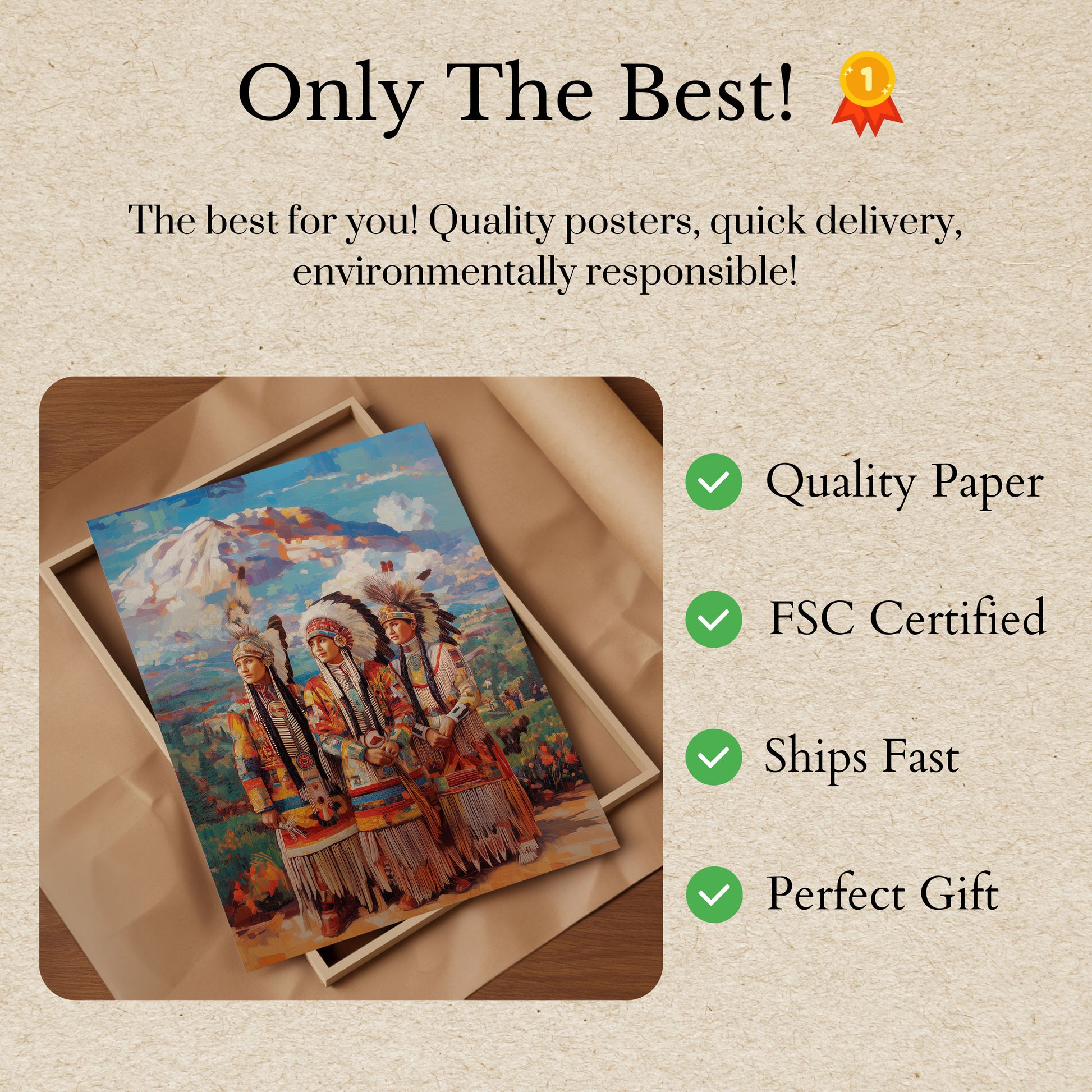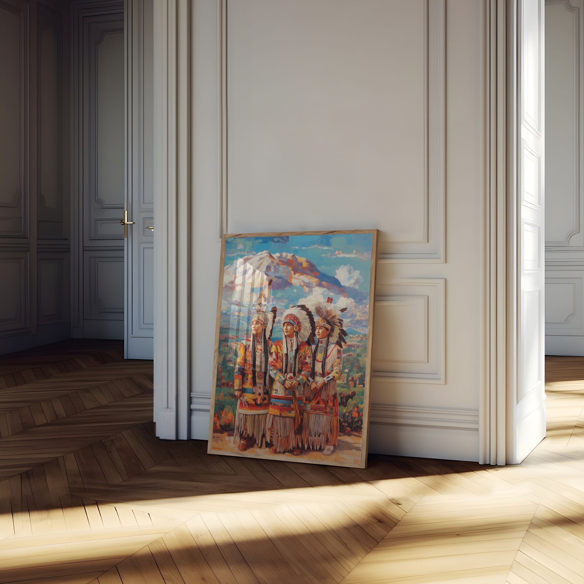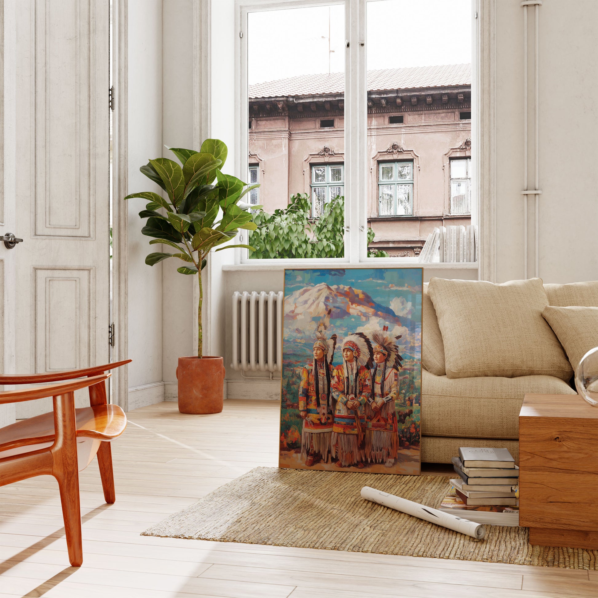 Step into a breathtaking world of cultural heritage with this stunning artistic portrayal of three Native American chiefs standing proudly against a dramatic mountainous landscape. The vibrant, painterly style captures the rich traditions and spiritual connection to the land, featuring intricate traditional clothing, magnificent feathered headdresses, and a sweeping backdrop of snow-capped peaks and verdant forests. Each detail tells a powerful story of strength, dignity, and the enduring spirit of Indigenous peoples.