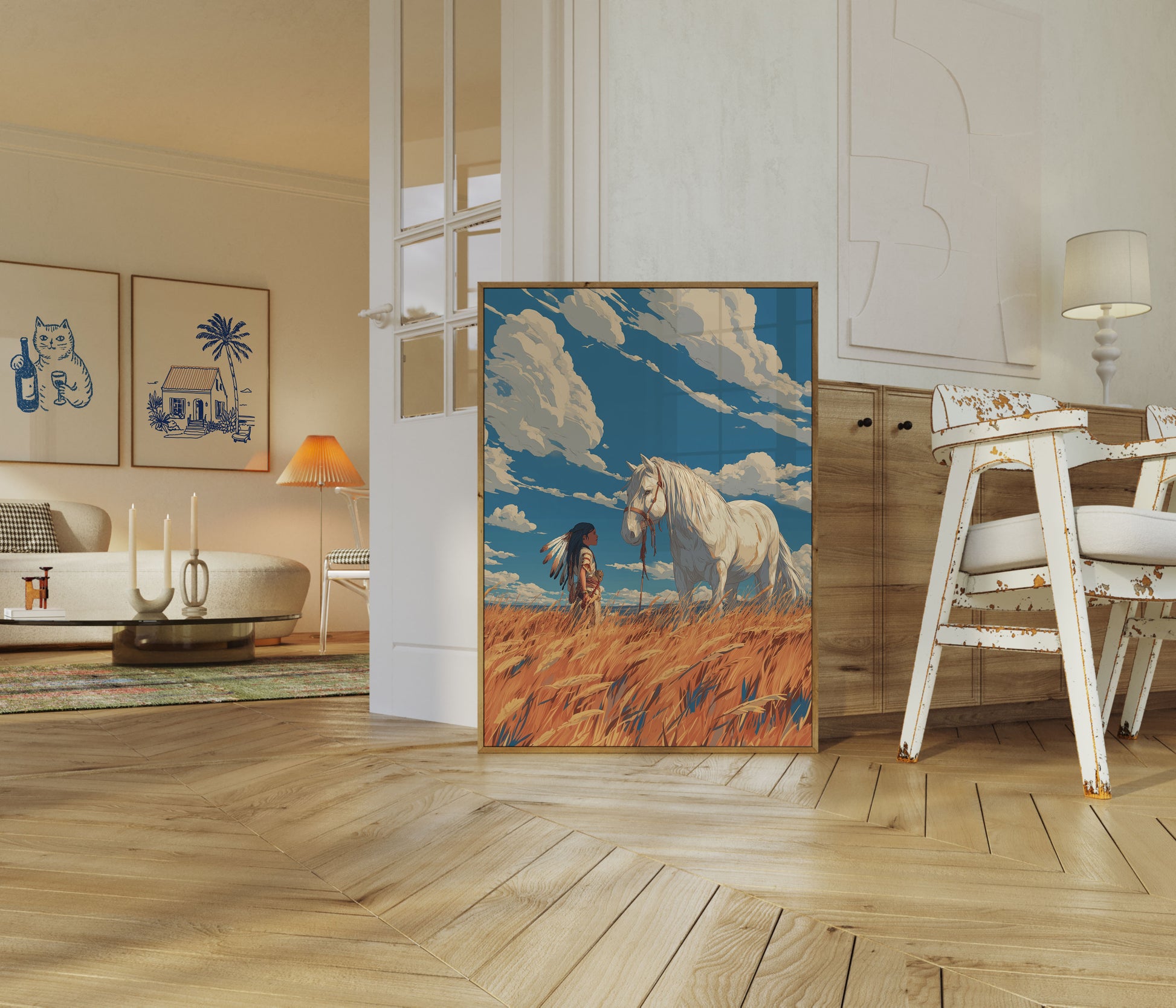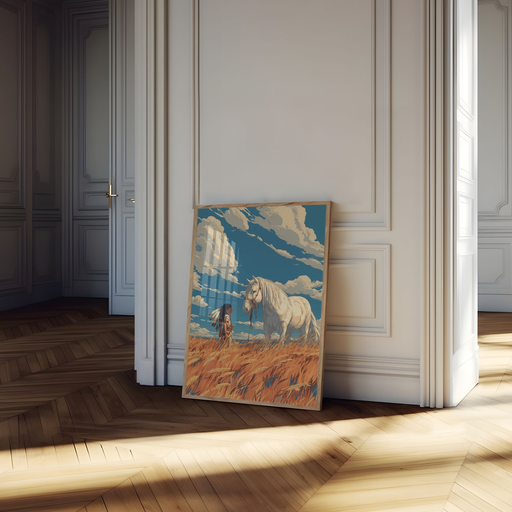 Immerse yourself in the breathtaking harmony between a Native American rider and a majestic white horse, set against a sweeping golden grassland and dramatic blue sky filled with billowing clouds. This stunning artwork captures the profound bond between indigenous culture and the natural world, with rich amber wheat fields swaying beneath an expansive, dreamy landscape that speaks to freedom, tradition, and spiritual connection. The intricate feathered headdress and the horse's elegant stance create a powerful narrative of mutual respect and understanding.