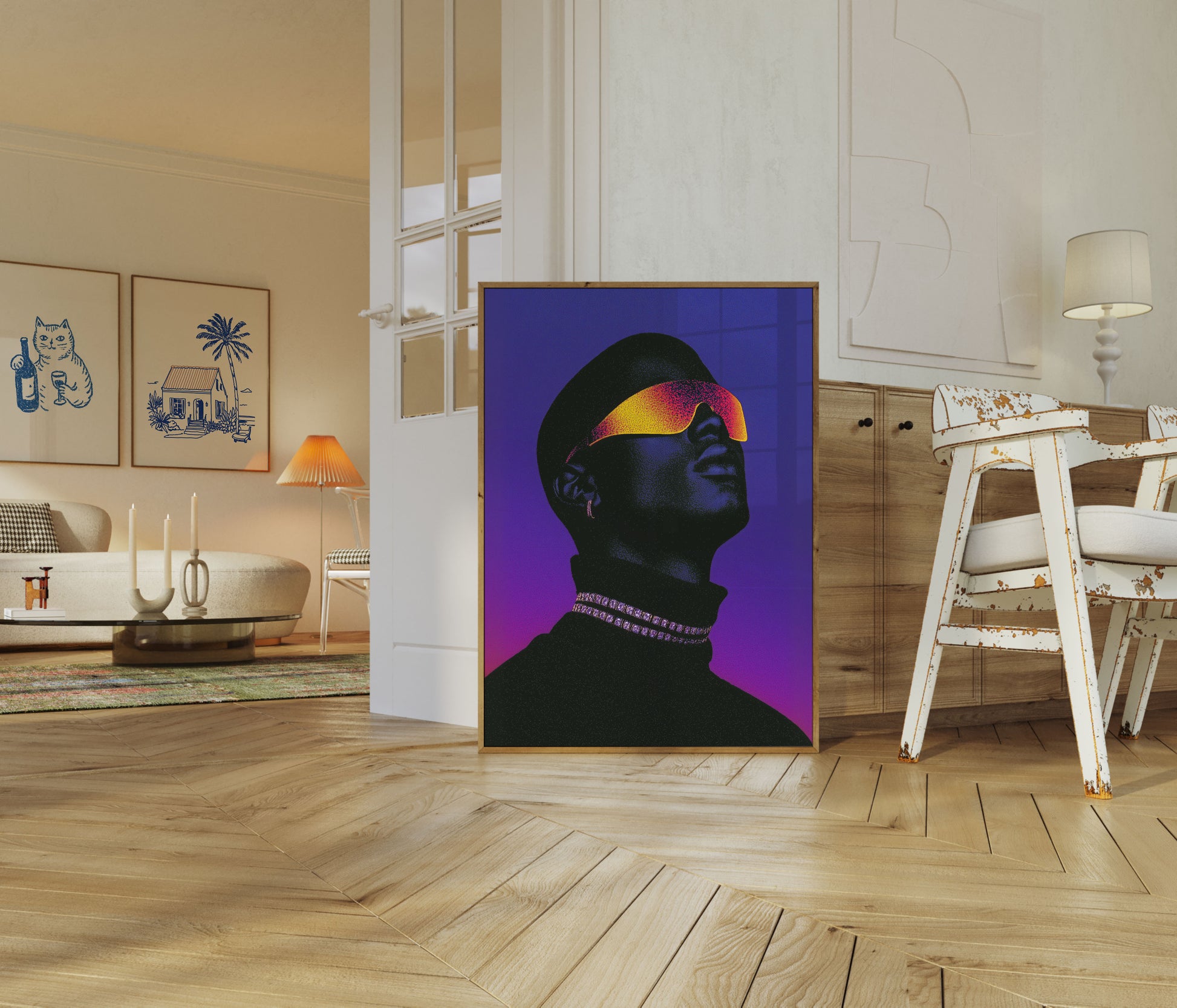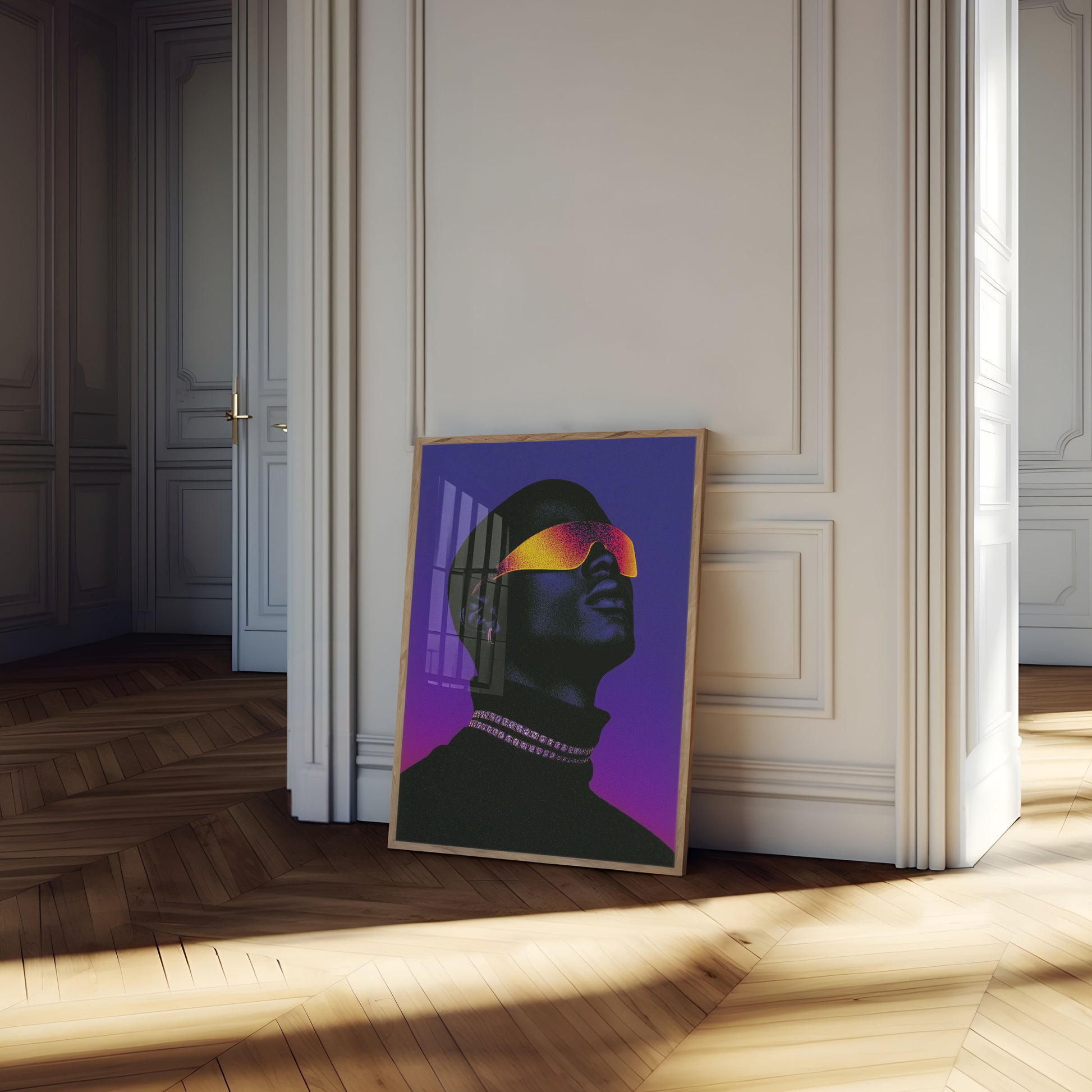 Dive into a mesmerizing world of color and contrast with this striking portrait that blends deep blues, vibrant purples, and electric yellow-red tones. The stylized figure wears an eye-catching luminescent visor, creating a futuristic and introspective mood that captures the essence of modern digital art. Dramatic lighting and a dotted texture give the image a unique, almost holographic feel that draws the viewer into its hypnotic visual narrative.