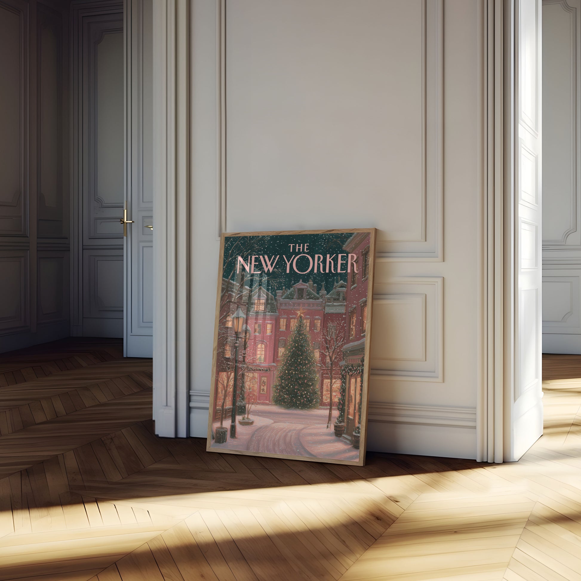 Step into a magical winter evening in the heart of New York with this enchanting holiday illustration from The New Yorker. Soft pink brownstones frame a luminous Christmas tree, while gently falling snow creates a dreamy atmosphere of warmth and nostalgia. Glowing windows and a vintage streetlamp invite viewers into this intimate urban winter landscape that captures the pure magic of the holiday season.