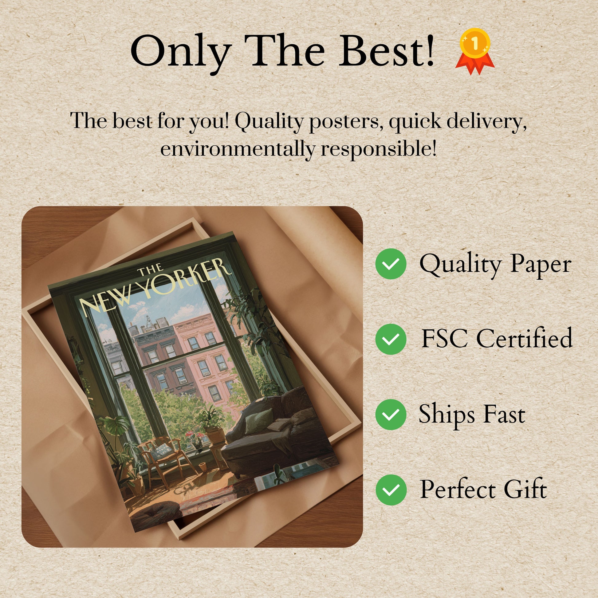 Experience the serene beauty of a sunny New York City apartment through this intimate, warmly-lit illustration from The New Yorker. The poster captures a tranquil interior scene with a cozy sofa, wooden chair, and lush houseplants, framing a picturesque view of pastel-colored brownstone buildings and verdant tree tops. Soft sunlight streams across the room, creating a nostalgic and peaceful atmosphere that celebrates urban living and quiet moments.