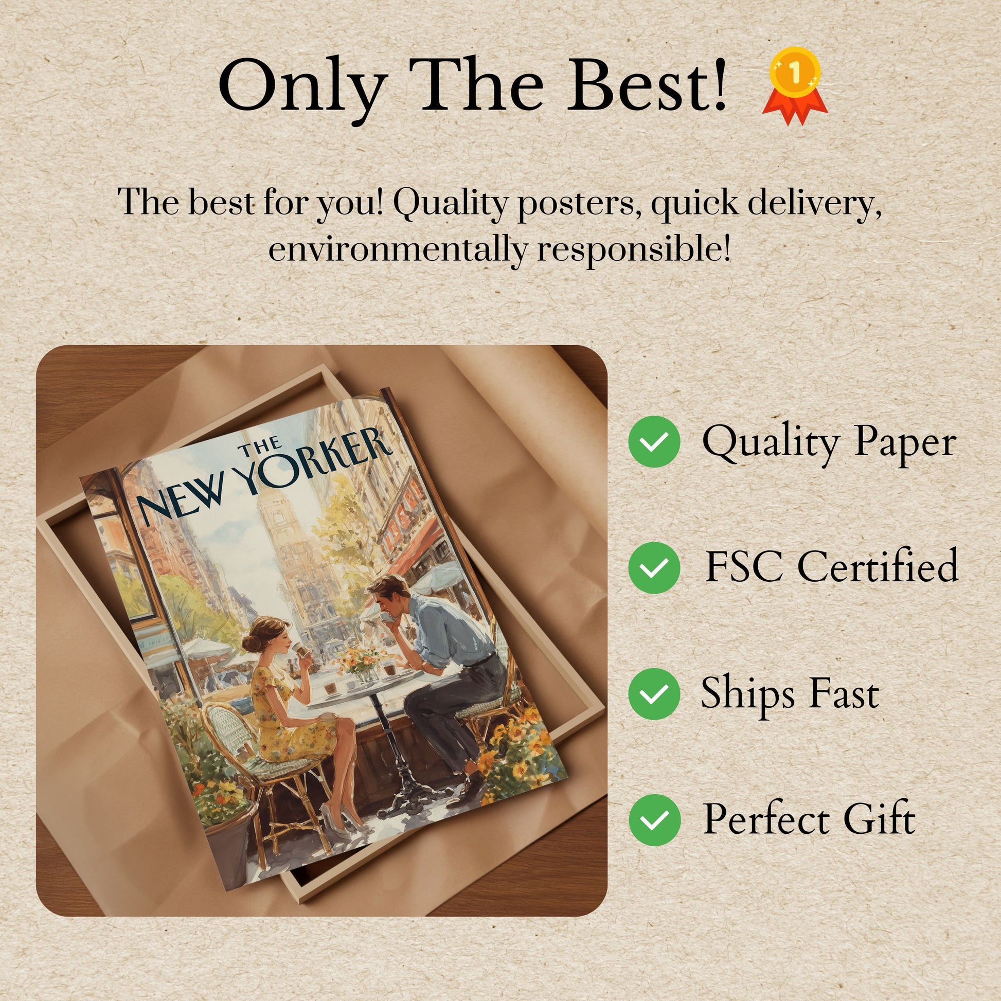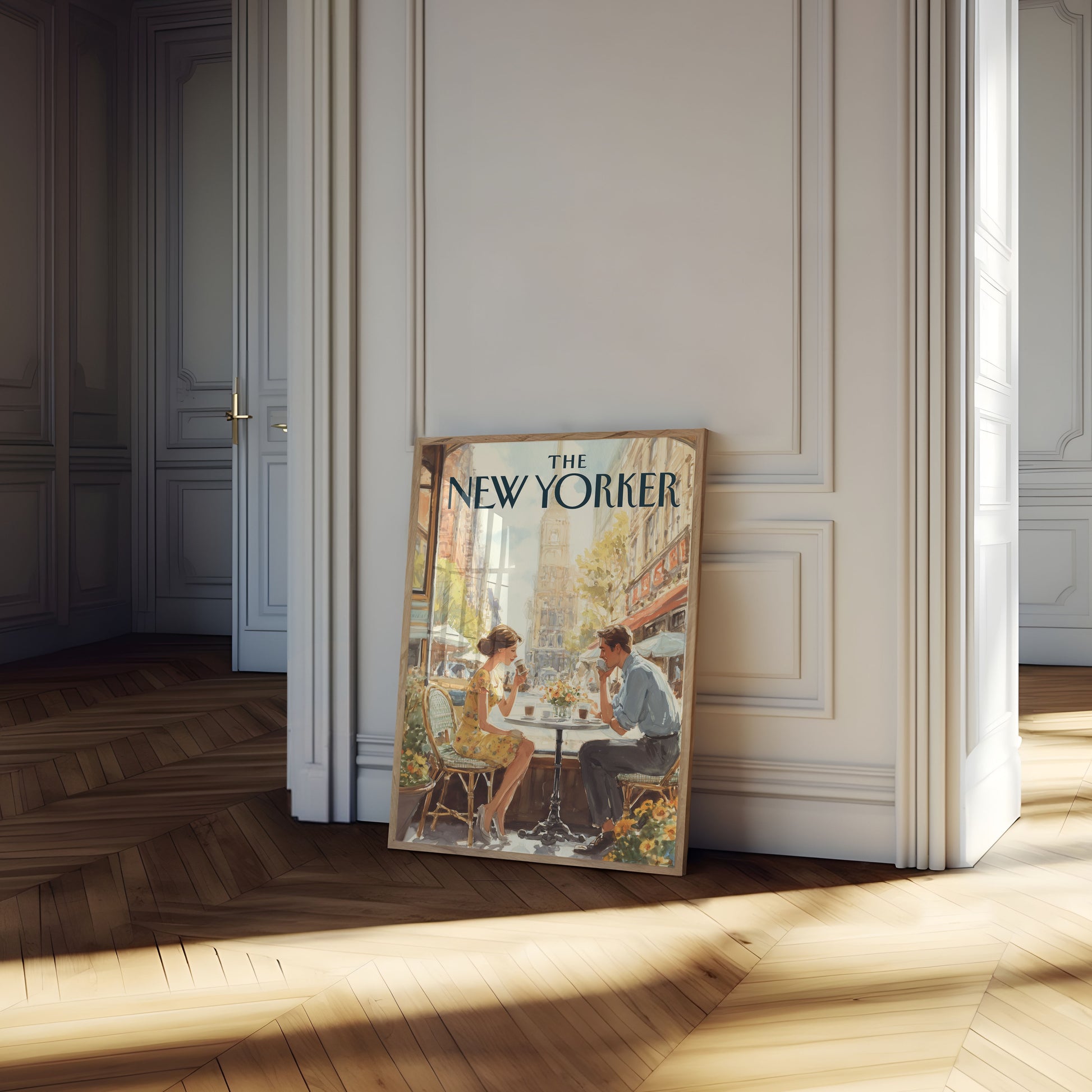 Immerse yourself in the enchanting world of a quintessential New York City cafe scene, where soft sunlight bathes a charming outdoor setting and two elegantly dressed individuals share an intimate moment. The watercolor-style illustration captures the essence of urban romance, with delicate flowers, historic architecture, and a sense of timeless connection between the two figures. A perfect artwork that evokes the dreamy, sophisticated atmosphere of The New Yorker magazine's iconic visual storytelling.