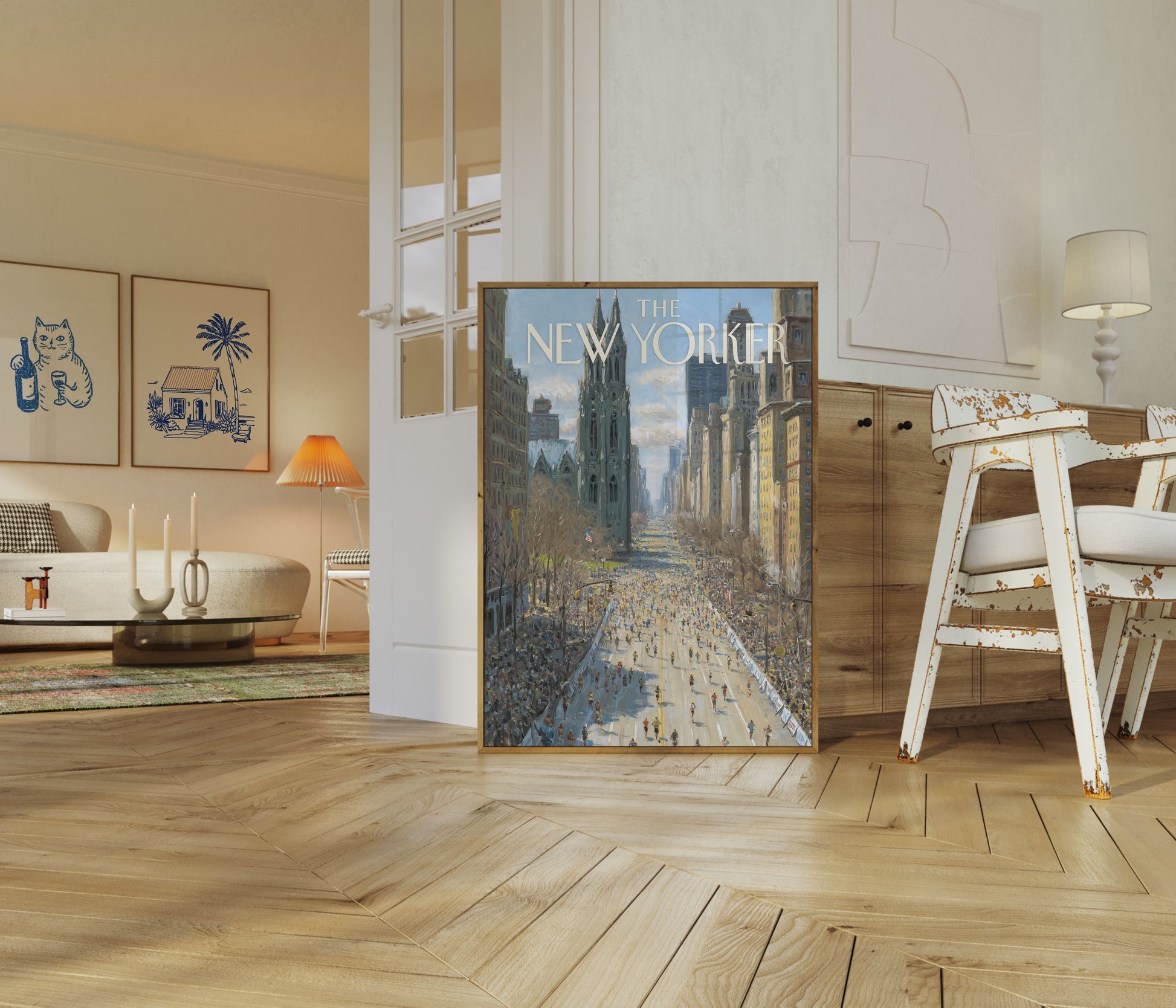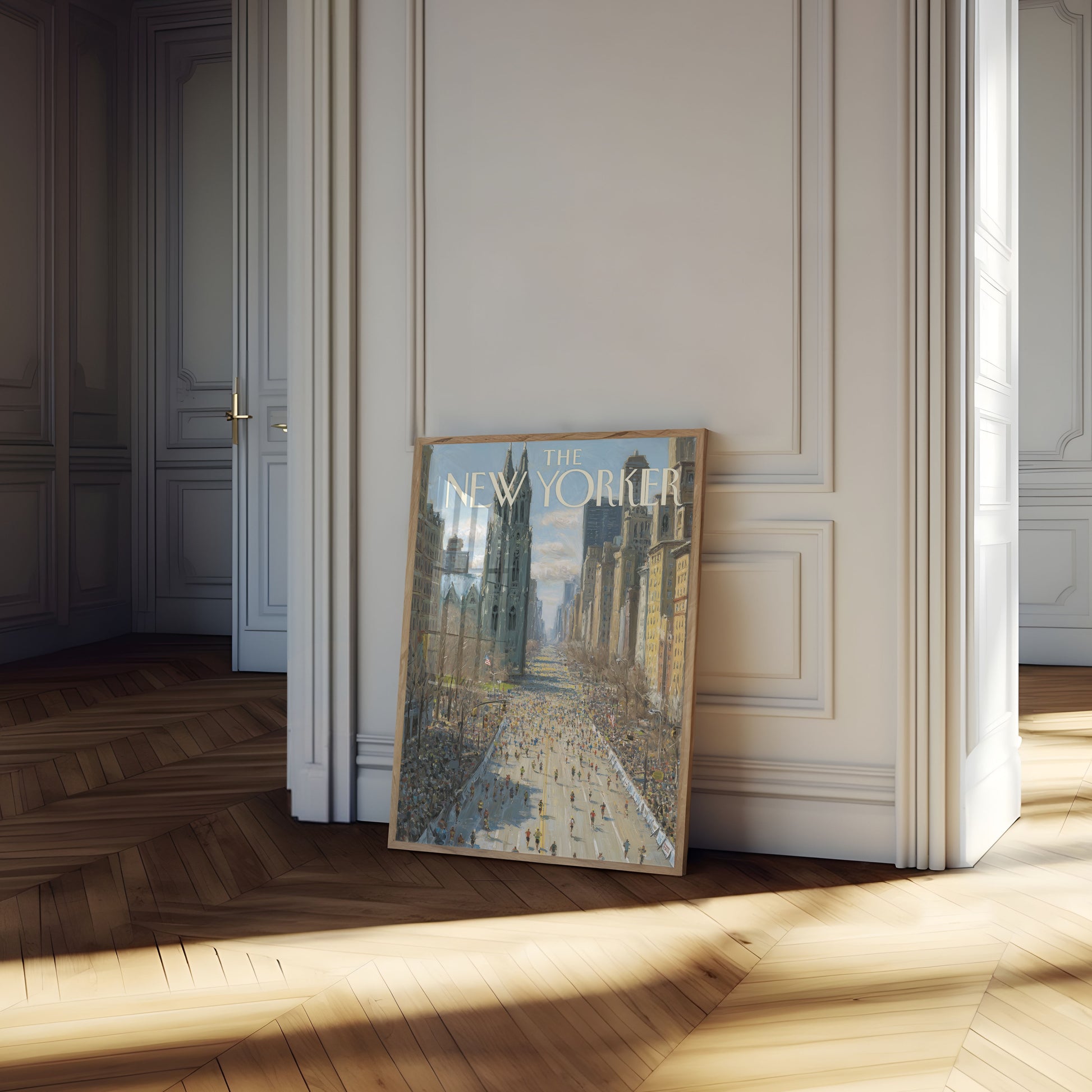 Capture the vibrant energy of the New York City Marathon with this stunning artistic rendering of runners streaming down a historic city street. The painting beautifully depicts the iconic cityscape, with the gothic church spire and towering buildings framing a sea of colorful runners surrounded by cheering crowds. Soft blues, warm yellows, and muted greens create a dynamic and inspiring scene that celebrates urban athleticism and community spirit.