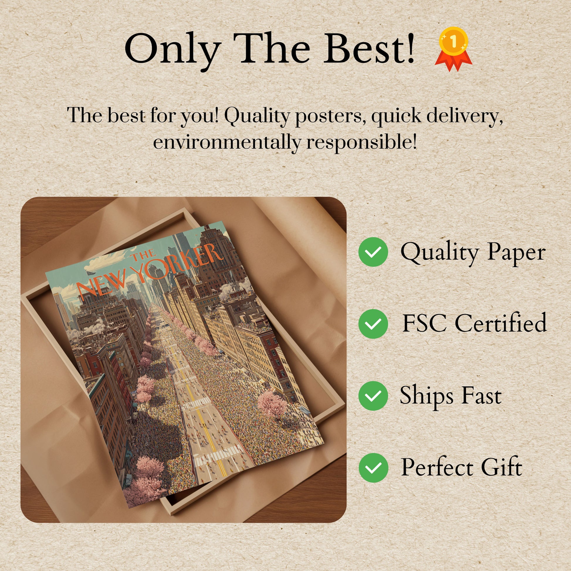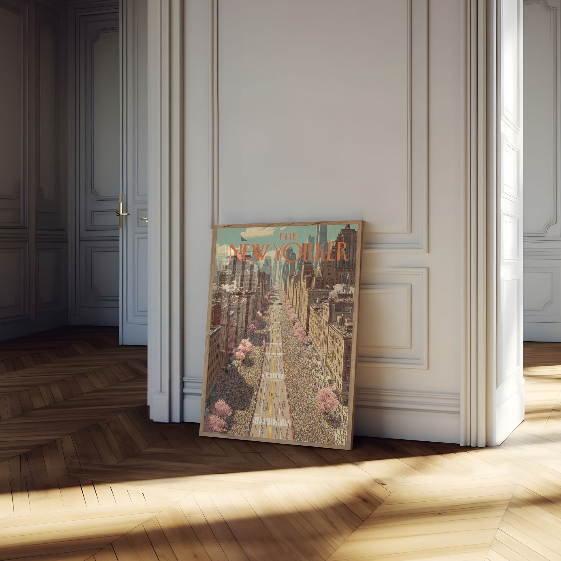 Immerse yourself in the vibrant energy of New York City with this stunning aerial illustration of a bustling street lined with blooming cherry blossom trees. The New Yorker magazine's iconic cover art captures the dynamic spirit of the city, featuring dense crowds filling a wide urban avenue surrounded by towering buildings and soft pink spring blossoms. A mesmerizing panoramic view that celebrates the life, diversity, and architectural grandeur of Manhattan.