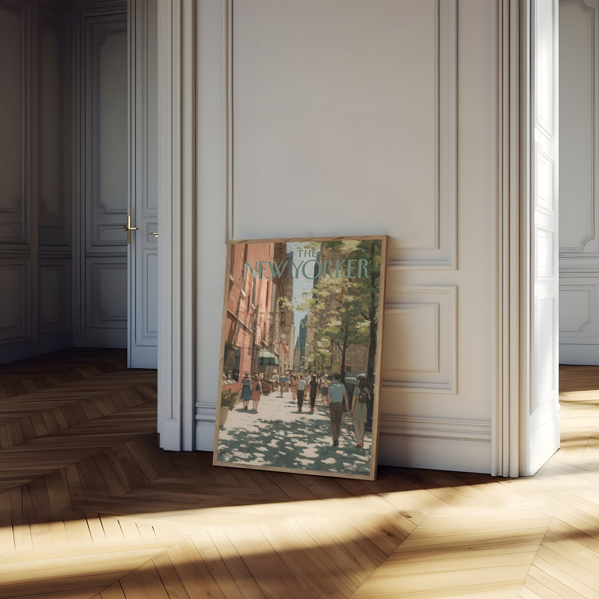 Experience the vibrant energy of a bustling New York City street on a warm summer day with this stunning illustration from The New Yorker. Soft sunlight dapples the sidewalk, casting intricate shadows from lush green trees while pedestrians stroll casually down the urban pathway. Rich salmon-colored buildings and verdant foliage create a nostalgic scene that captures the essence of city life in warm, impressionistic tones.