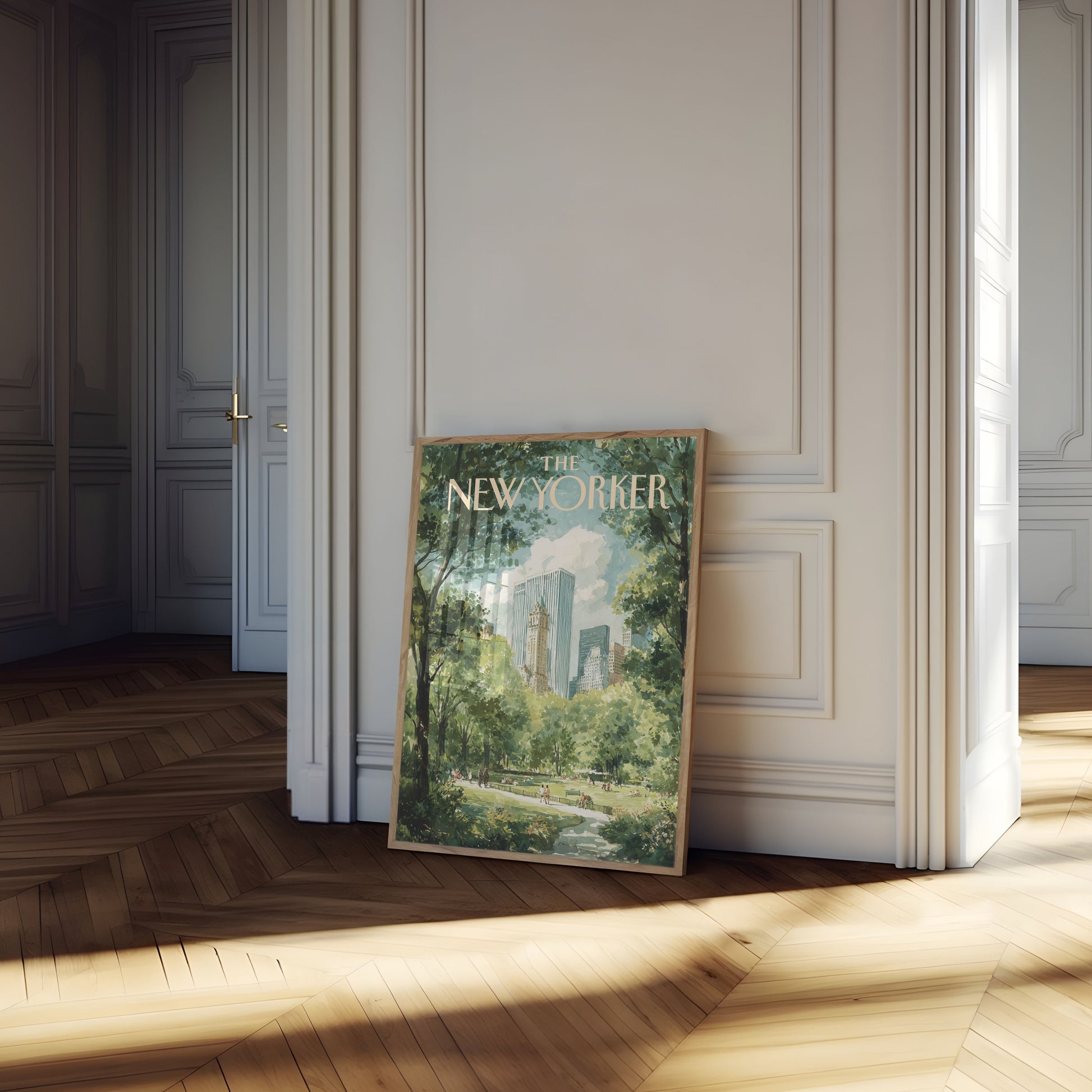 Immerse yourself in the serene beauty of New York City's Central Park, where lush greenery frames a stunning cityscape of iconic skyscrapers. This watercolor masterpiece captures the magical contrast between nature's vibrant tranquility and the city's architectural grandeur, inviting viewers to experience the peaceful heart of Manhattan. The New Yorker's cover art transforms an urban landscape into a breathtaking scene of natural and architectural harmony.