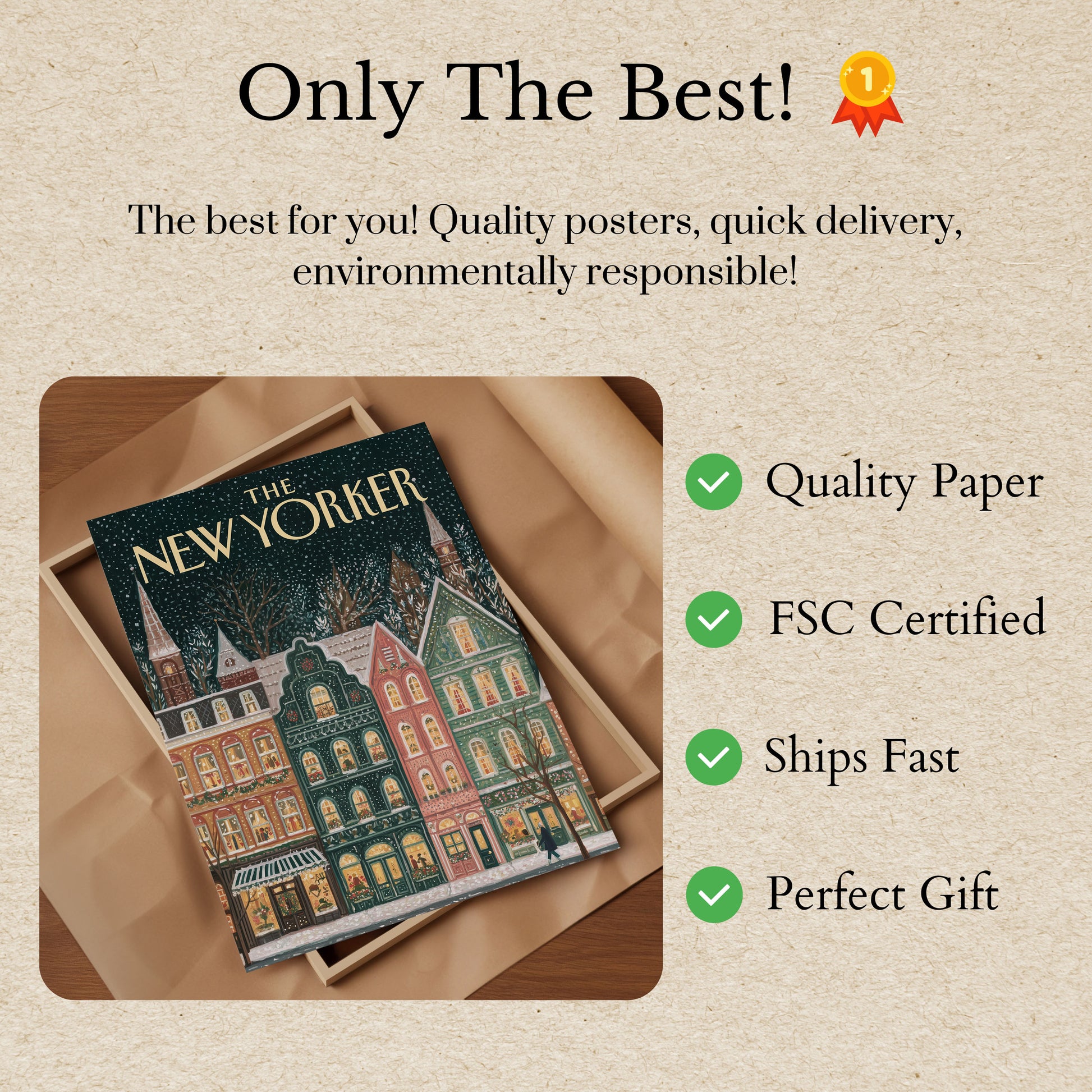Step into a magical winter scene straight from The New Yorker's iconic cover art, featuring a charming snow-covered streetscape of elegant townhouses and storefronts. Each building glows warmly with golden windows, creating a cozy, inviting atmosphere against a deep emerald night sky filled with delicate snowflakes. The intricate architectural details and soft color palette capture the enchanting spirit of a festive urban winter evening, inviting viewers to pause and appreciate the quiet beauty of city life.