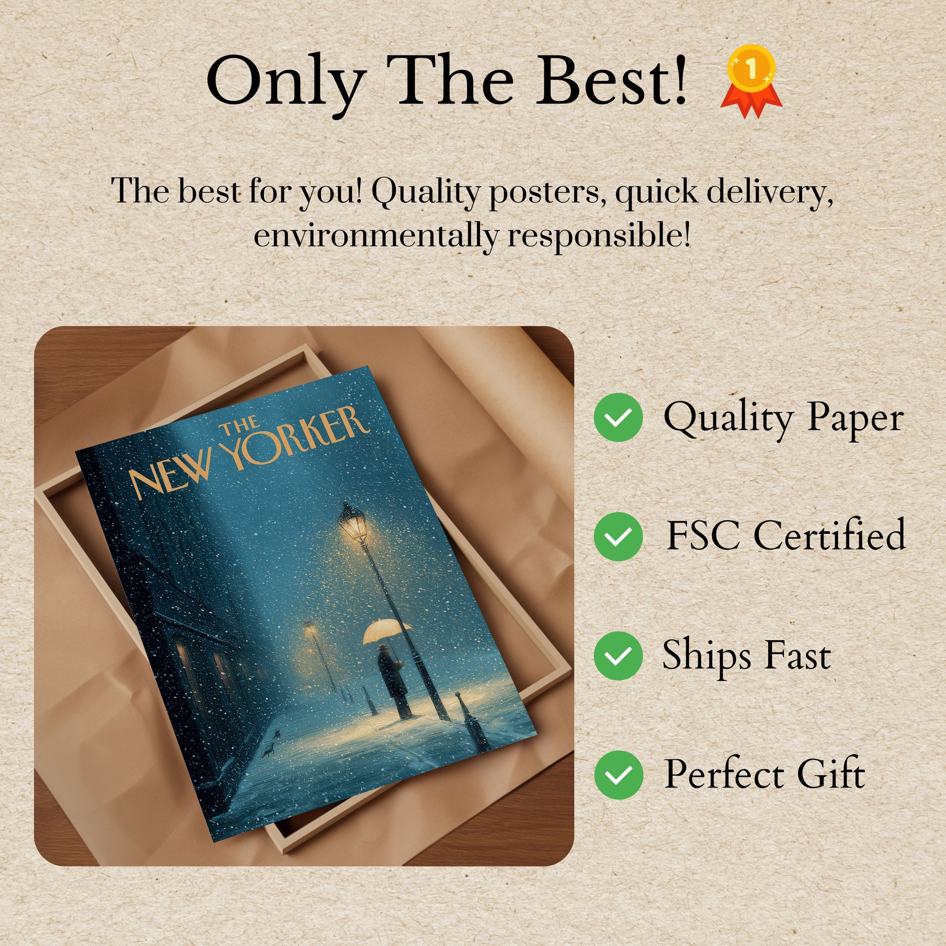 Step into a mesmerizing winter scene from The New Yorker magazine, where snowflakes dance around a solitary figure beneath warm street lamps. This evocative illustration captures the quiet magic of a city street at night, with a lone individual holding an illuminated umbrella standing amidst falling snow and golden light. The deep blue tones and soft luminescence create a dreamlike atmosphere that speaks to urban solitude and beauty.
