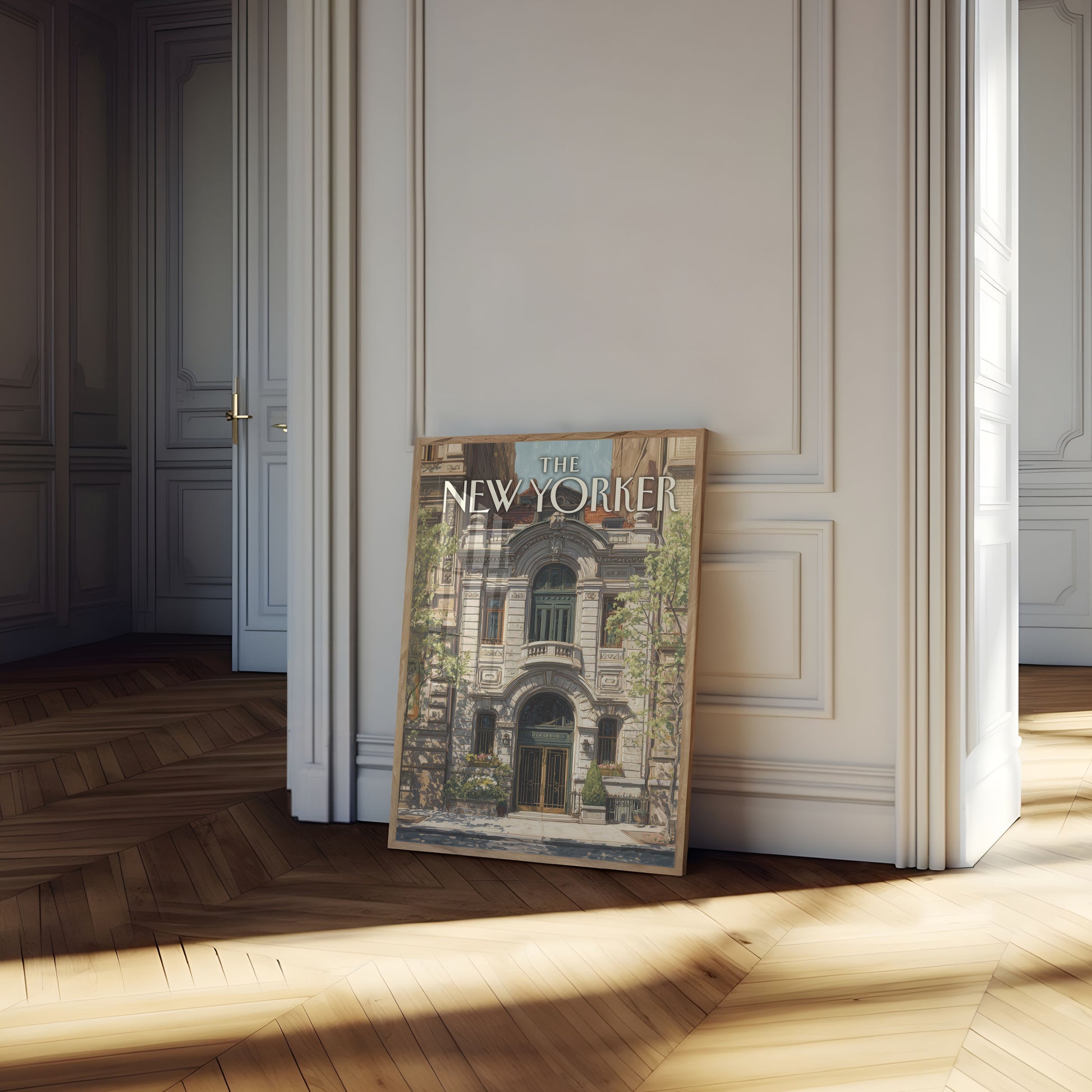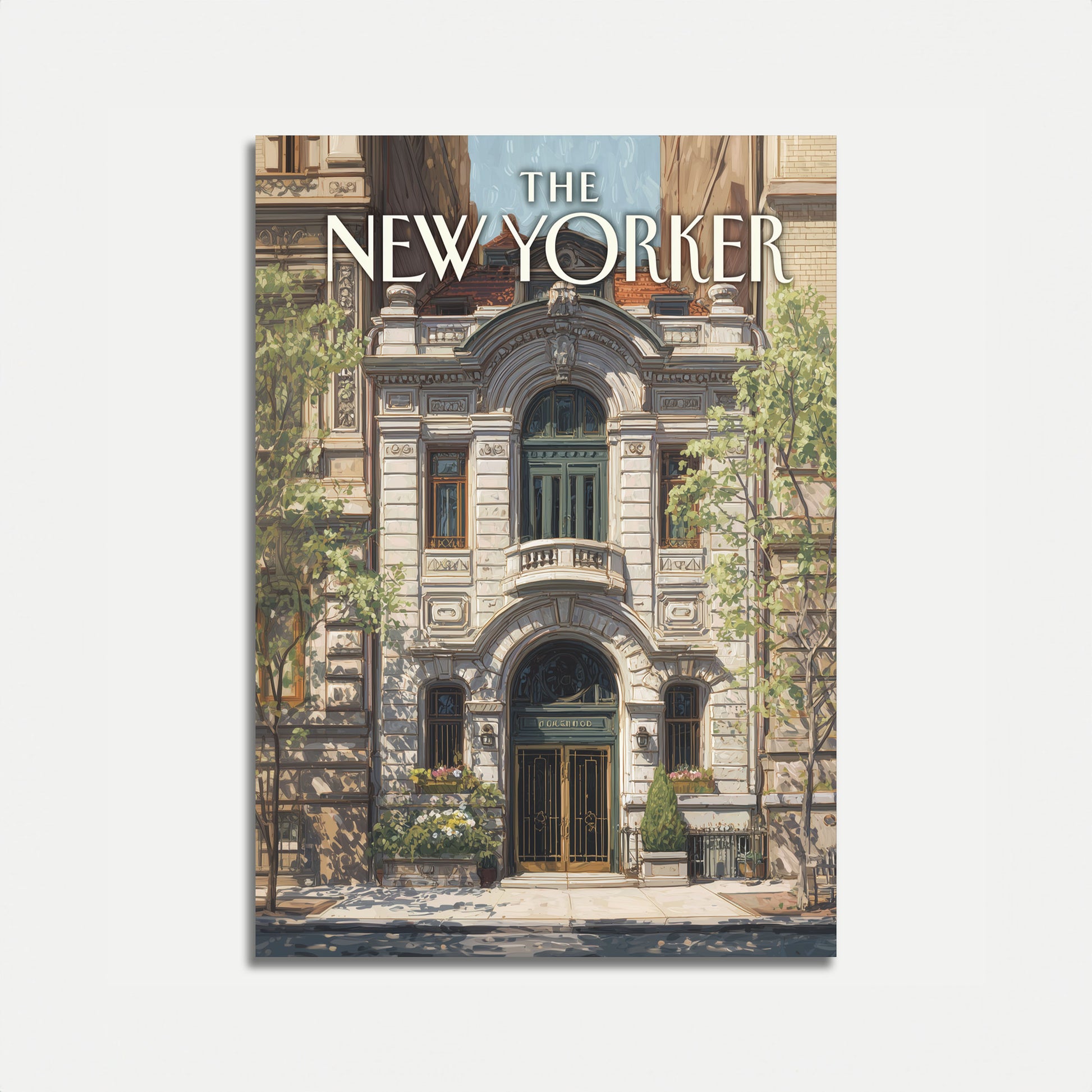 Step into the elegant world of vintage New York architecture with this stunning illustration of a classic brownstone building. The poster captures the intricate details of a magnificent urban facade, complete with ornate arched windows, delicate balconies, and lush surrounding greenery. Soft shadows and warm tones bring this architectural gem to life, creating a timeless piece that celebrates the architectural beauty of The New Yorker magazine's iconic style.