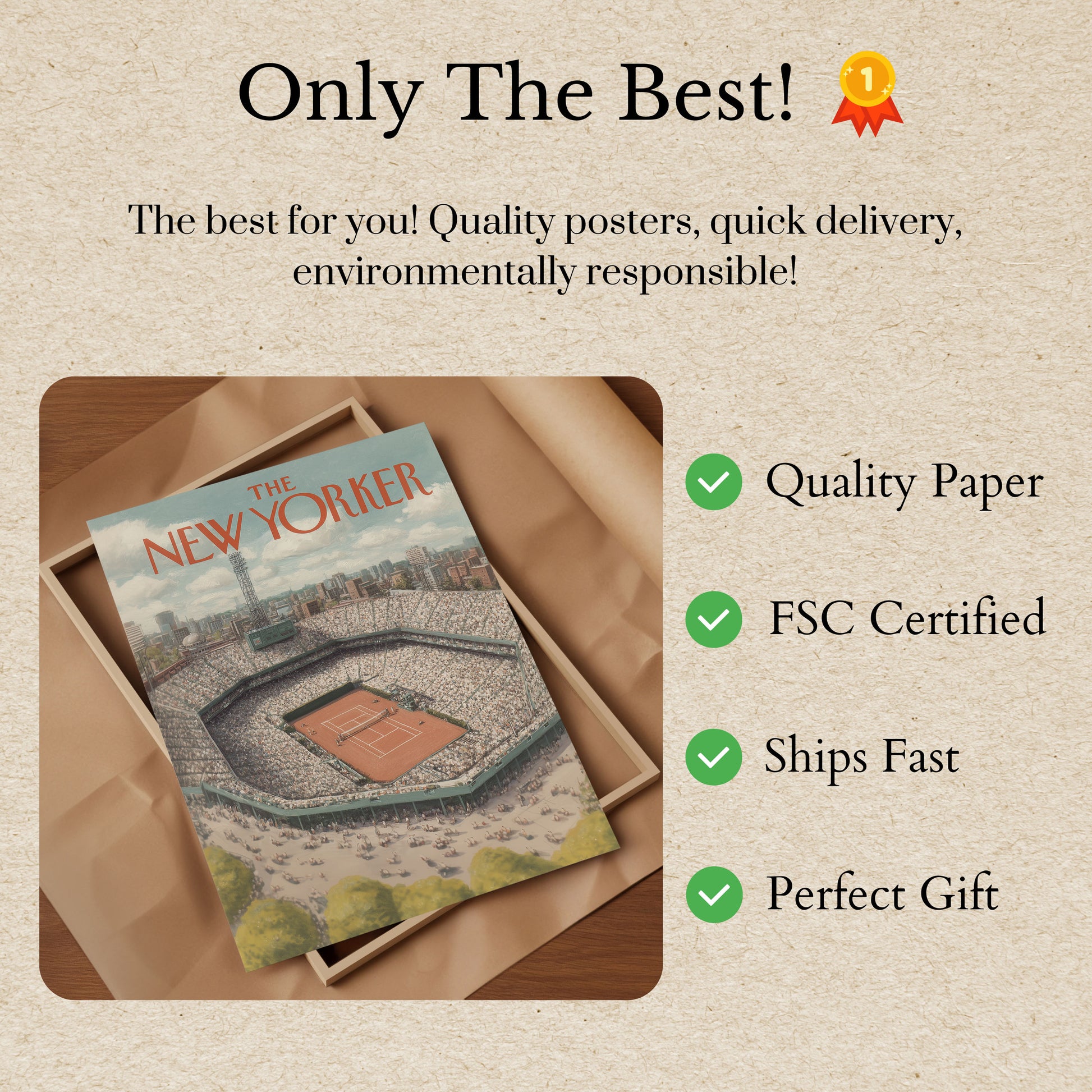 Experience the electric atmosphere of a packed tennis stadium in this stunning illustration from The New Yorker. The poster captures a breathtaking aerial view of a massive tennis court nestled within a sea of spectators, with the city skyline stretching out behind the stadium. Soft cloud-filled skies and a warm color palette bring this iconic sporting moment to vibrant life.