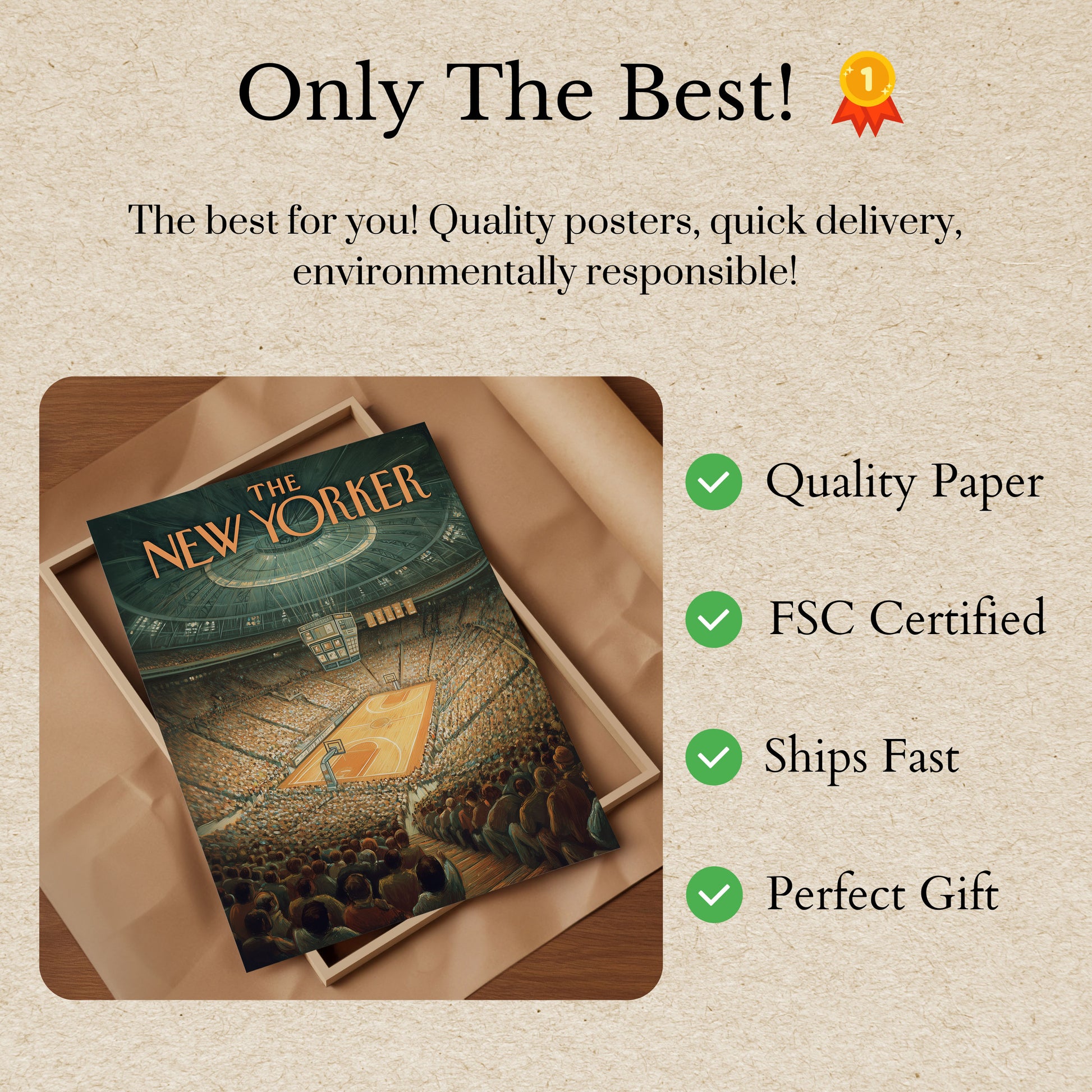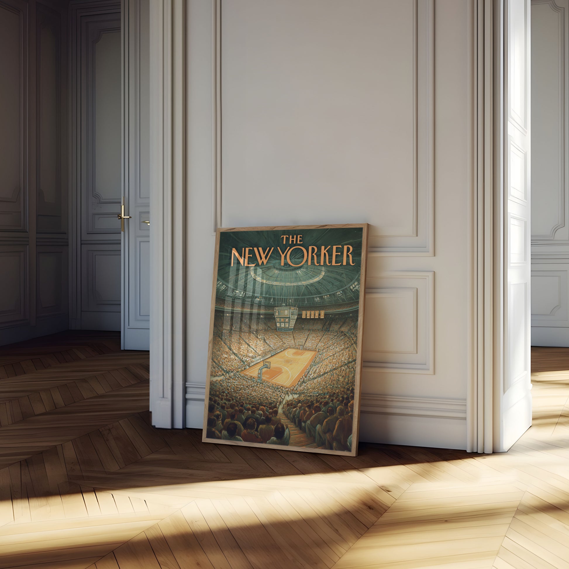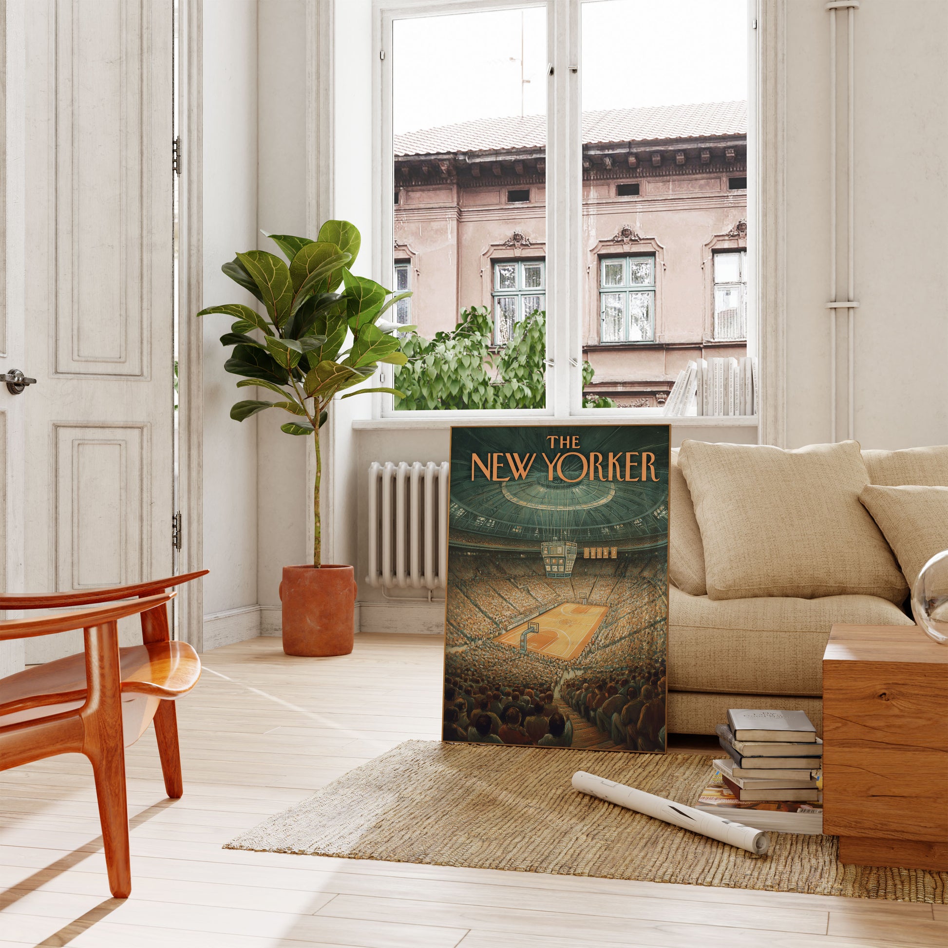 Experience the electric atmosphere of a sold-out basketball game through this stunning New Yorker magazine cover illustration. The image captures a massive arena filled to the brim with spectators, converging around a gleaming hardwood court beneath an intricate domed ceiling. Warm golden and green tones create a sense of excitement and anticipation, drawing viewers into the heart of the sporting spectacle.
