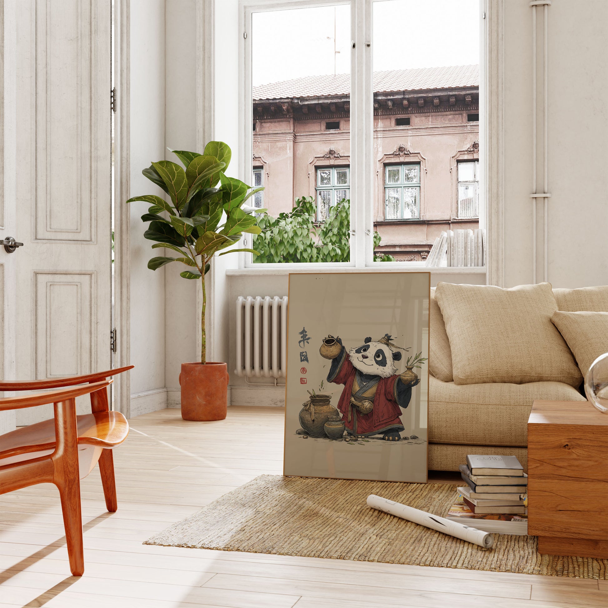 Step into a charming world of traditional Asian artistry with this delightful illustration of a playful panda preparing tea. Dressed in an elegant red and gray robe, the panda carefully handles clay pots and tea vessels, capturing a serene moment of cultural craftsmanship. The soft, neutral background and detailed brushwork bring this anthropomorphic character to life with whimsy and grace.