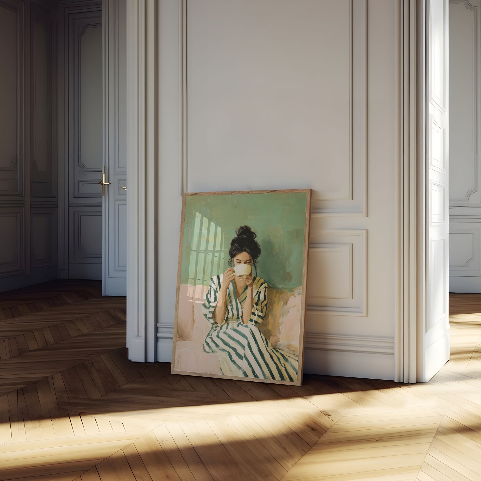 A serene painting capturing a woman in a green and white striped dress, her hair elegantly gathered in a messy bun, enjoying a quiet moment with a soft white coffee cup. The muted sage green background creates a tranquil atmosphere, while the soft pink sofa adds warmth and comfort to the scene. This artistic representation invites viewers to pause and appreciate the simple, intimate moments of daily life.