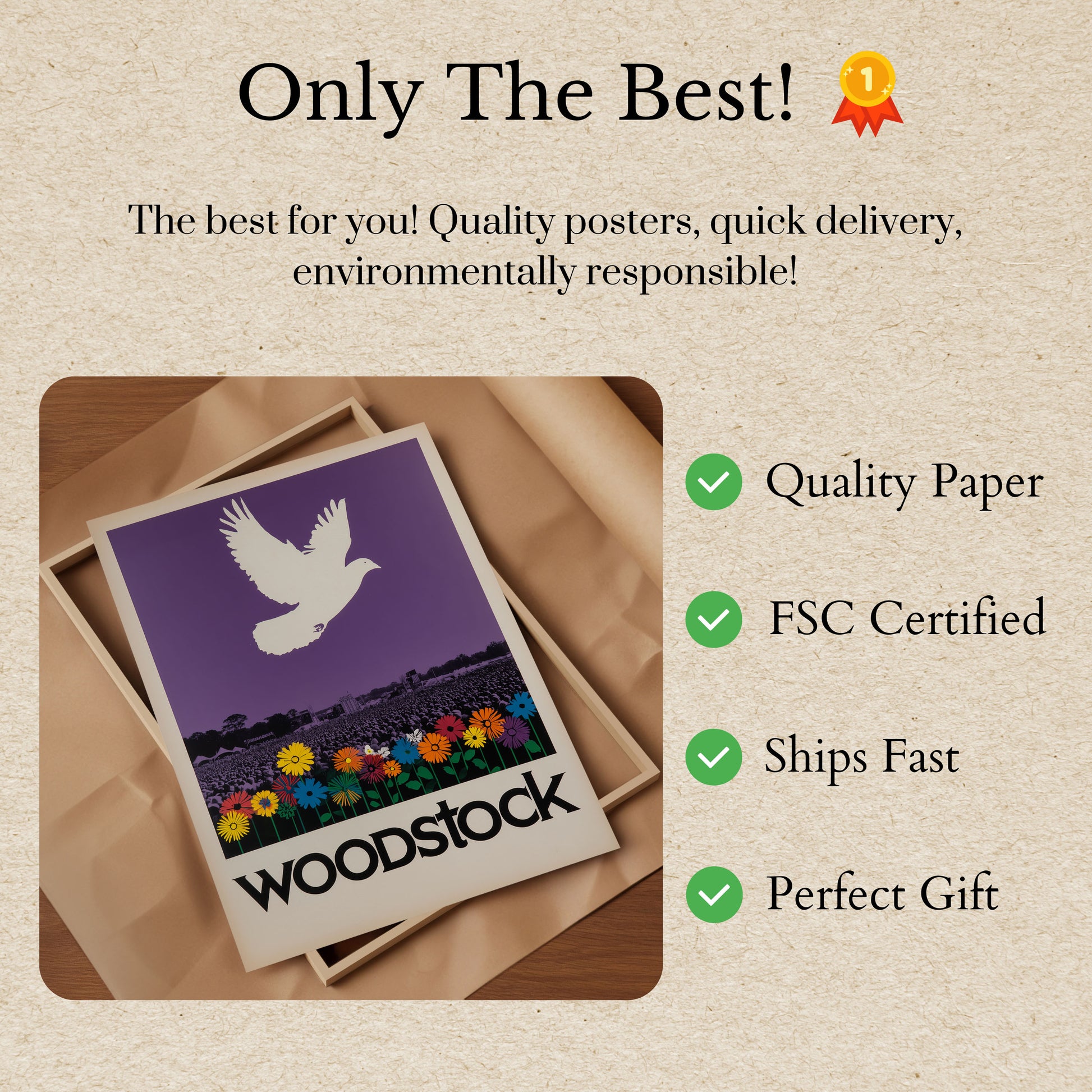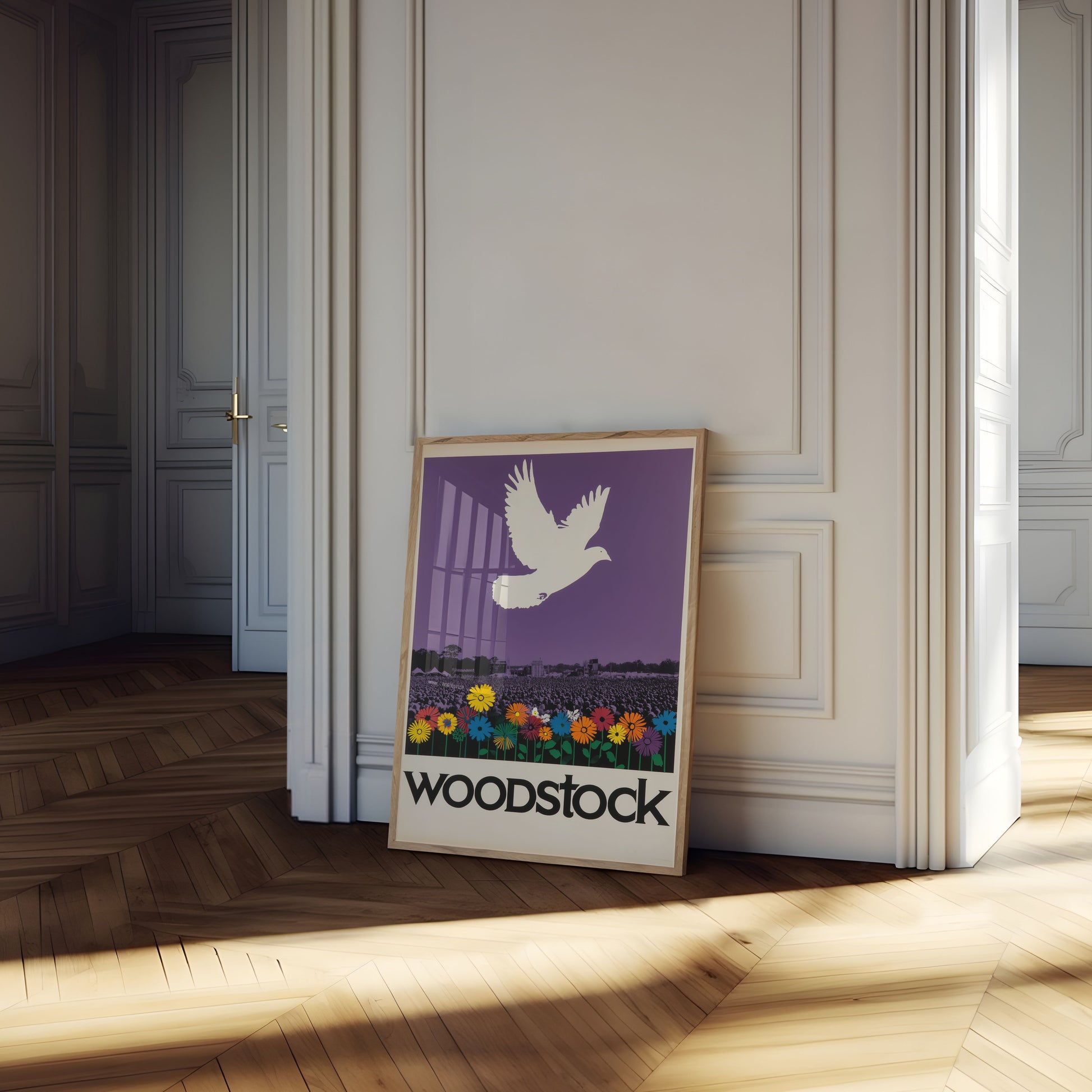 Dive into the iconic spirit of the 1960s with this vibrant Woodstock poster featuring a majestic white dove soaring above a sea of music lovers. The deep purple background and colorful flower border capture the essence of peace, love, and musical unity that defined the legendary 1969 festival. Bold, nostalgic, and visually striking, this artwork embodies the transformative cultural moment that brought generations together through music and hope.