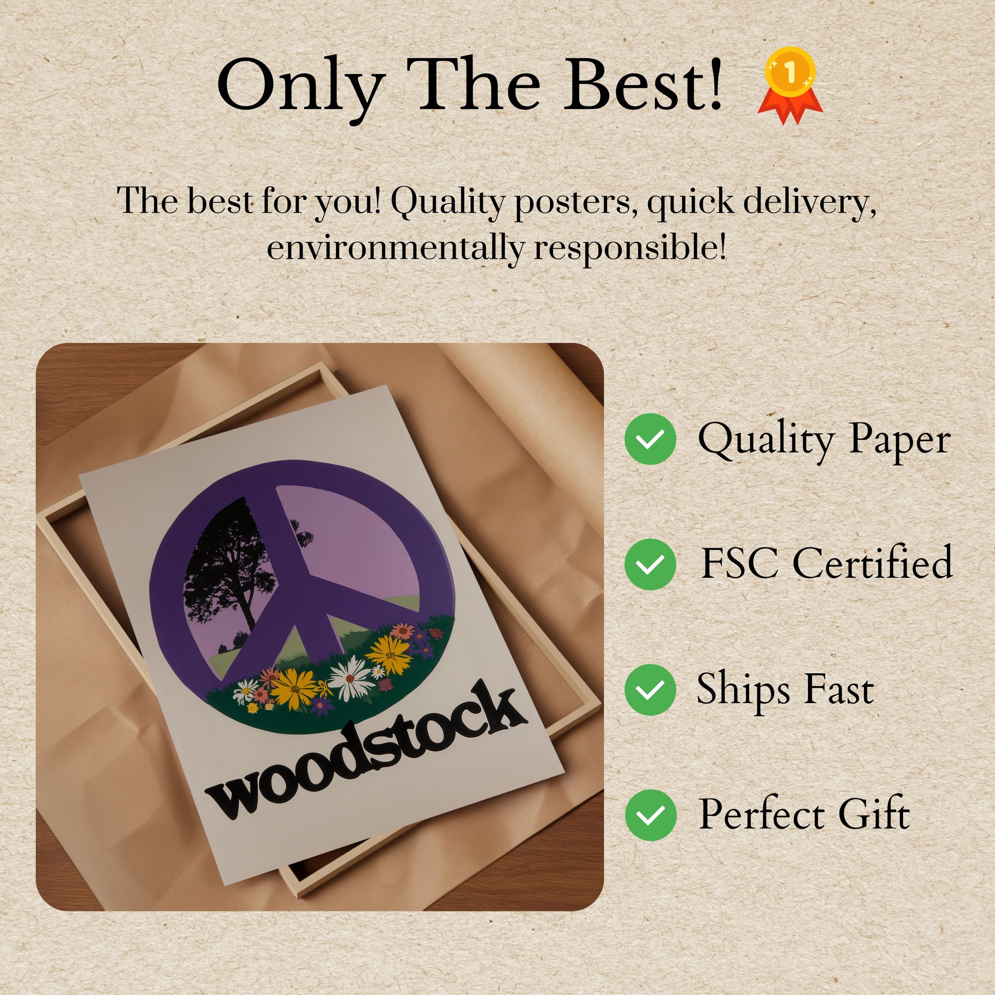 Immerse yourself in the iconic spirit of the 1960s with this stunning Woodstock poster featuring a vibrant peace symbol nestled in a dreamy landscape. Lush green grass, a solitary tree, and a burst of colorful wildflowers frame the classic purple peace sign, capturing the essence of music, love, and harmony that defined the legendary festival. This vintage-inspired artwork beautifully encapsulates the cultural revolution and musical magic of Woodstock.