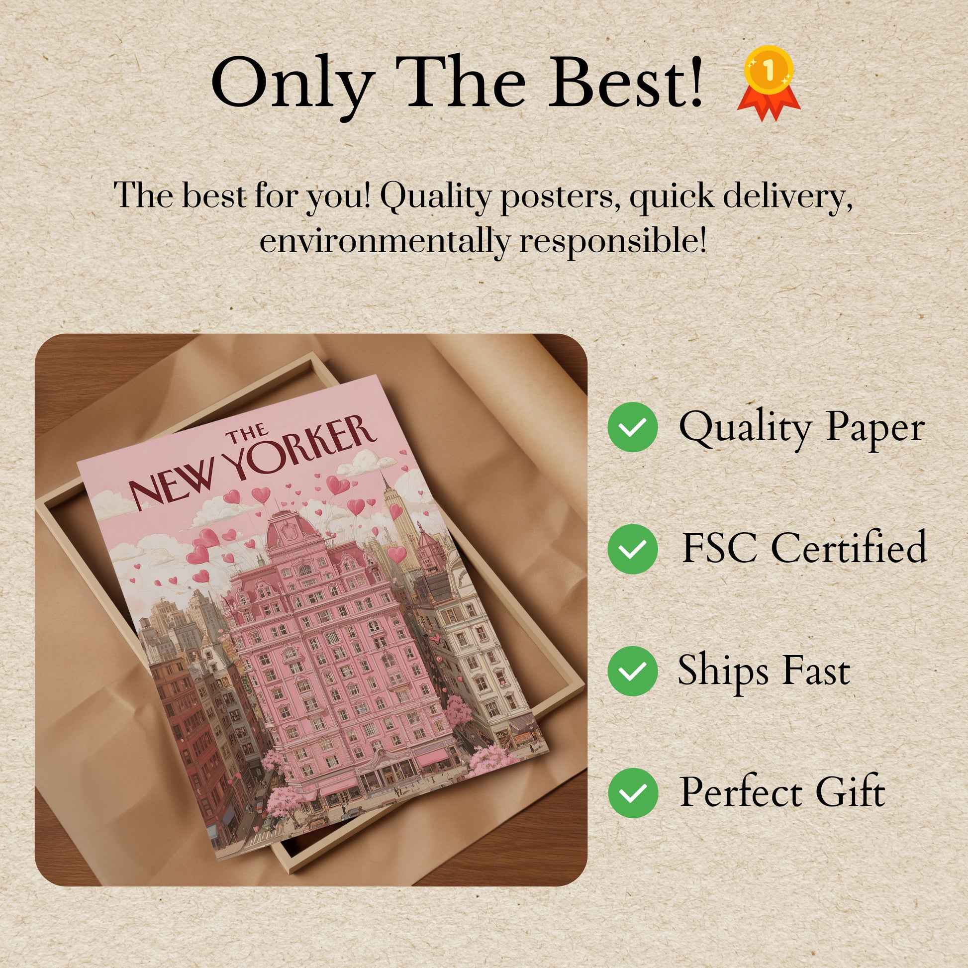 Immerse yourself in the enchanting world of this New Yorker magazine-inspired poster, where a stunning pink building takes center stage amidst the iconic NYC skyline. Floating heart-shaped balloons dance around the architectural marvel, creating a dreamy, romantic atmosphere that captures the magic of the city. Soft pink hues, delicate clouds, and the Empire State Building in the background transform this artwork into a love letter to New York.