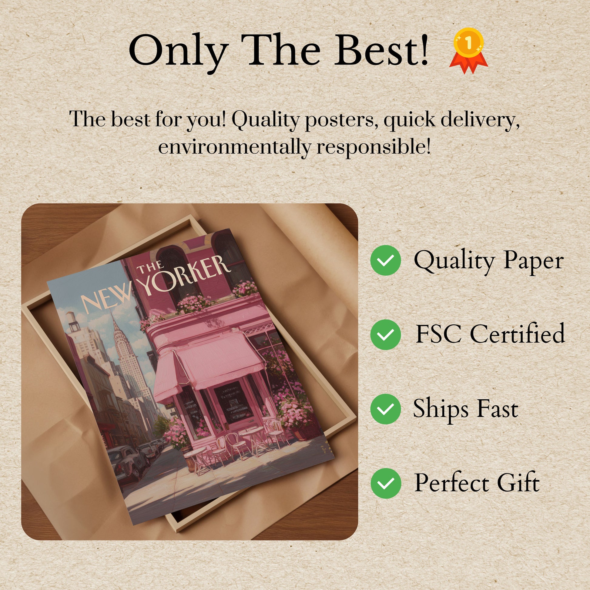Step into a dreamy New York City scene with this enchanting illustration featuring a charming pink cafe nestled alongside the iconic Chrysler Building. Soft pastel hues and delicate floral window boxes create a romantic urban landscape that captures the magical essence of city life. Every detail, from the vintage cars to the sunlit sidewalk, evokes a sense of nostalgic elegance and New York charm.