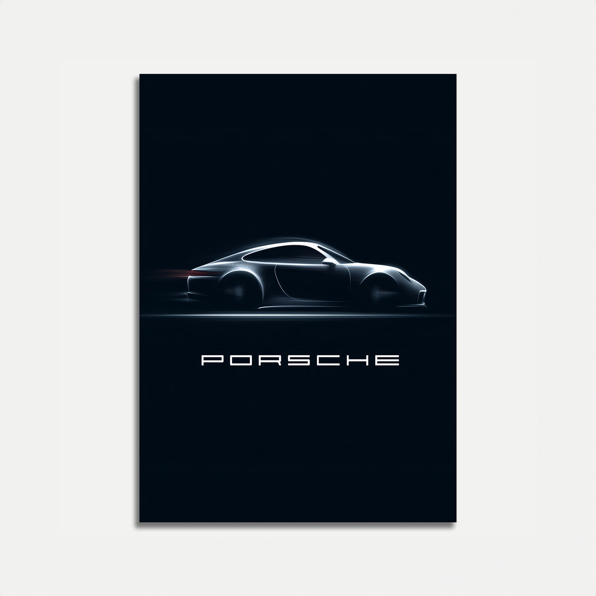 Immerse yourself in the sleek elegance of automotive design with this stunning Porsche poster. Captured in a mesmerizing digital wireframe style, the car's dynamic silhouette emerges from a deep black background, radiating motion and technological sophistication. The ethereal white lines trace the iconic curves of the sports car, creating a visual symphony of speed and precision.