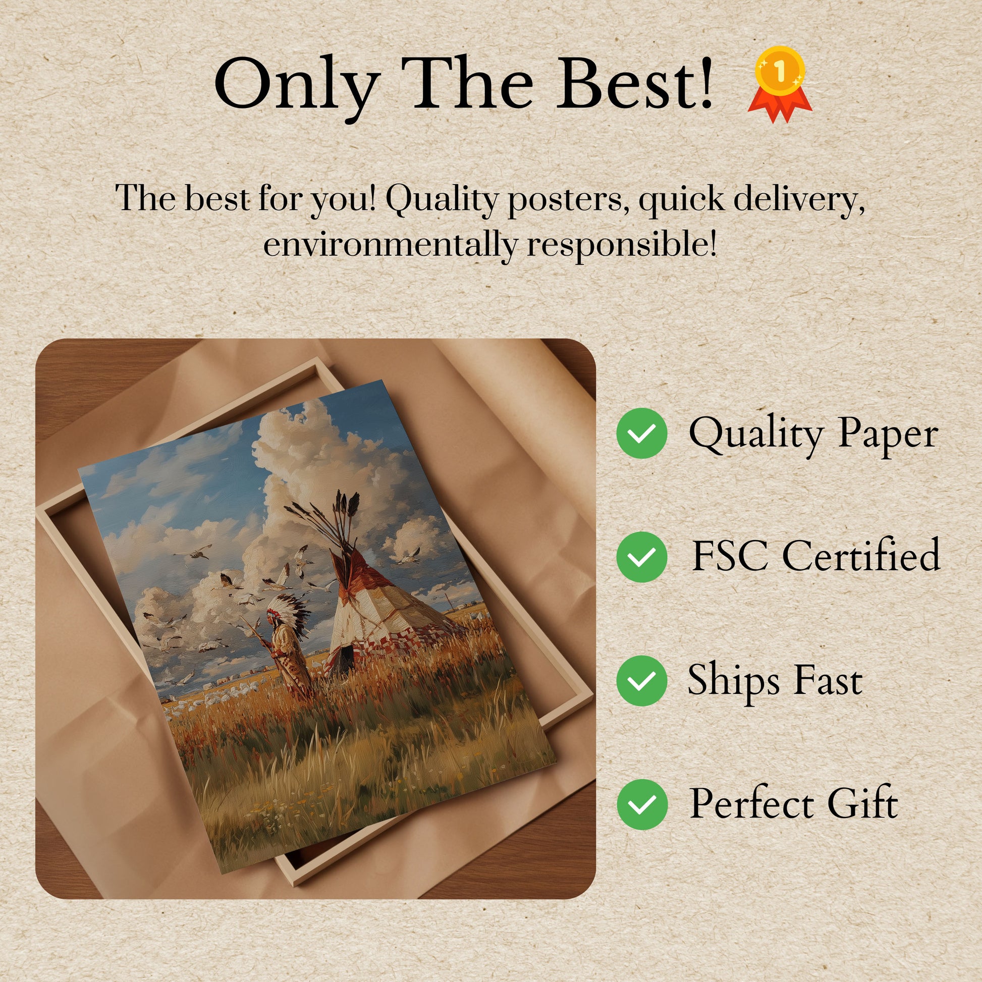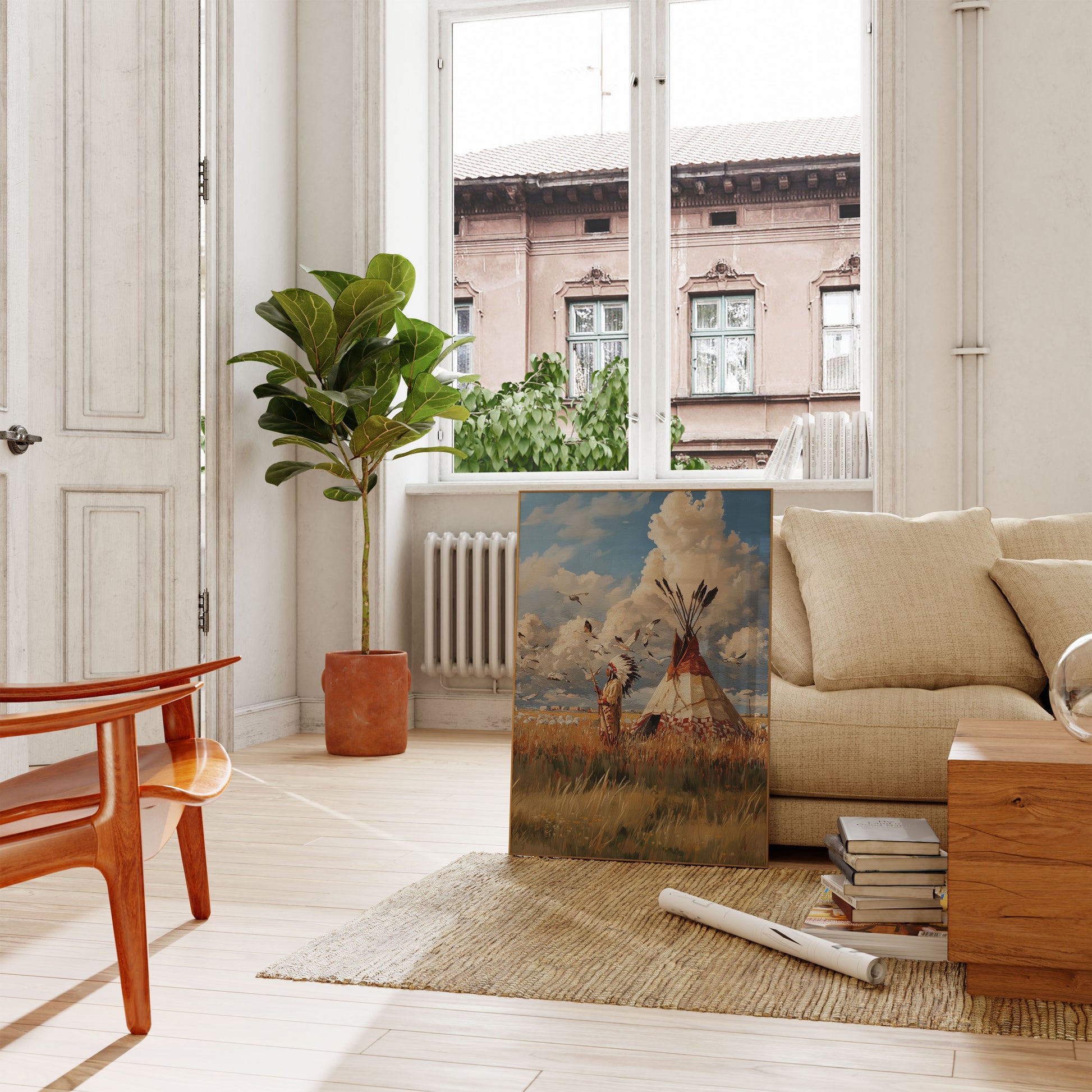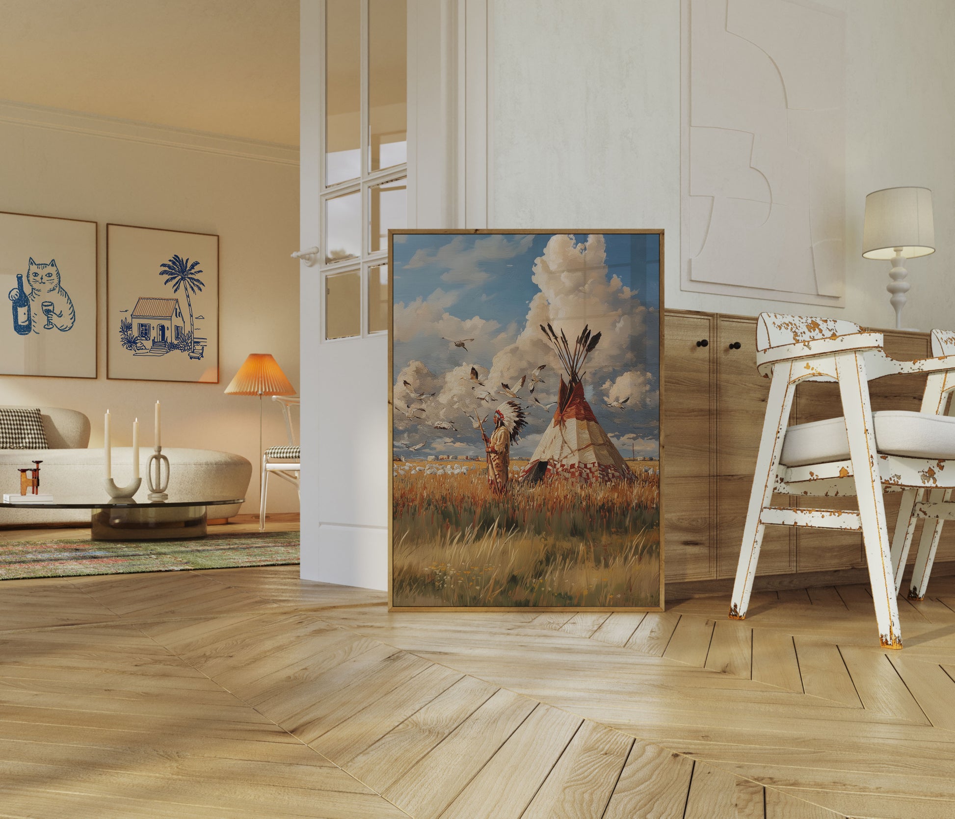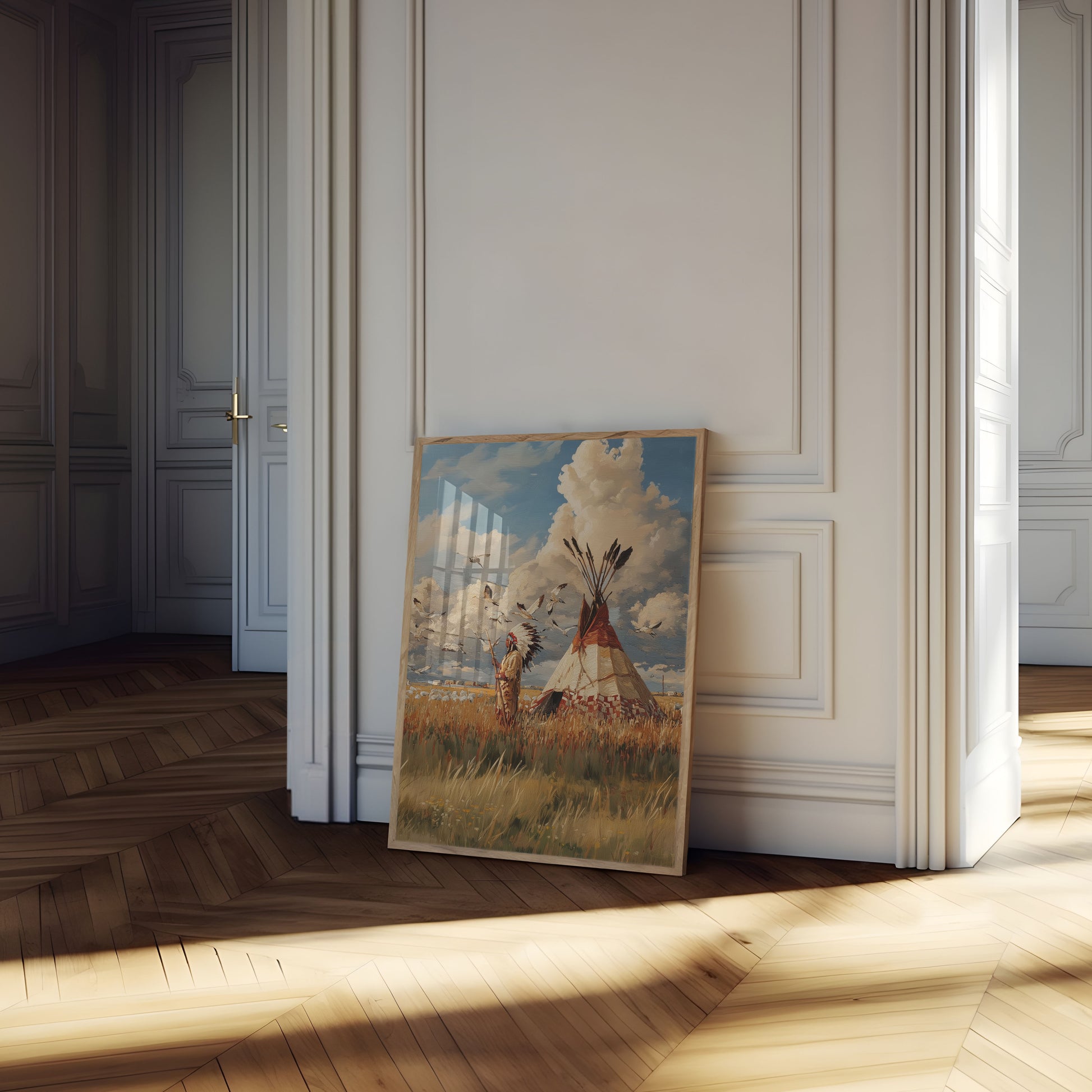Immerse yourself in the rich cultural landscape of the Great Plains with this stunning art print capturing a Native American chief in traditional headdress standing beside a vibrant teepee. Dramatic cloudscapes and a flock of birds swirl across a golden grassland, creating a powerful scene that speaks to the deep connection between indigenous people and the natural world. The warm earth tones and intricate details transport you to a moment of profound cultural significance.