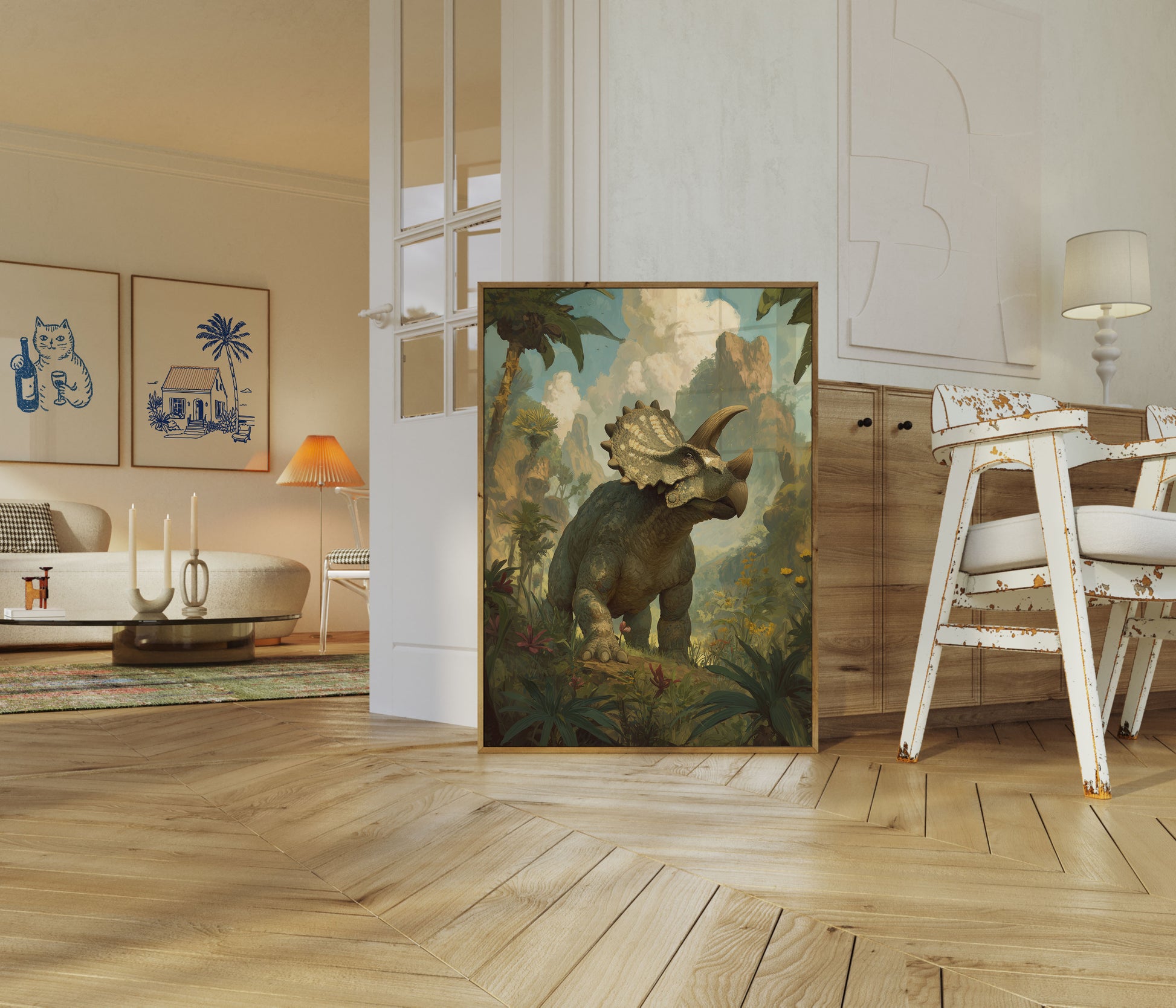 Step into a mesmerizing prehistoric world with this stunning dinosaur art print featuring a majestic triceratops standing amidst lush tropical vegetation and dramatic rock formations. The artwork captures the raw power and ancient beauty of this iconic herbivore, set against a dreamy landscape of soft clouds and golden-green vegetation that transports you millions of years into Earth's distant past. Rich, painterly details and a warm color palette bring this ancient scene to vibrant, breathtaking life.
