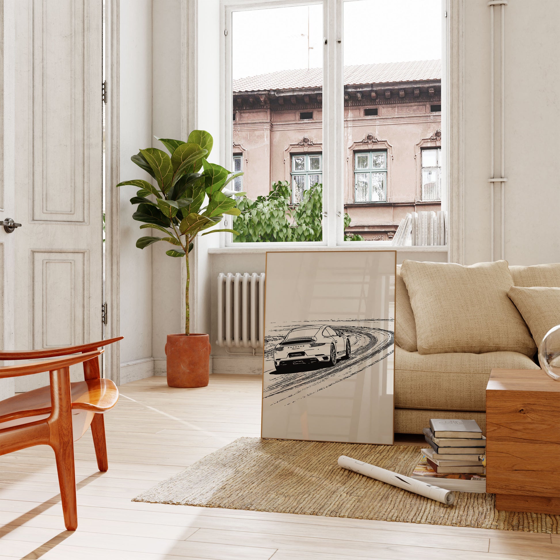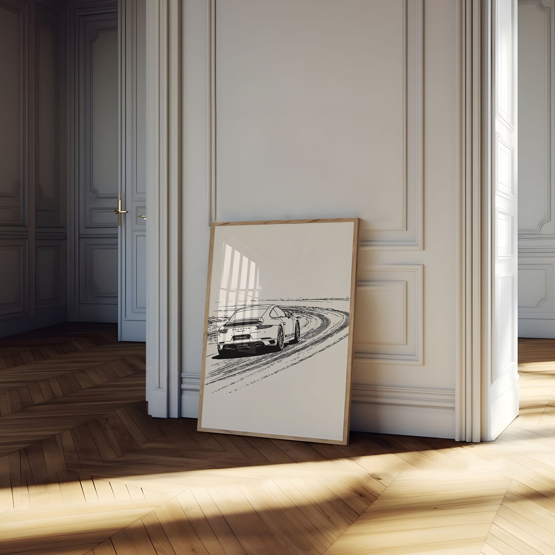 Capture the pure essence of automotive elegance with this dynamic black and white illustration of a Porsche sports car carving a dramatic curve. The minimalist artwork beautifully captures the sleek lines and powerful stance of the vehicle, emphasizing motion and speed through bold, sweeping lines and high-contrast design. A must-have for automotive enthusiasts and design lovers who appreciate the artistry of performance engineering.