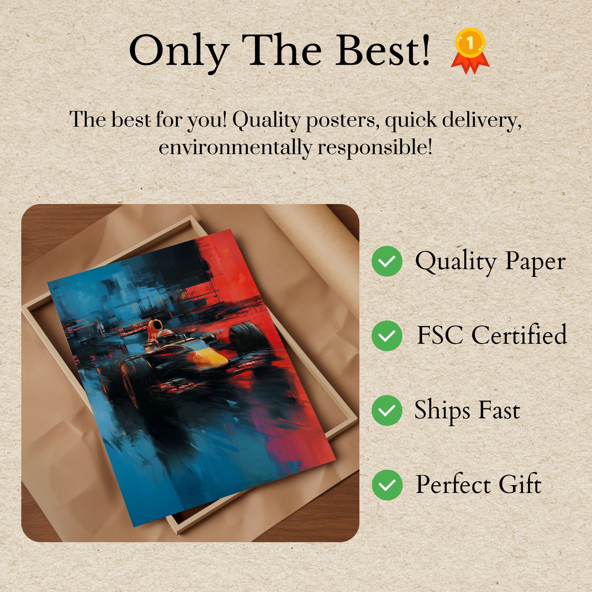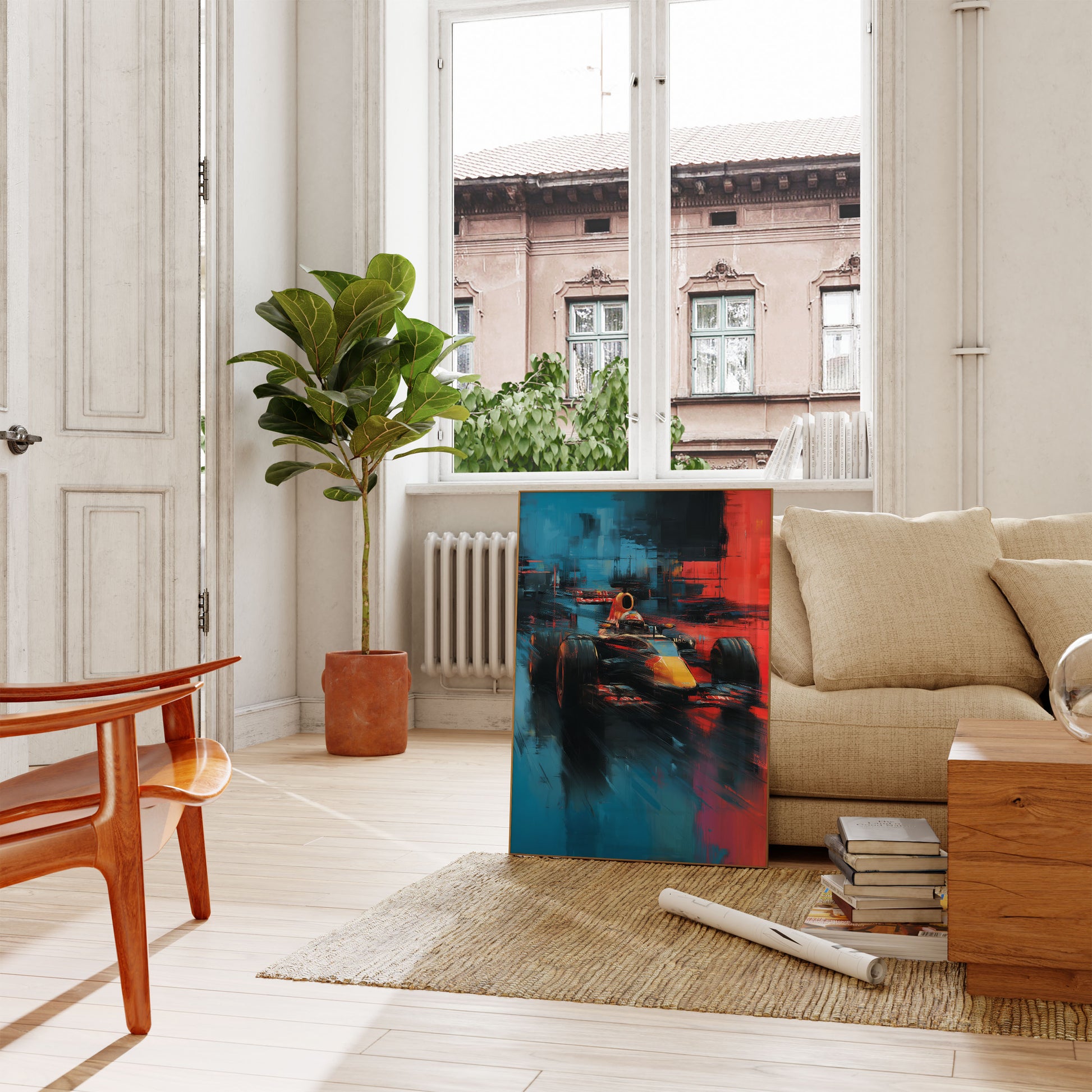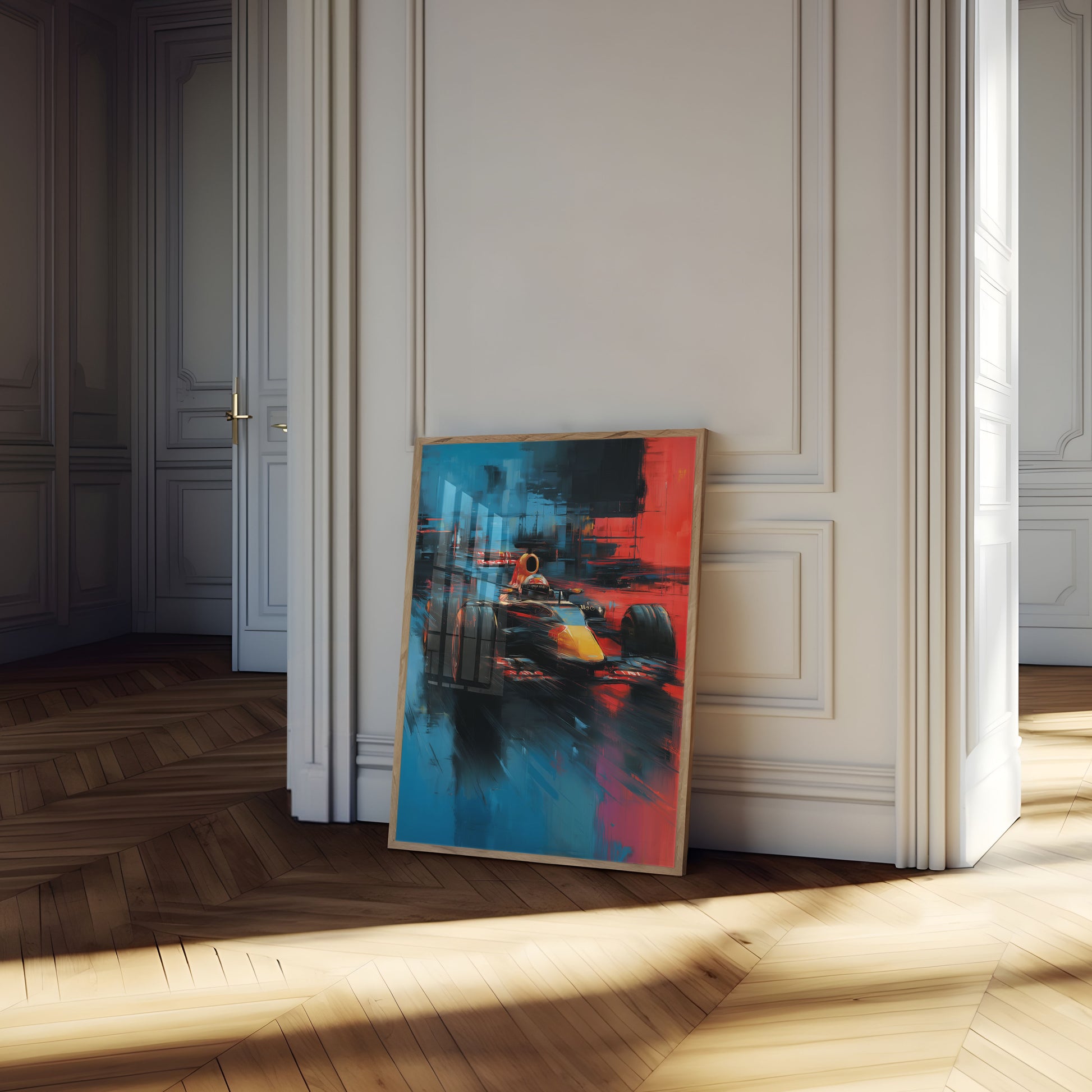 Experience the explosive energy of Formula One racing captured in this electrifying art piece. The dynamic artwork blends intense blue and red hues, creating a sense of raw speed and motion as the Red Bull racing car tears through an abstract, blurred landscape. Every brushstroke pulses with adrenaline, transforming a motorsport moment into a stunning visual symphony of power and precision.