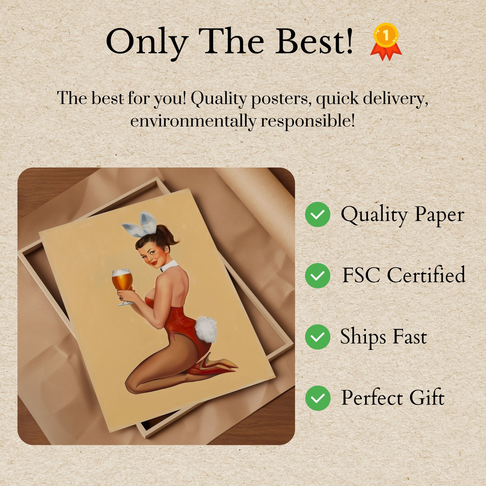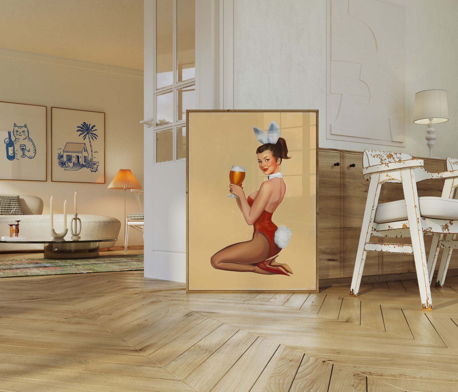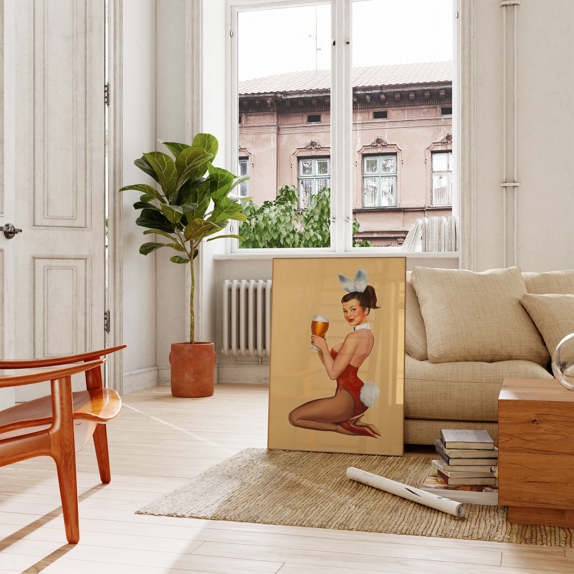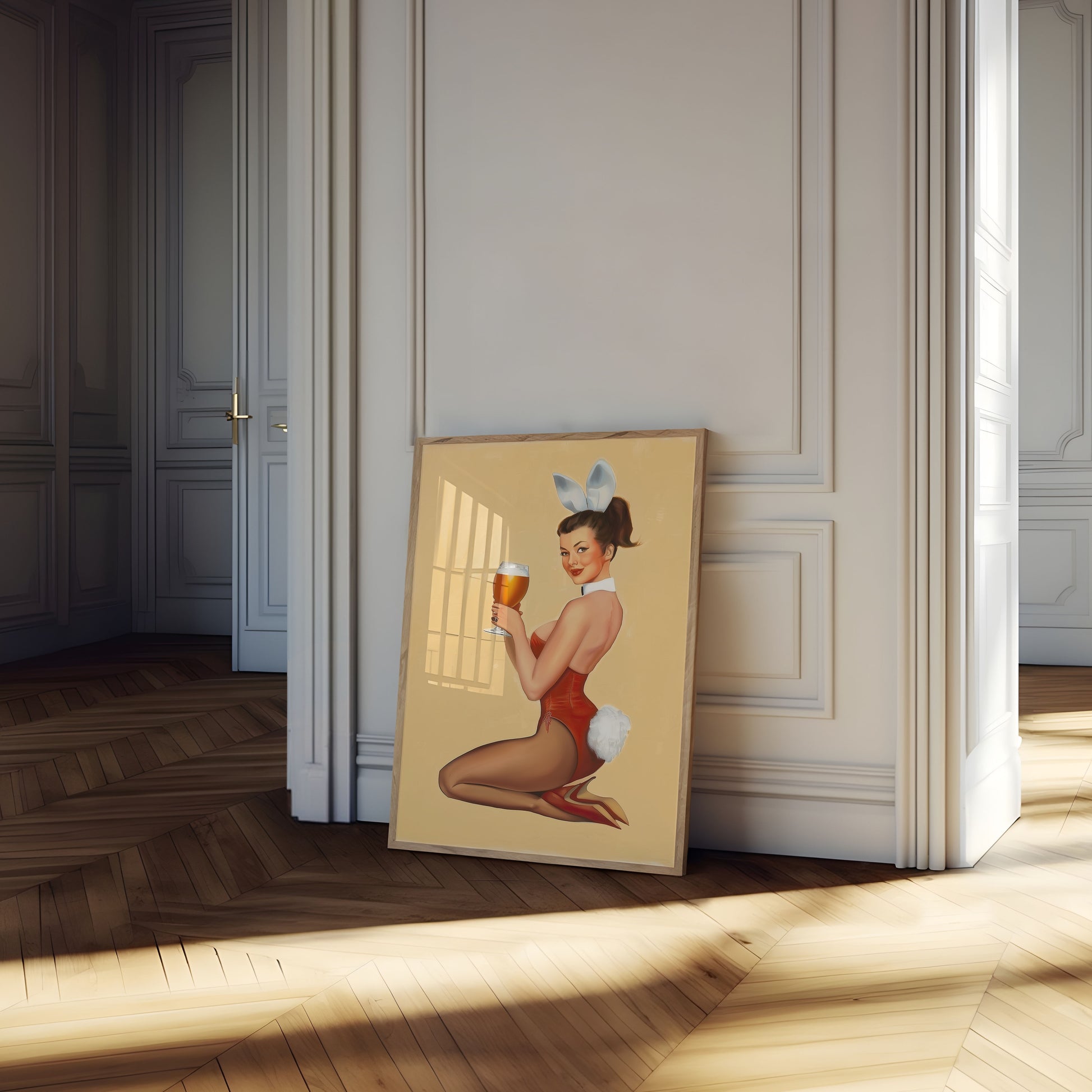 Step into the golden age of pin-up art with this vintage-inspired illustration featuring a charming bunny-costumed figure delicately holding a gleaming beer glass. The warm amber background and stylized pose capture the playful sophistication of mid-20th century graphic design, blending cheeky charm with artistic elegance. Rich red accents and meticulously detailed styling create a nostalgic celebration of classic American illustration.