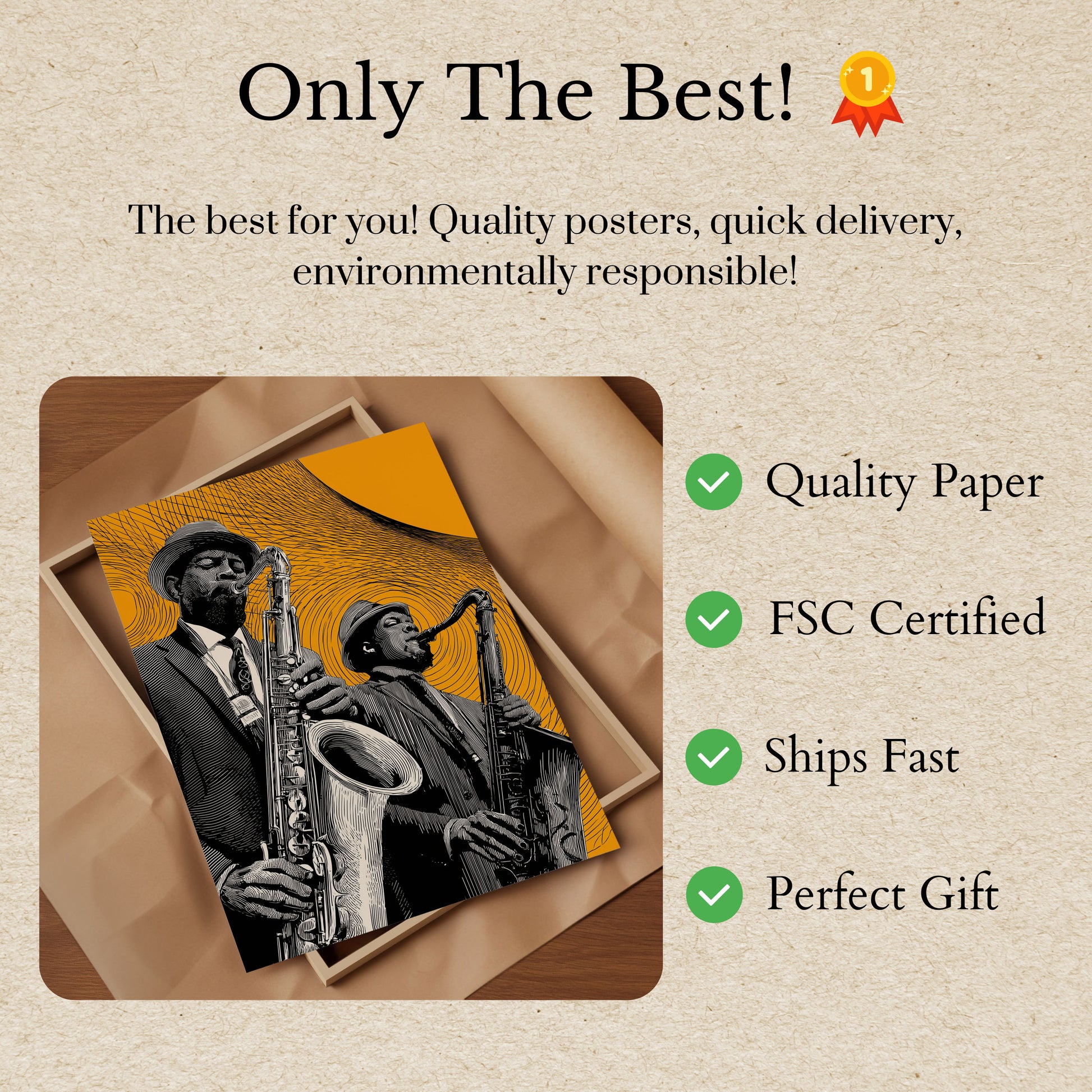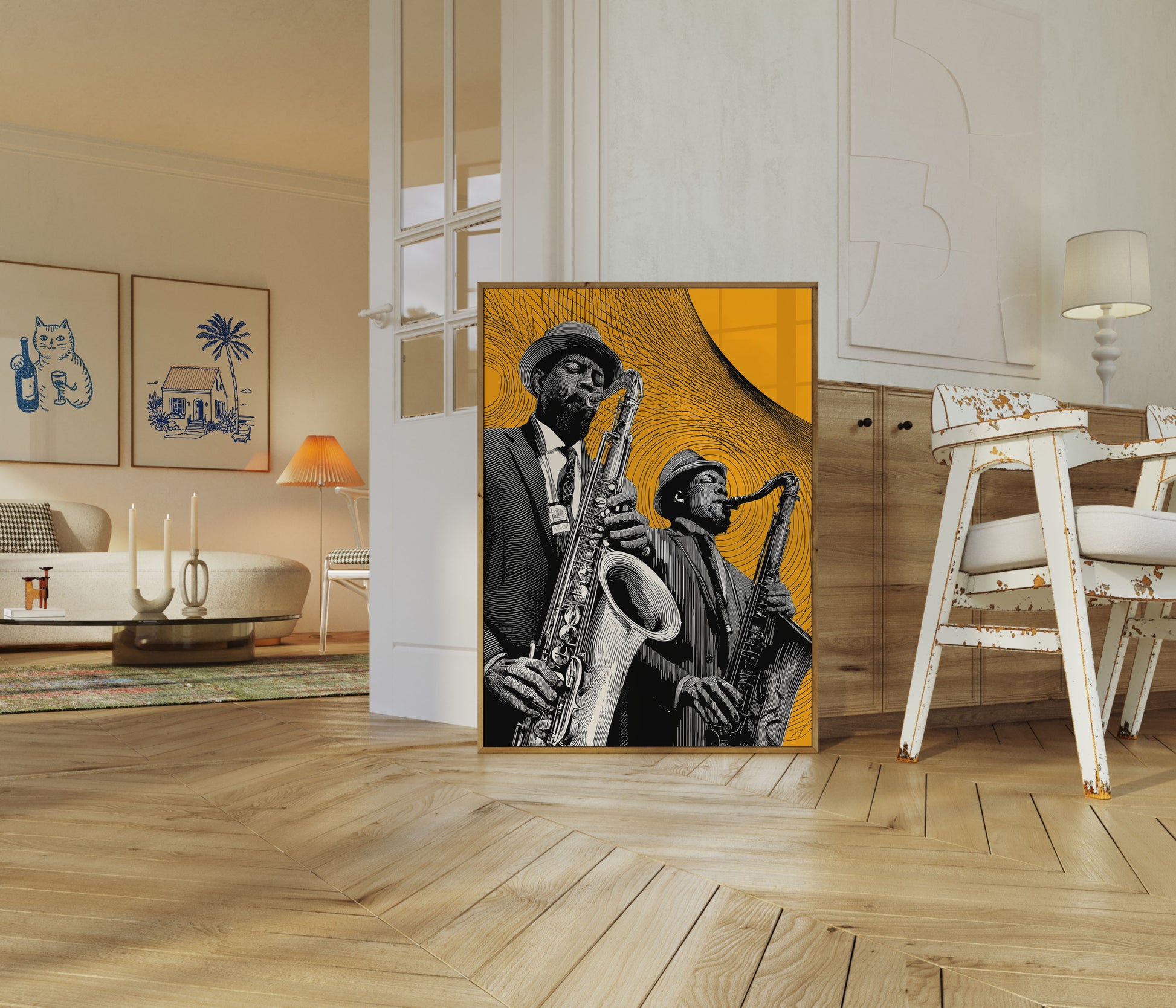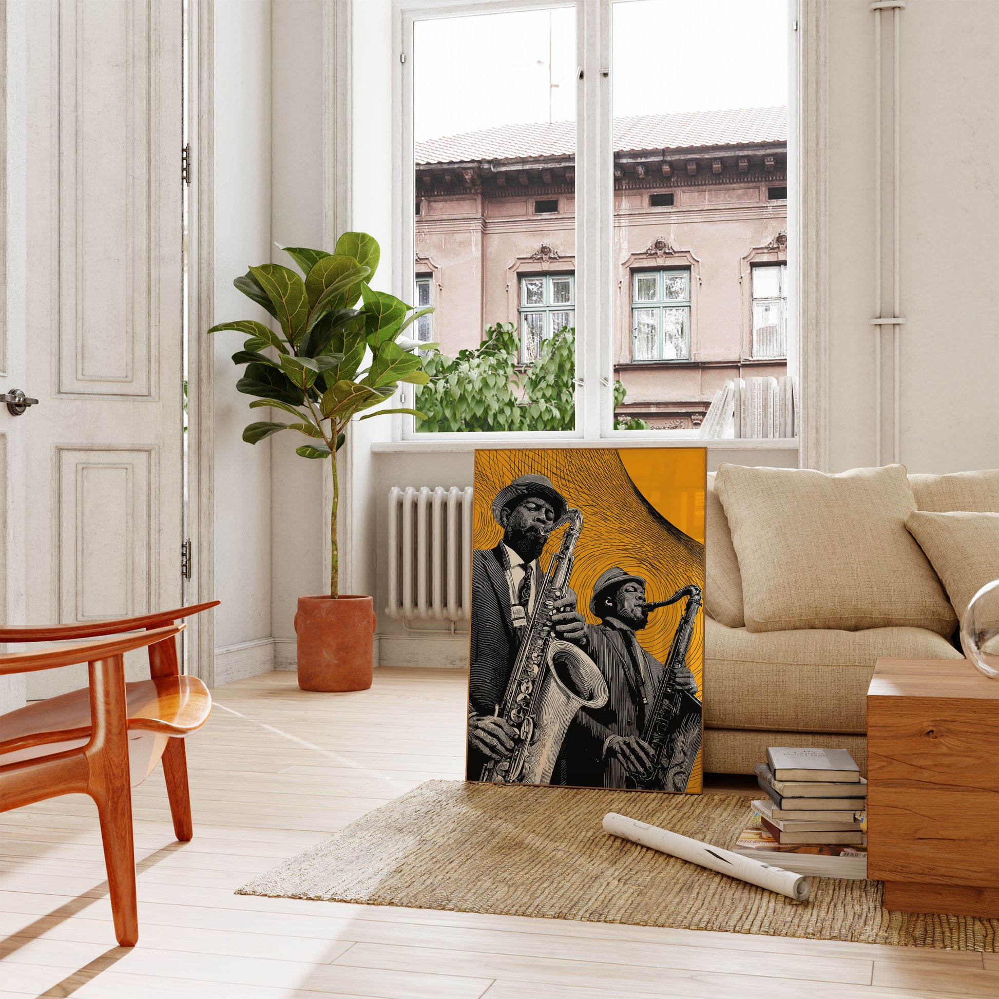 Immerse yourself in the electrifying world of jazz with this stunning graphic art print. Two saxophone musicians are captured in a mesmerizing black and white illustration, set against a vibrant golden-orange background with swirling circular patterns. The vintage-inspired etching style brings raw emotion and musical passion to life, creating a powerful visual symphony that celebrates the spirit of jazz.
