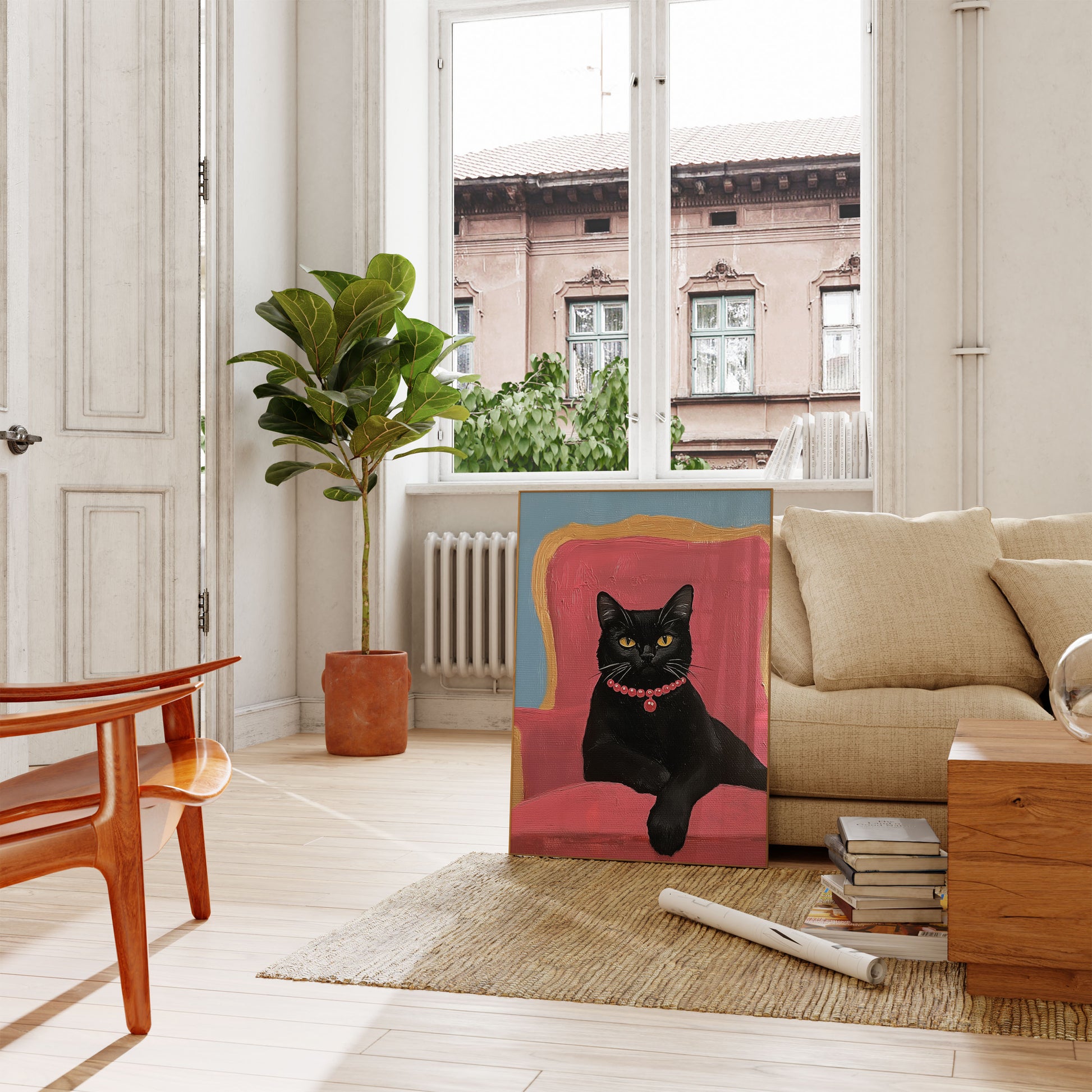 Step into a world of feline sophistication with this stunning portrait of a sleek black cat draped in a luxurious red pearl necklace. Perched regally on a pink and gold vintage chair, the cat's piercing yellow eyes command attention against a soft blue background. This artwork captures the essence of feline grace and mystery, blending playful charm with elegant refinement.